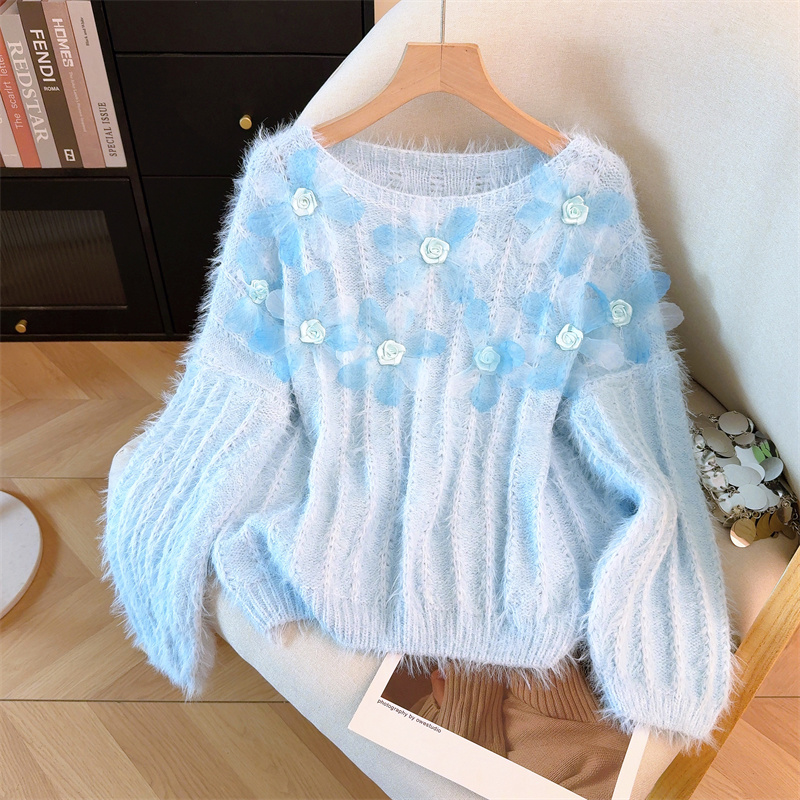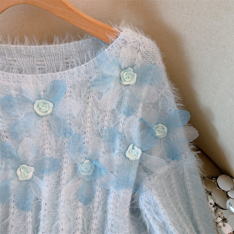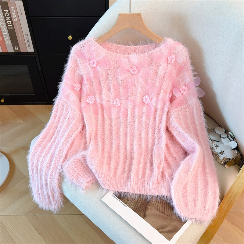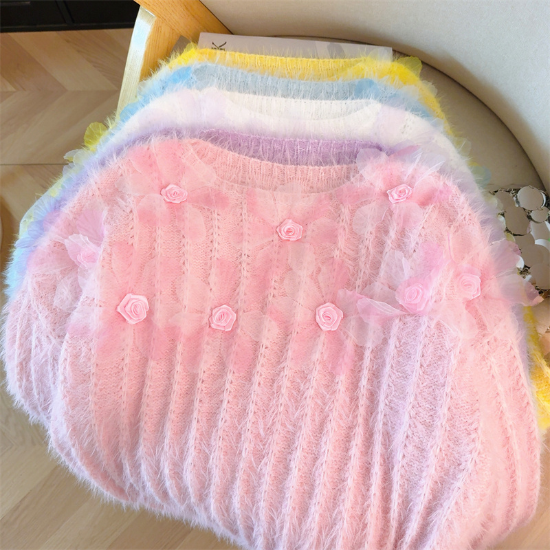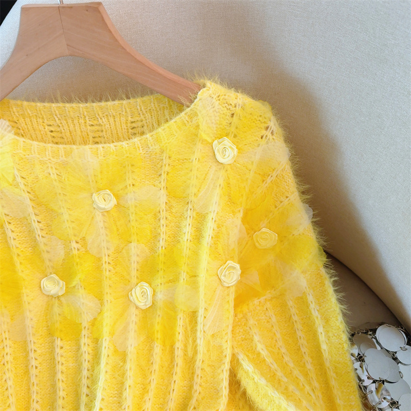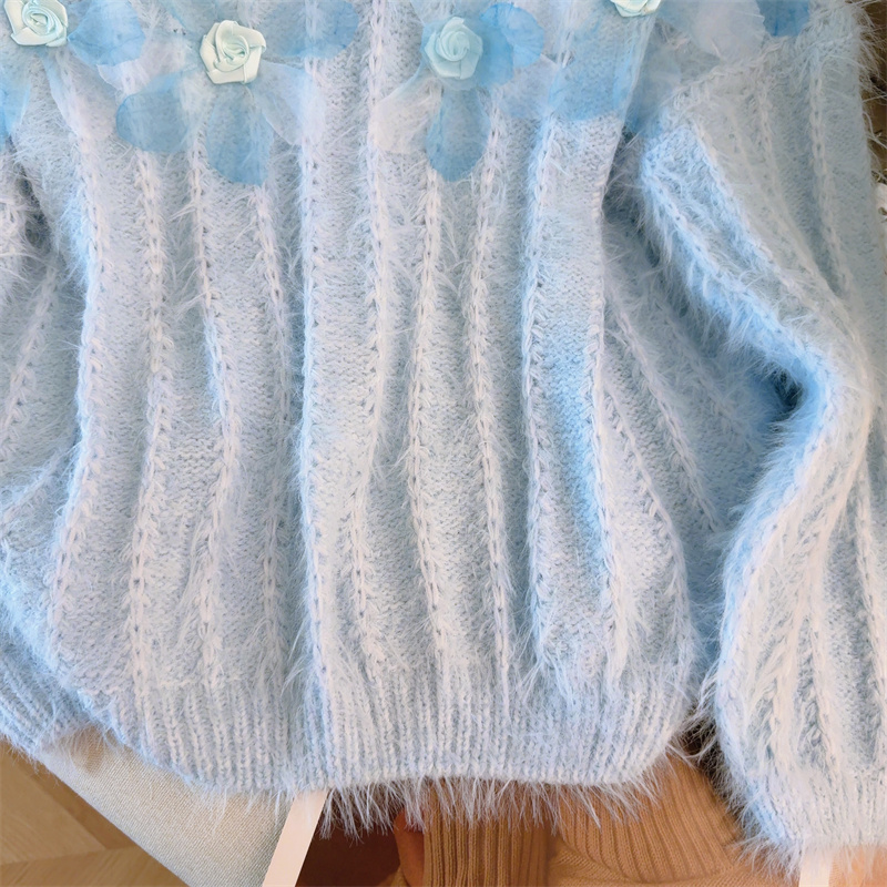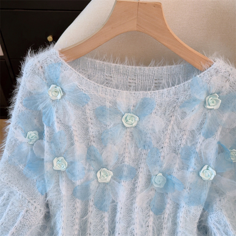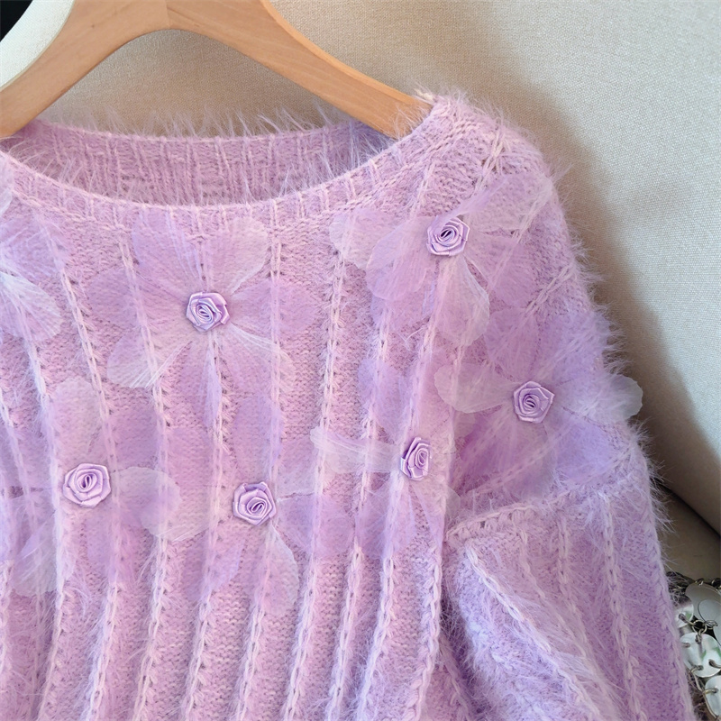 法式甜美重工钉珠花朵毛针织衫女2025年秋装新款宽松勾花镂空毛衣