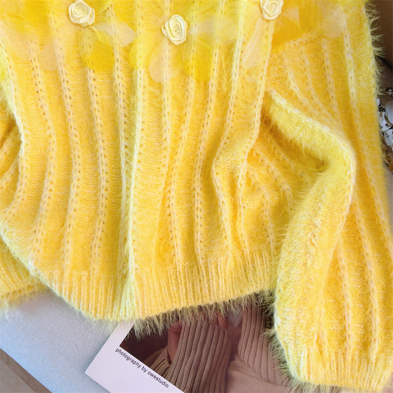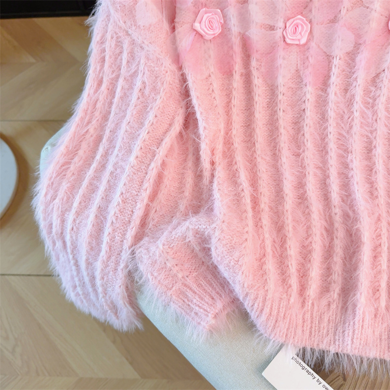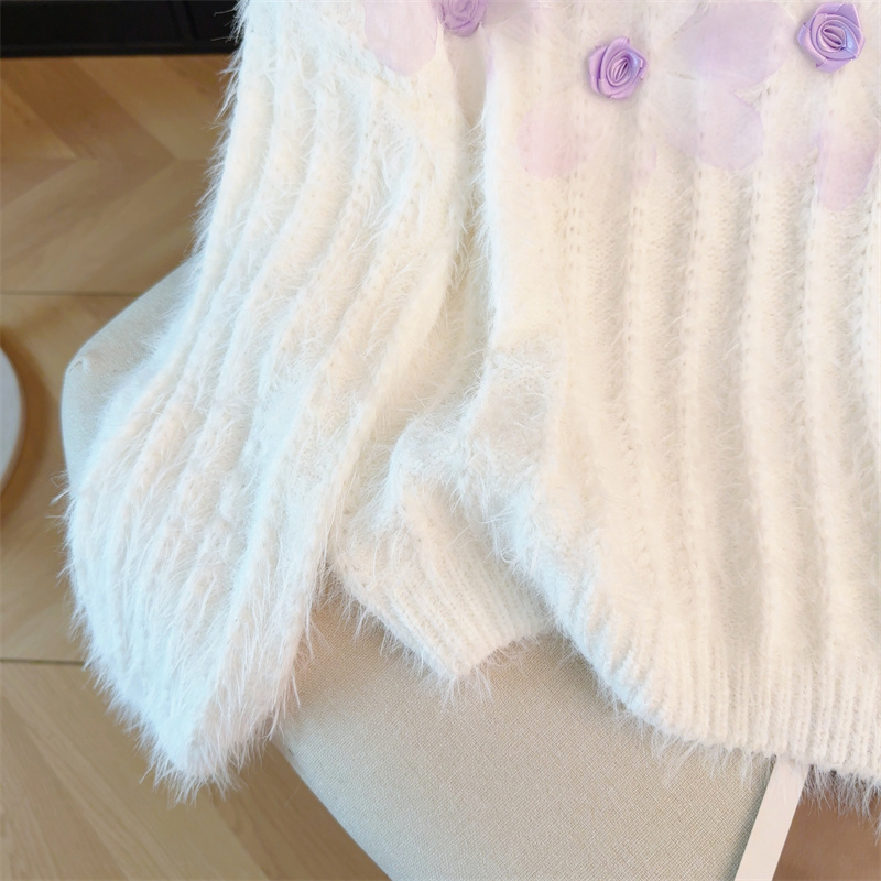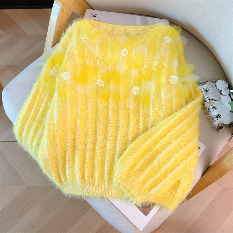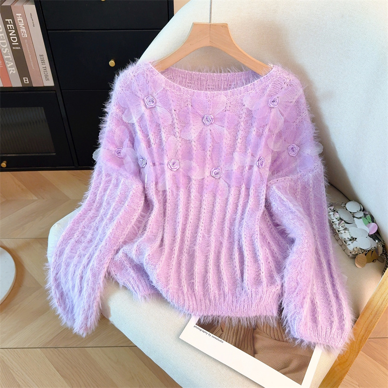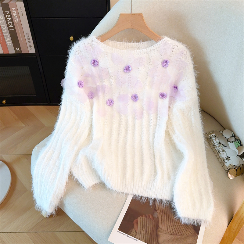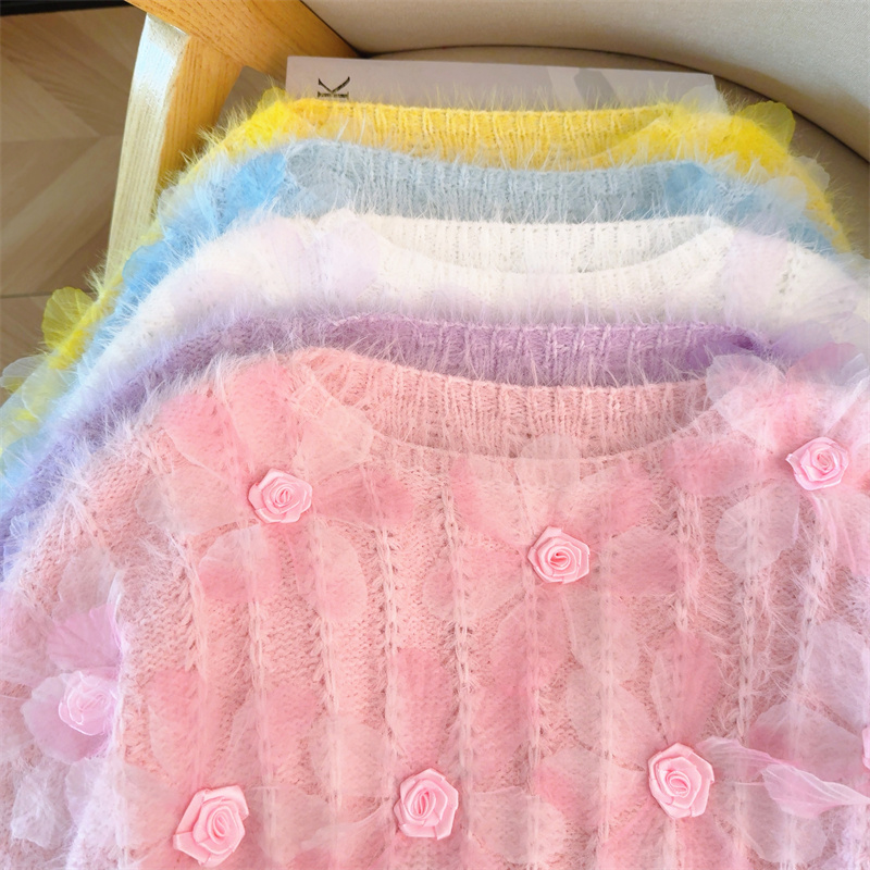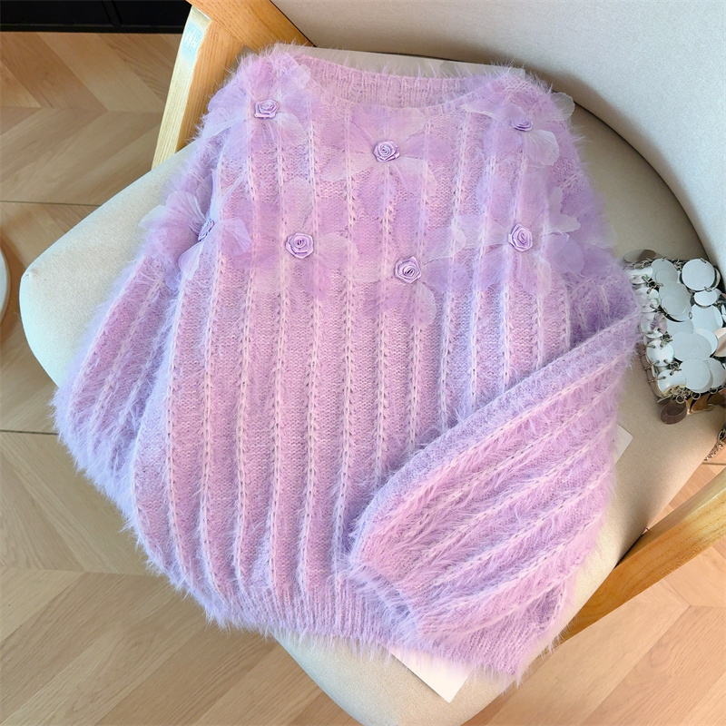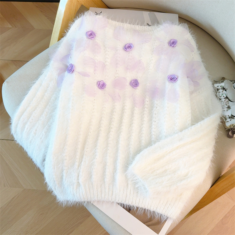法式甜美重工钉珠花朵毛针织衫女2025年秋装新款宽松勾花镂空毛衣