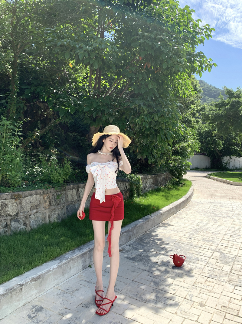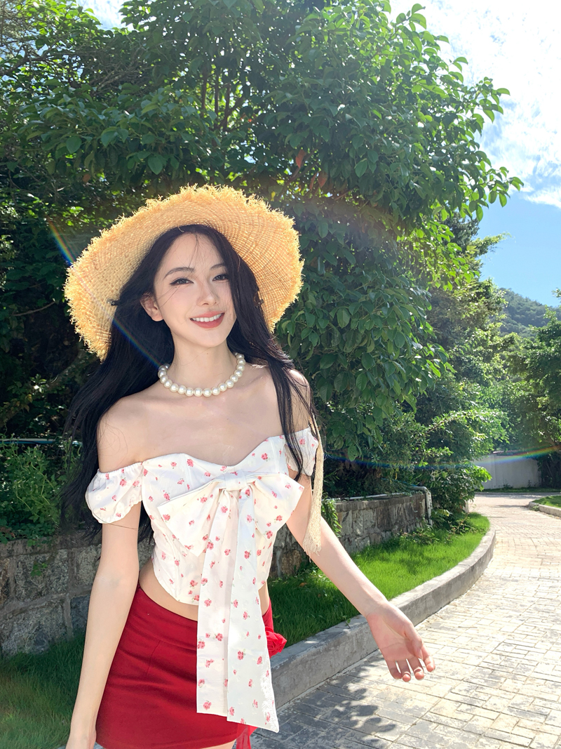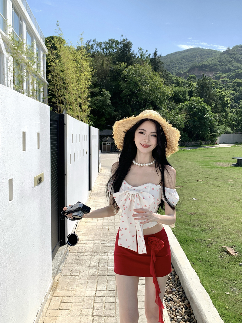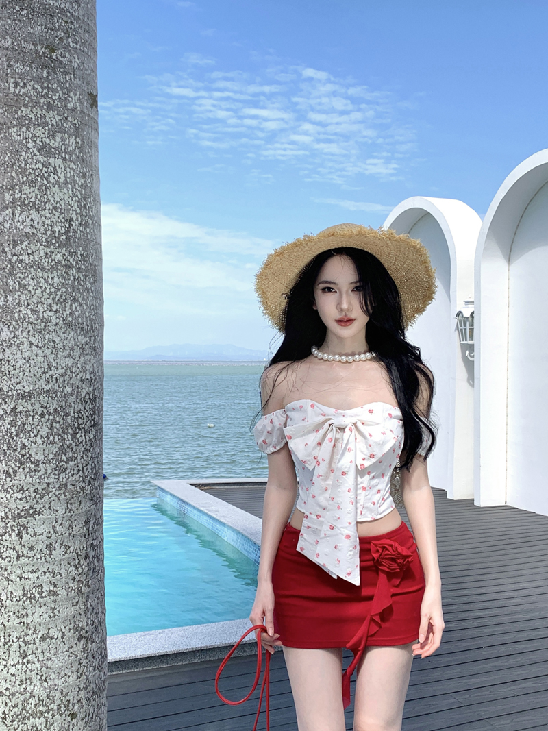 度假红色裙子热浪霓虹蝴蝶结小碎花减龄套装一字肩女夏短裙两件套