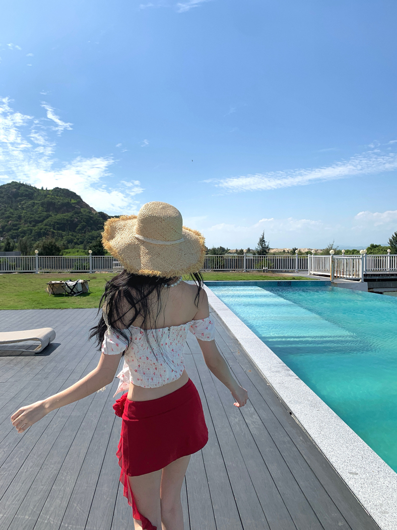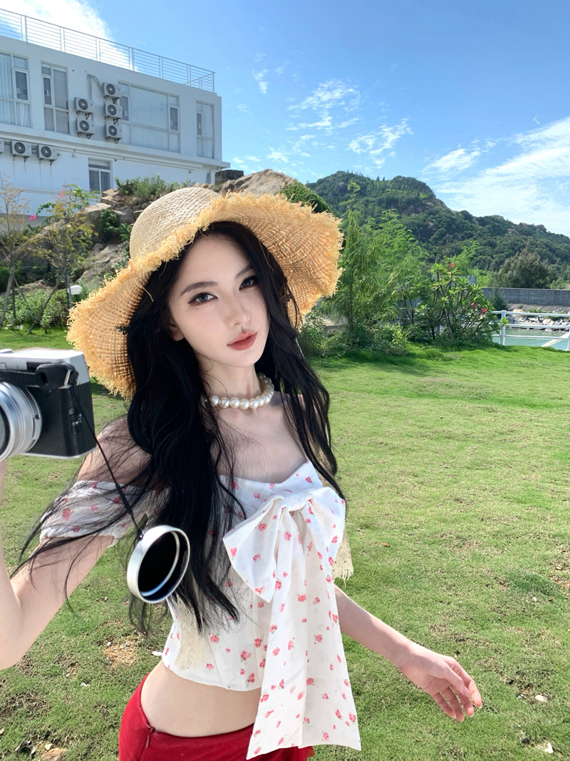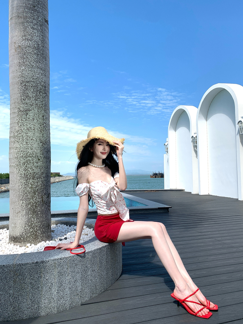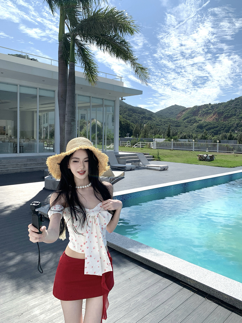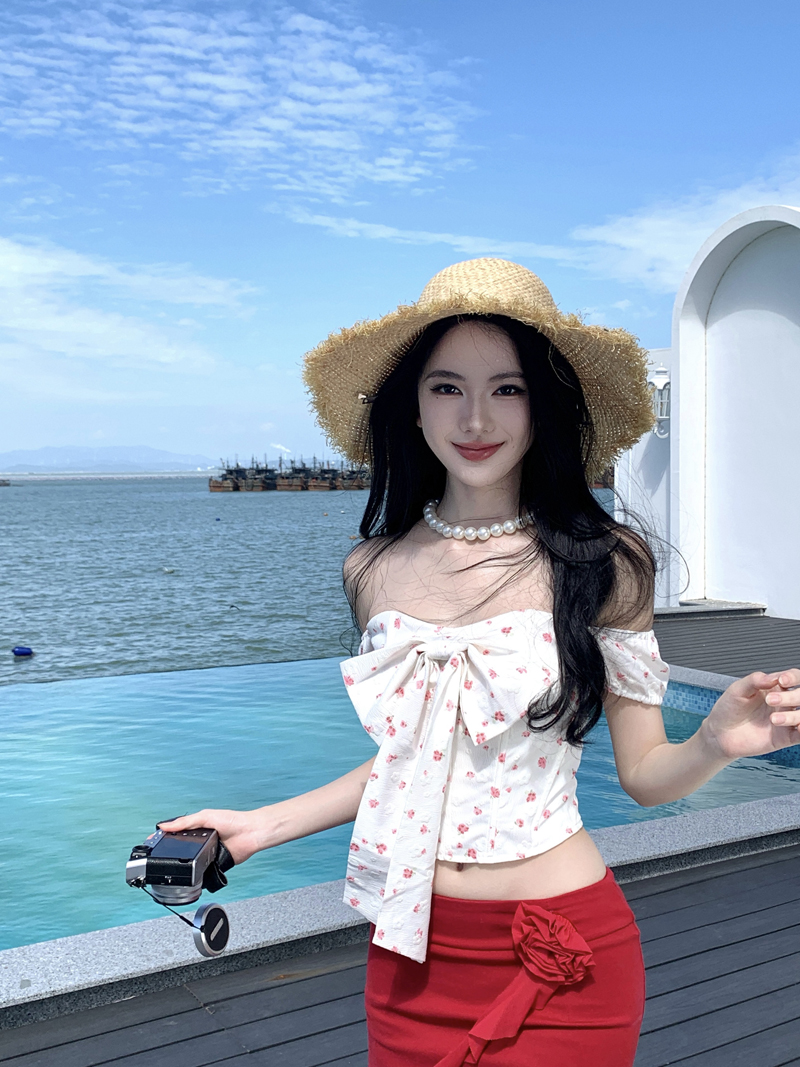 度假红色裙子热浪霓虹蝴蝶结小碎花减龄套装一字肩女夏短裙两件套