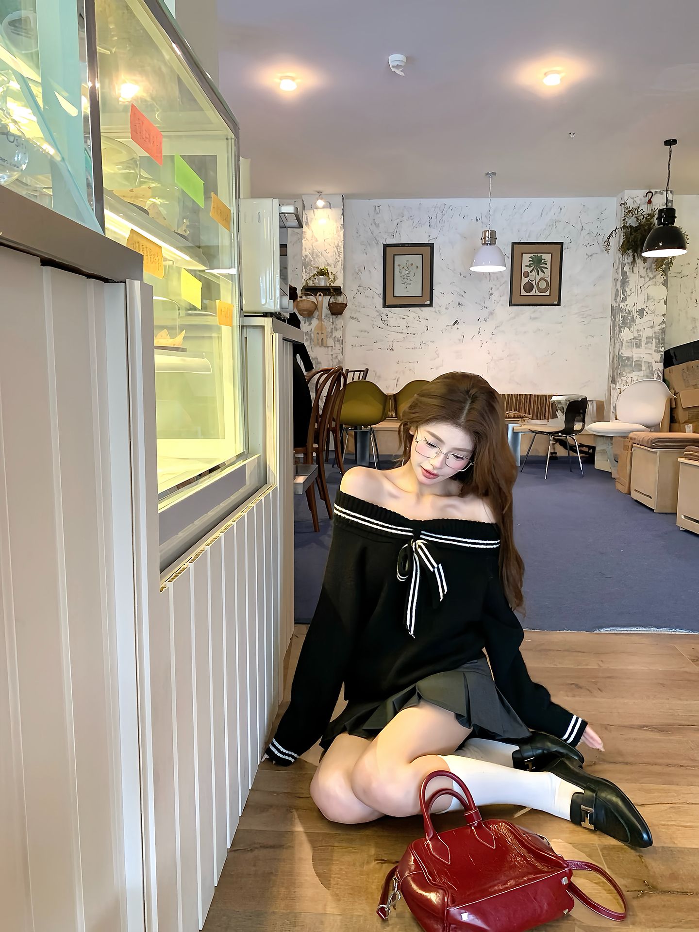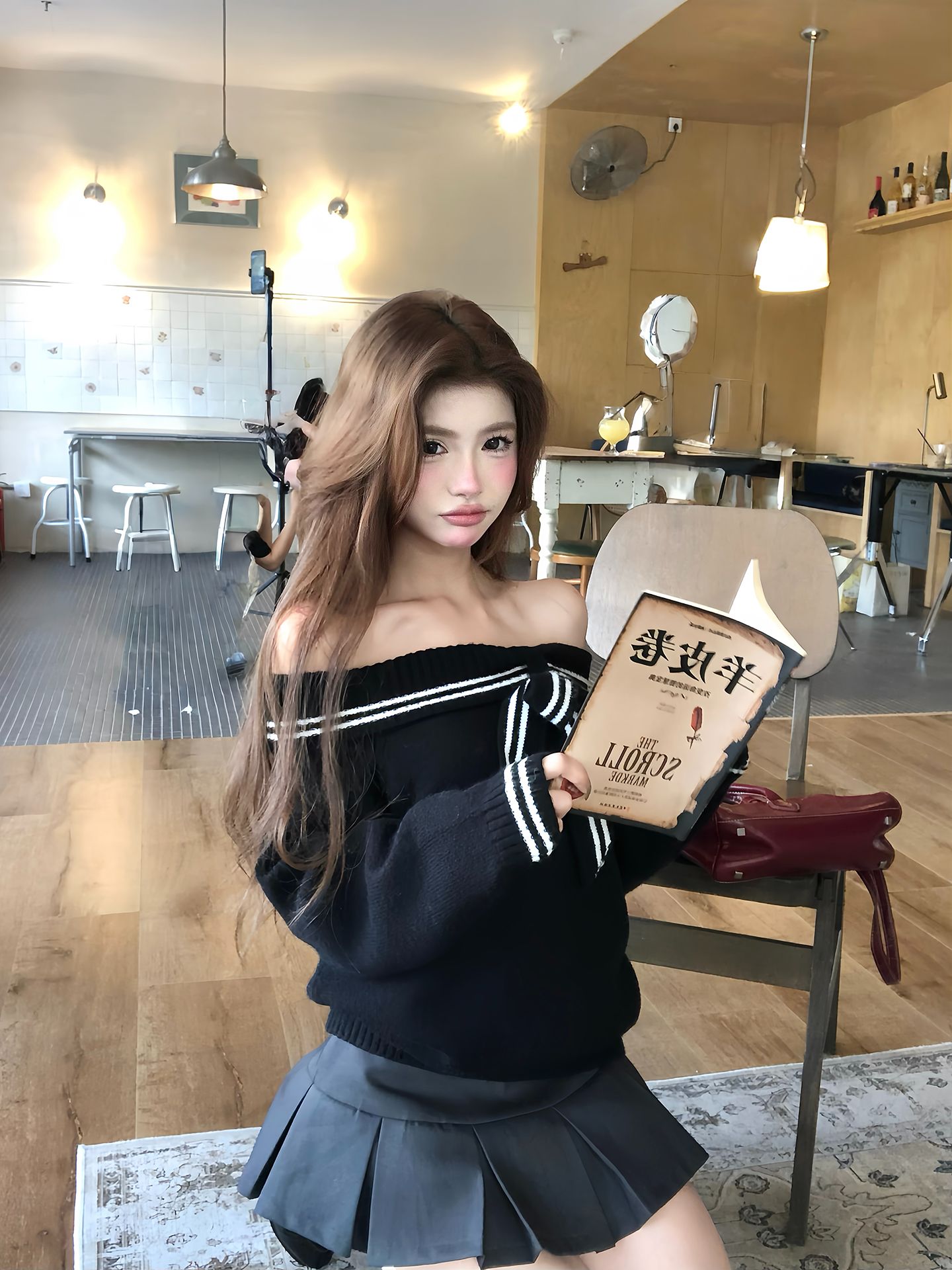 已出货 2025年秋冬海军风配色一字肩毛衣针织衫学院风上衣