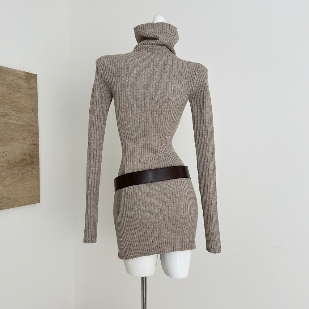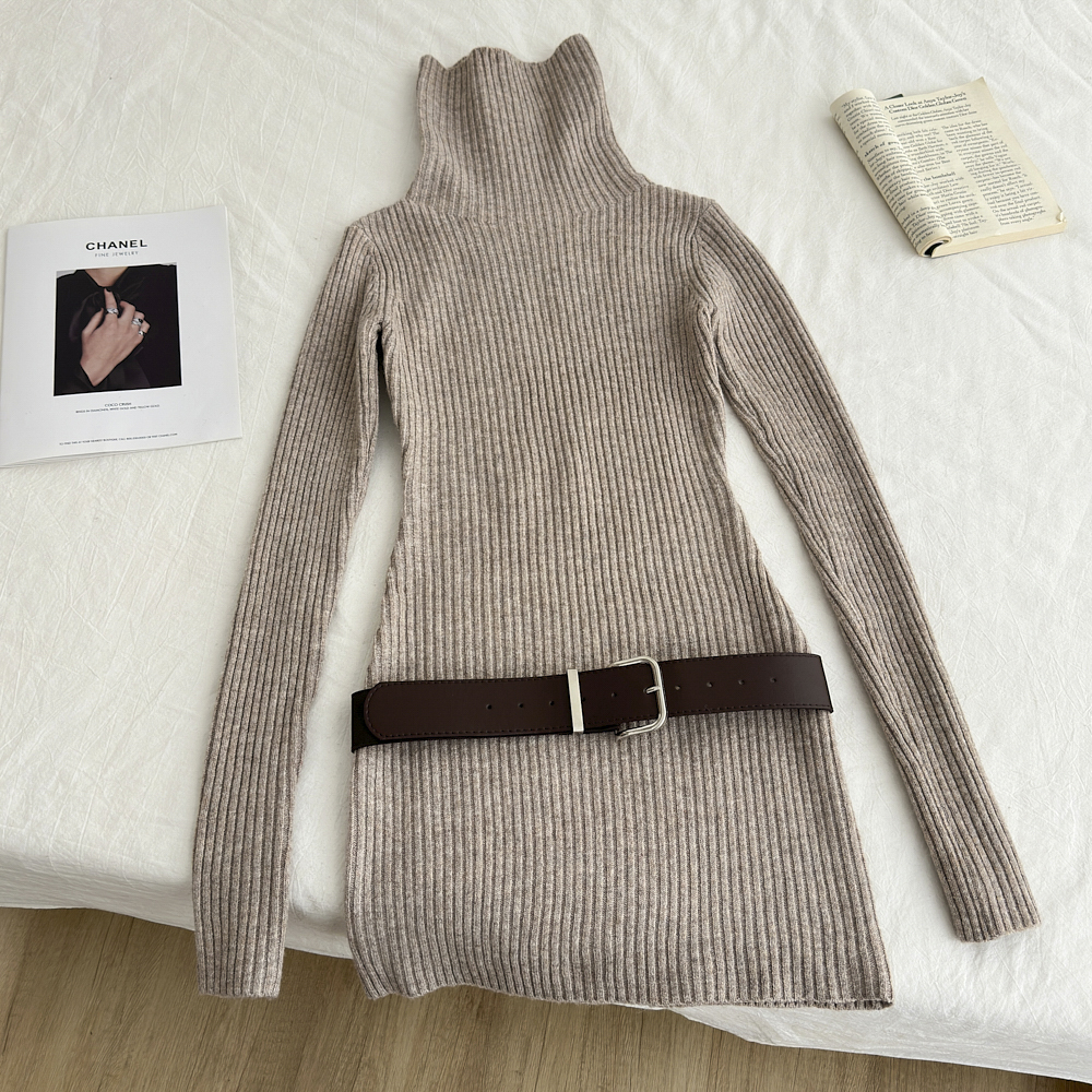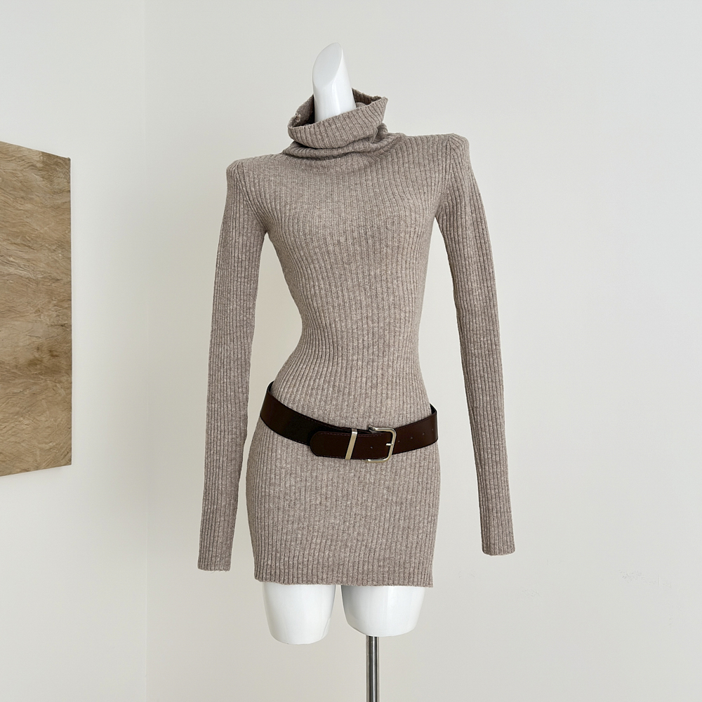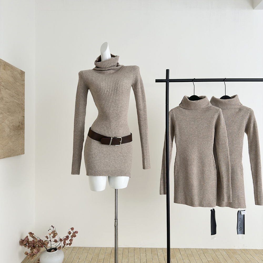 韩好甜WARDEN EDGE 卡其色高领毛衣裙加厚收腰内搭针织连衣裙短裙