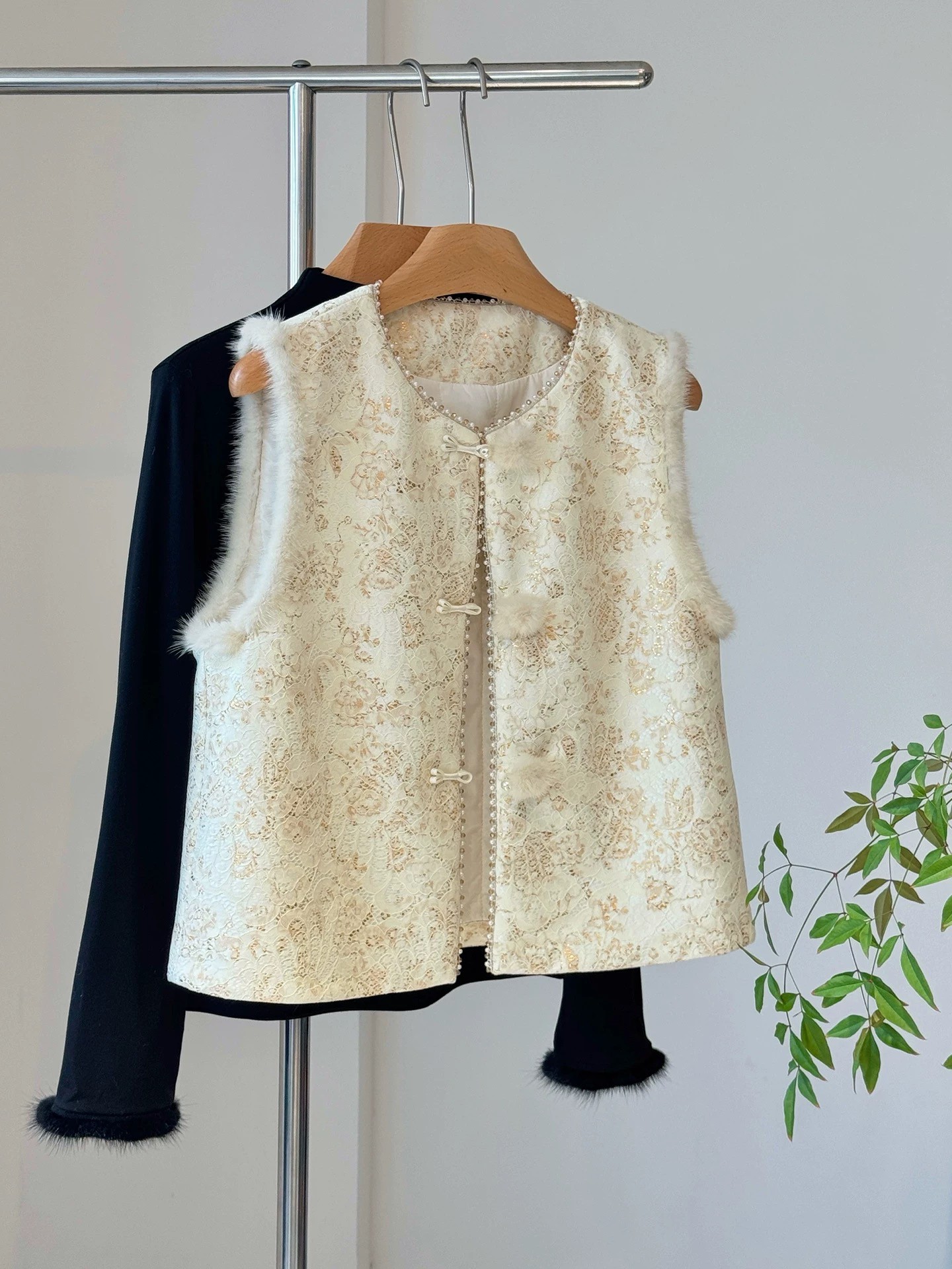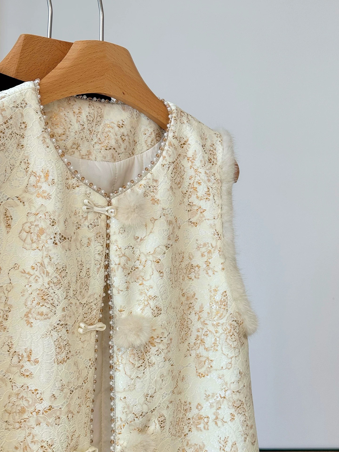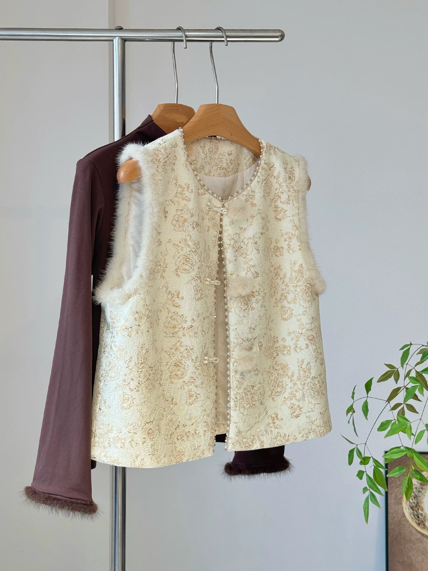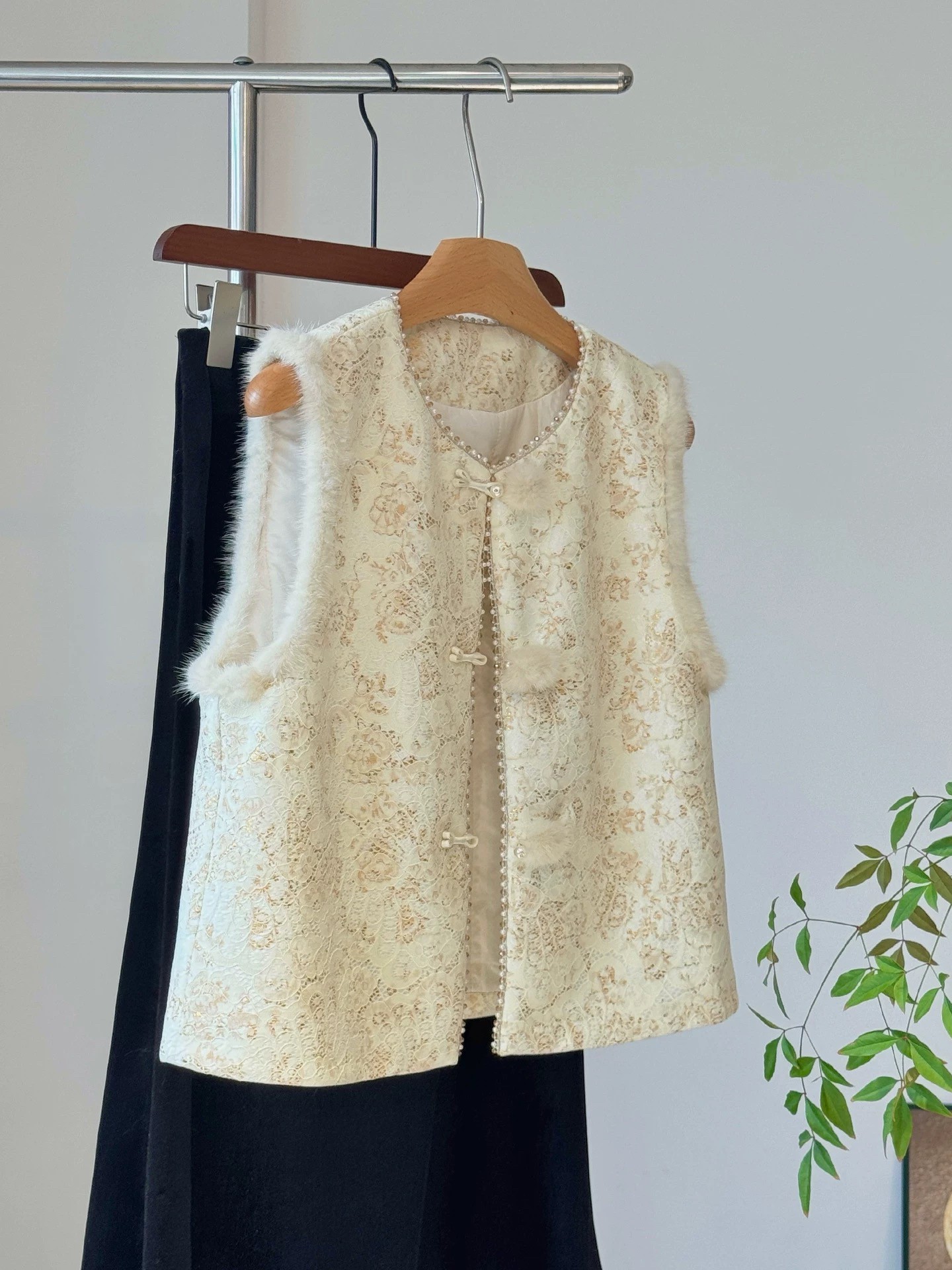 国风水貂毛米白色重工刺绣马甲女外穿洋气减龄日常夹棉新中式背心