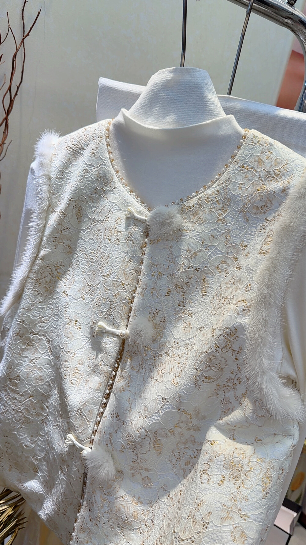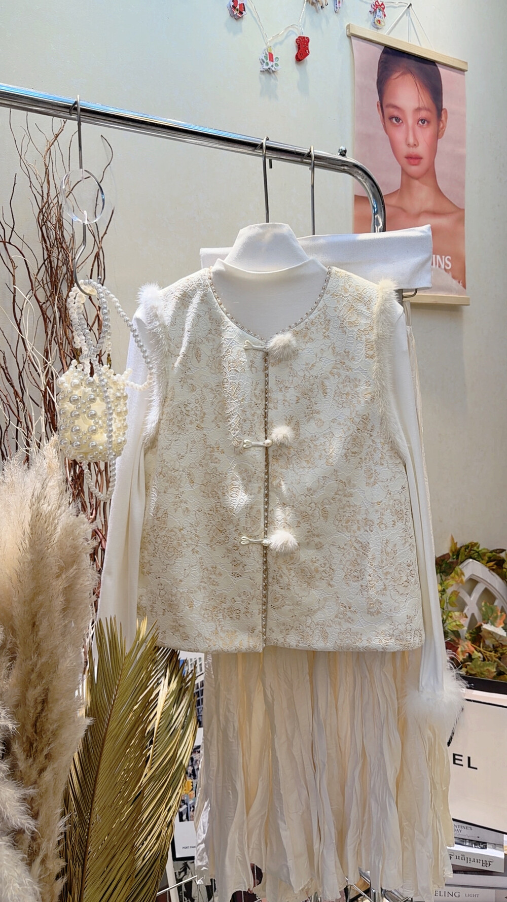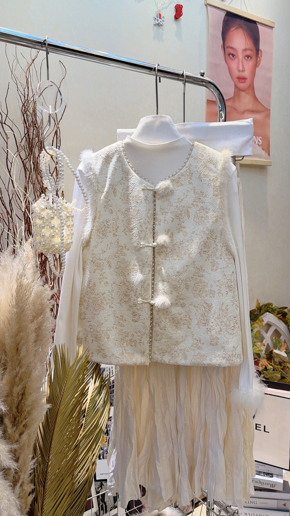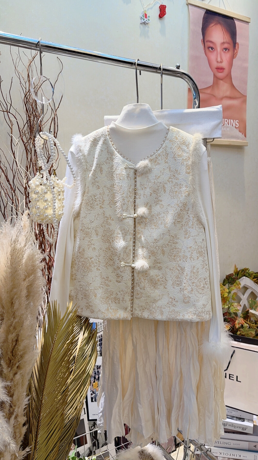 国风水貂毛米白色重工刺绣马甲女外穿洋气减龄日常夹棉新中式背心