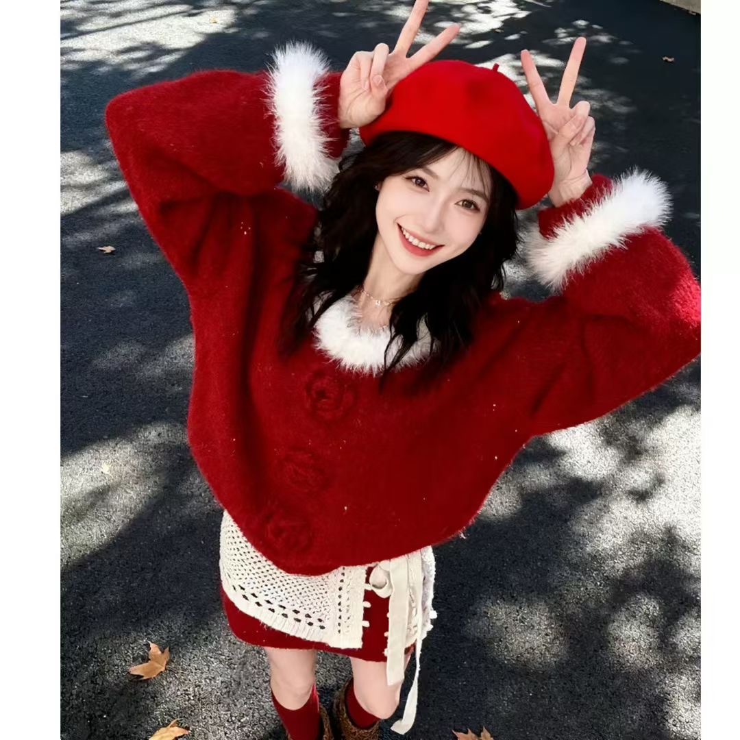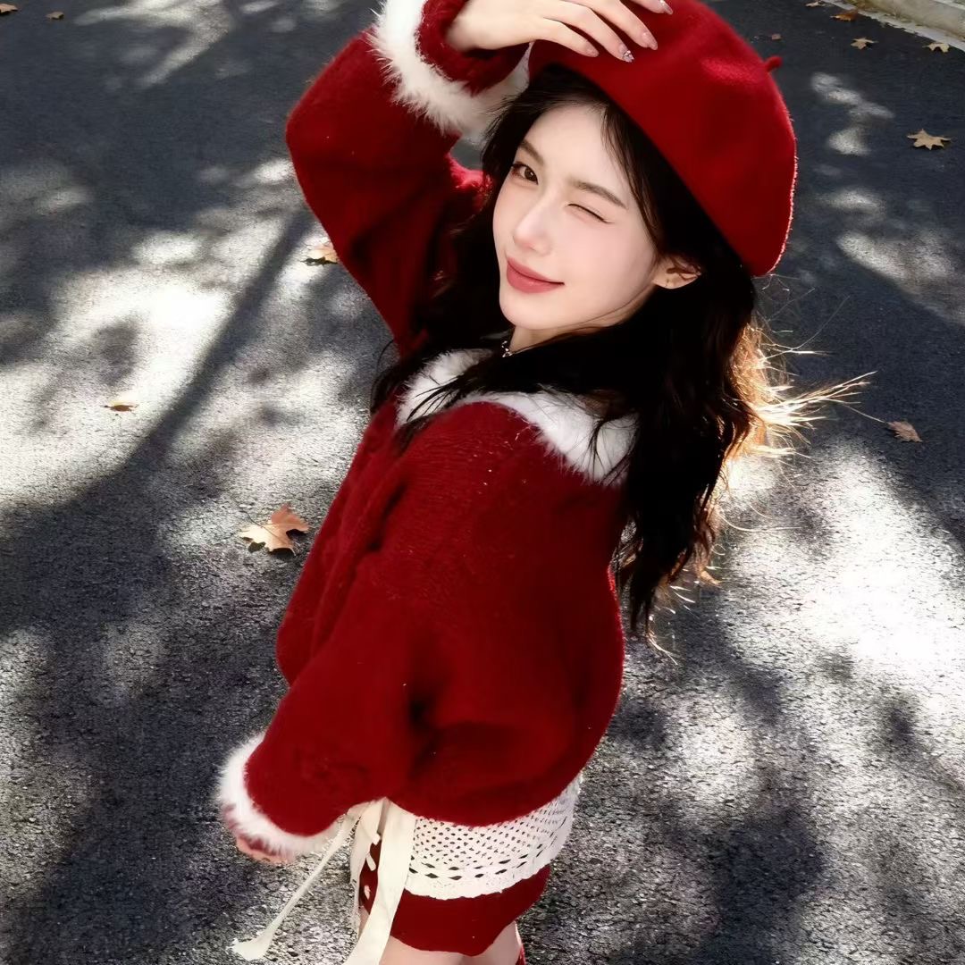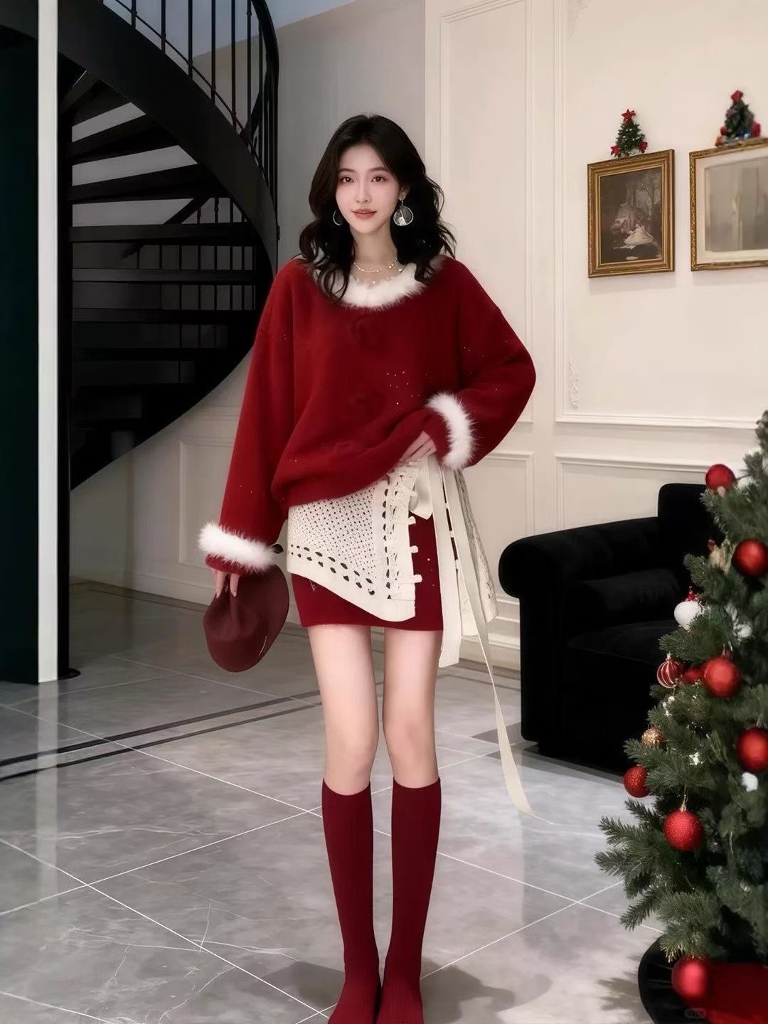 겨울철 인기 만점 코디: 날씬하고 어려 보이는 레드 니트 스웨터와 스커트로 구성된 완벽한 한국 스타일 디자인 세트.