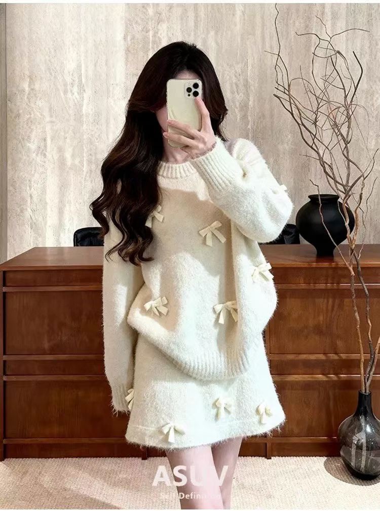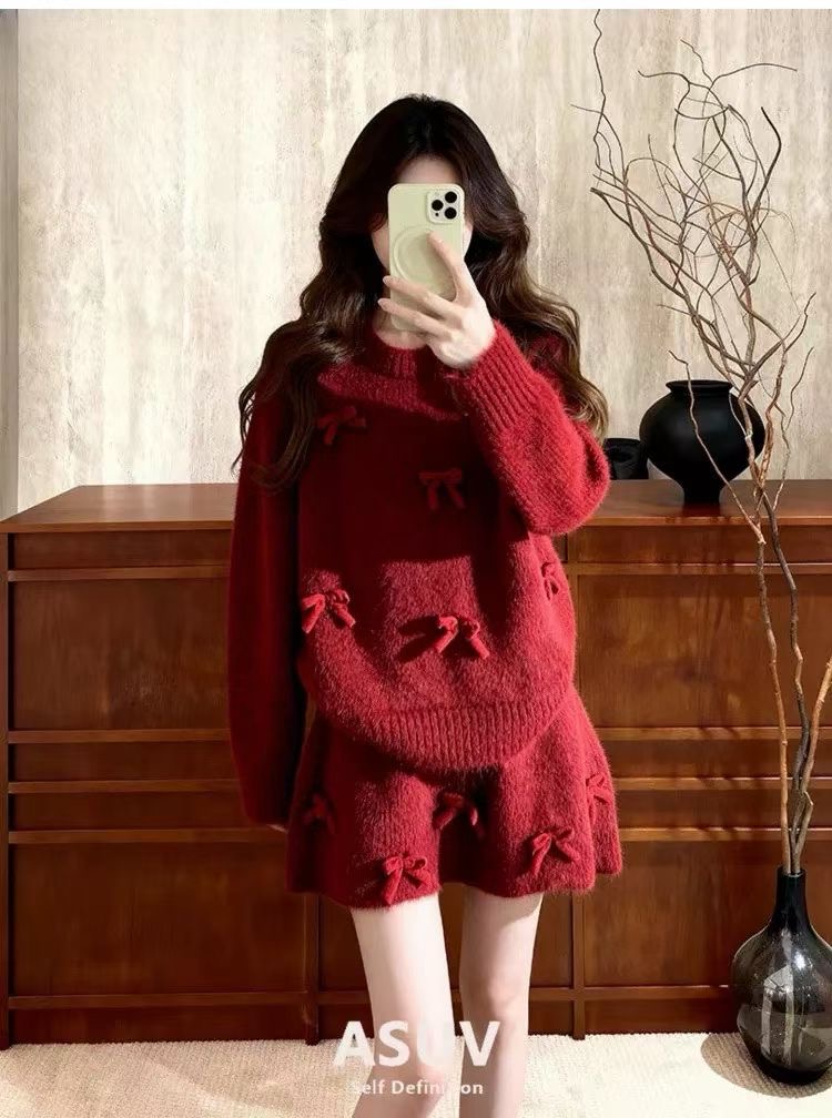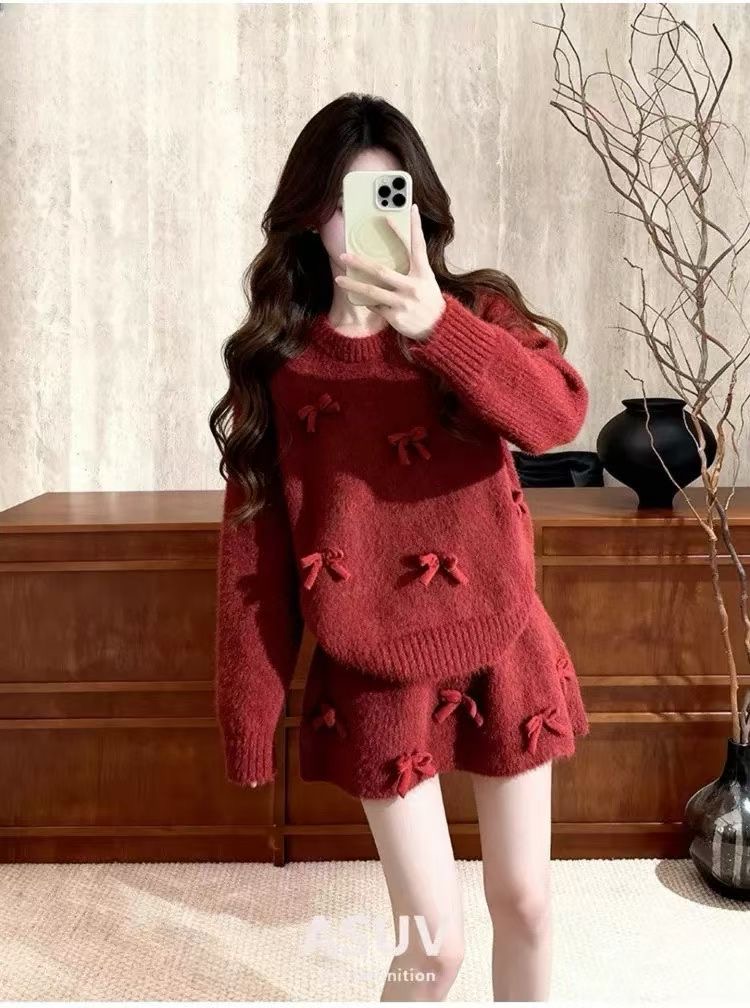 新品~2026冬季新款时尚气质减龄圣诞红色蝴蝶结两件套装