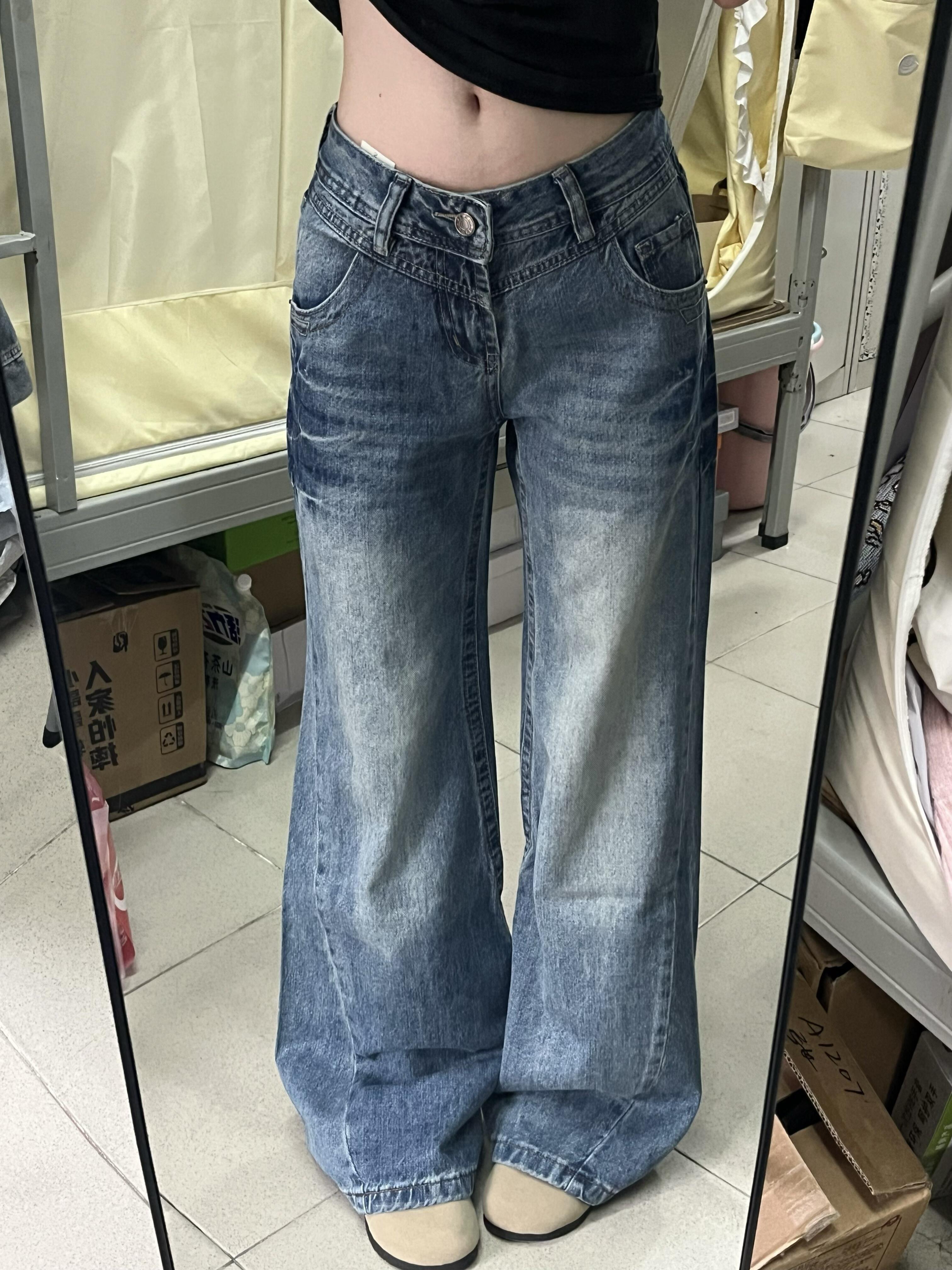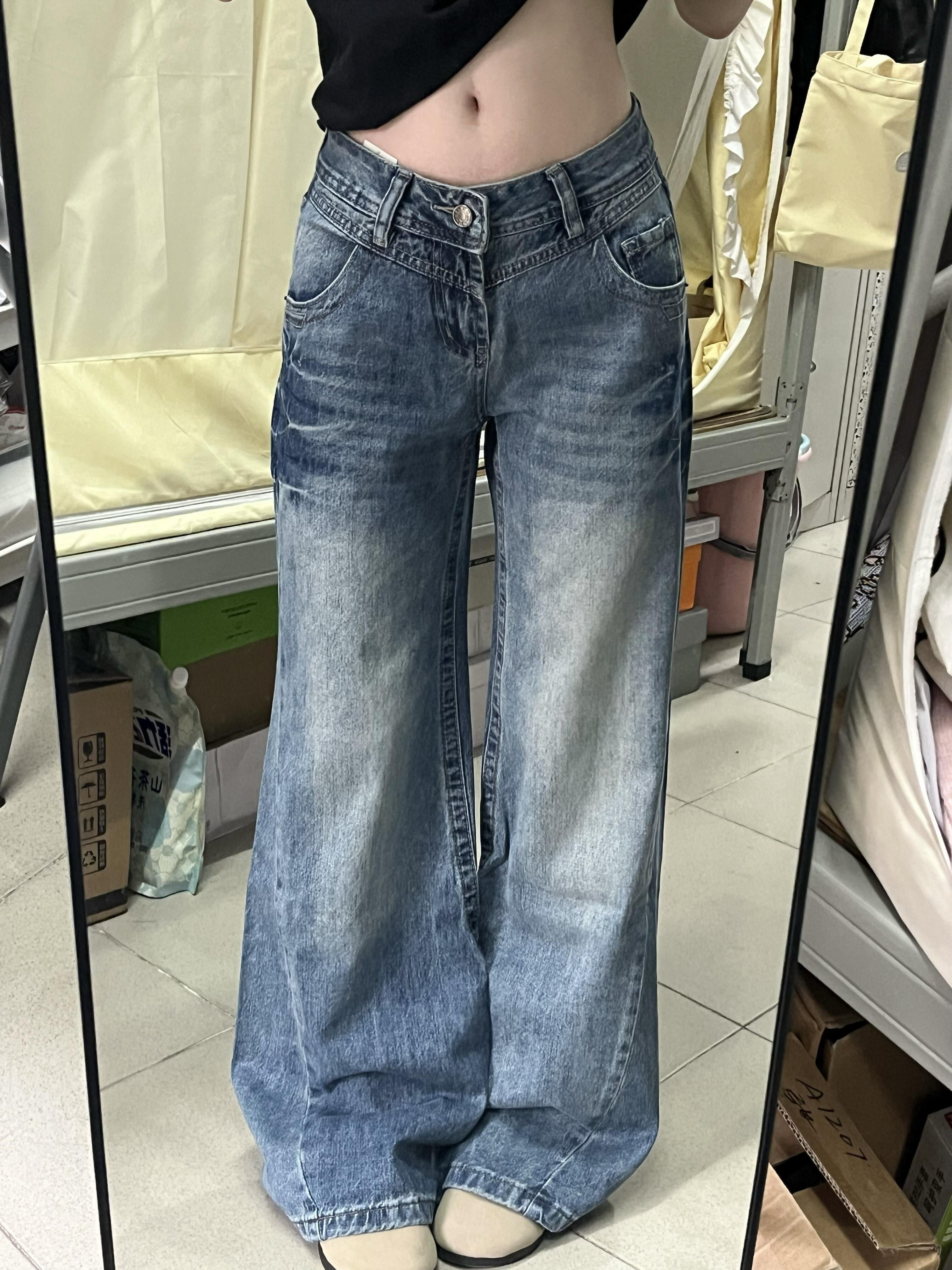 미국 레트로 디자인의 여성용 워싱 로우라이즈 스트레이트 레그 진, 새로운 가을/겨울 스타일, 루즈한 와이드 레그 플로어 길이 팬츠.