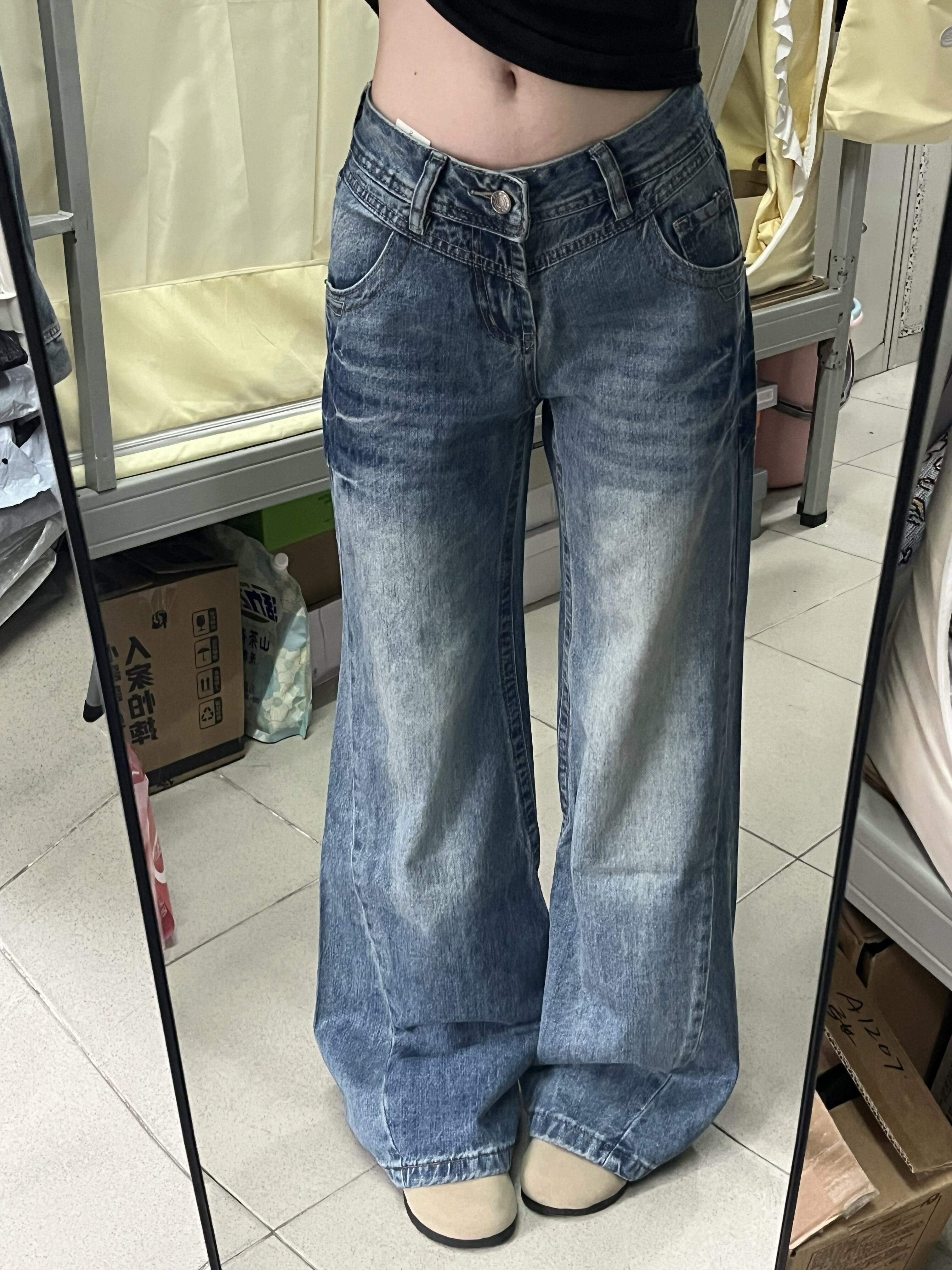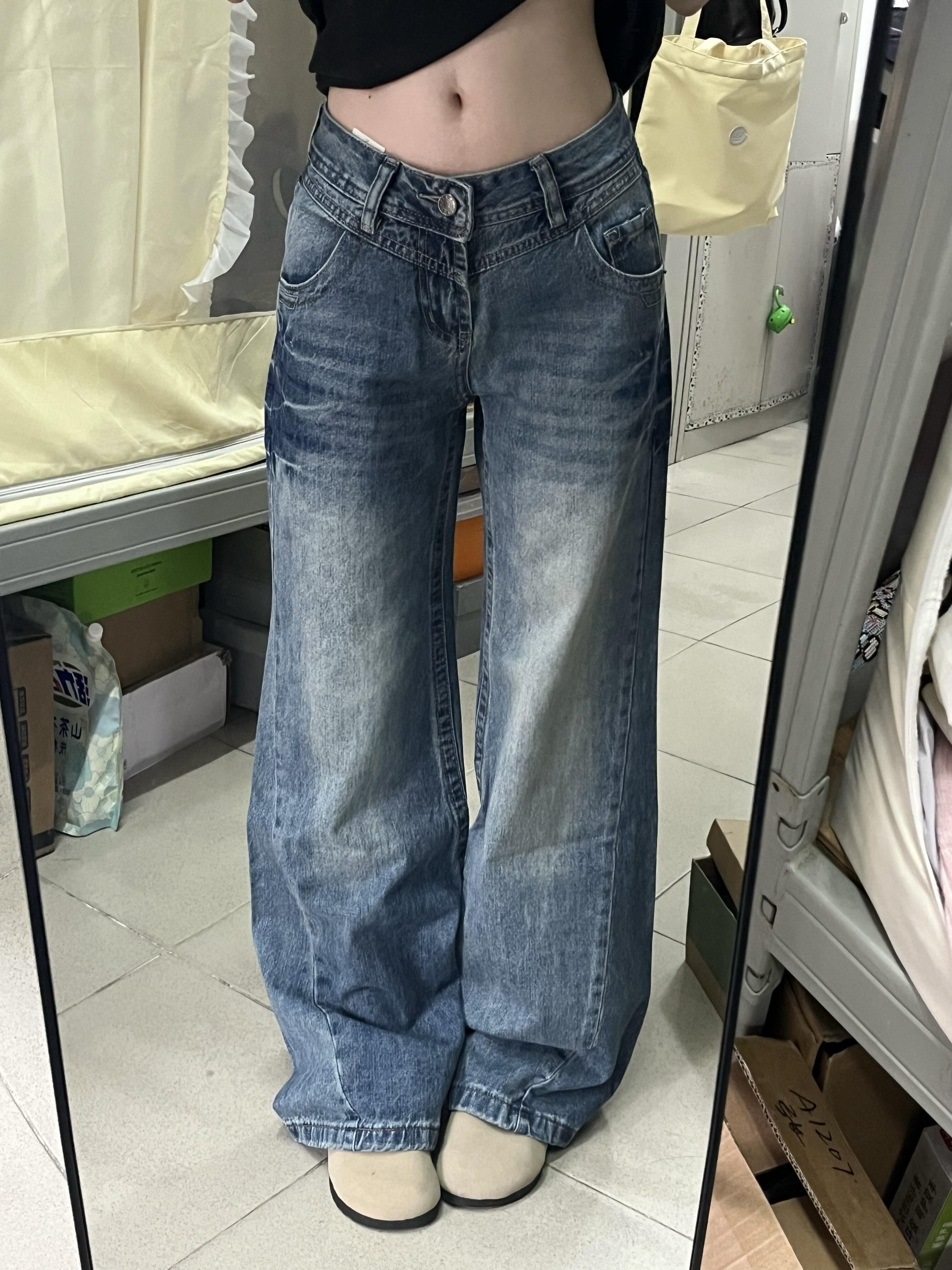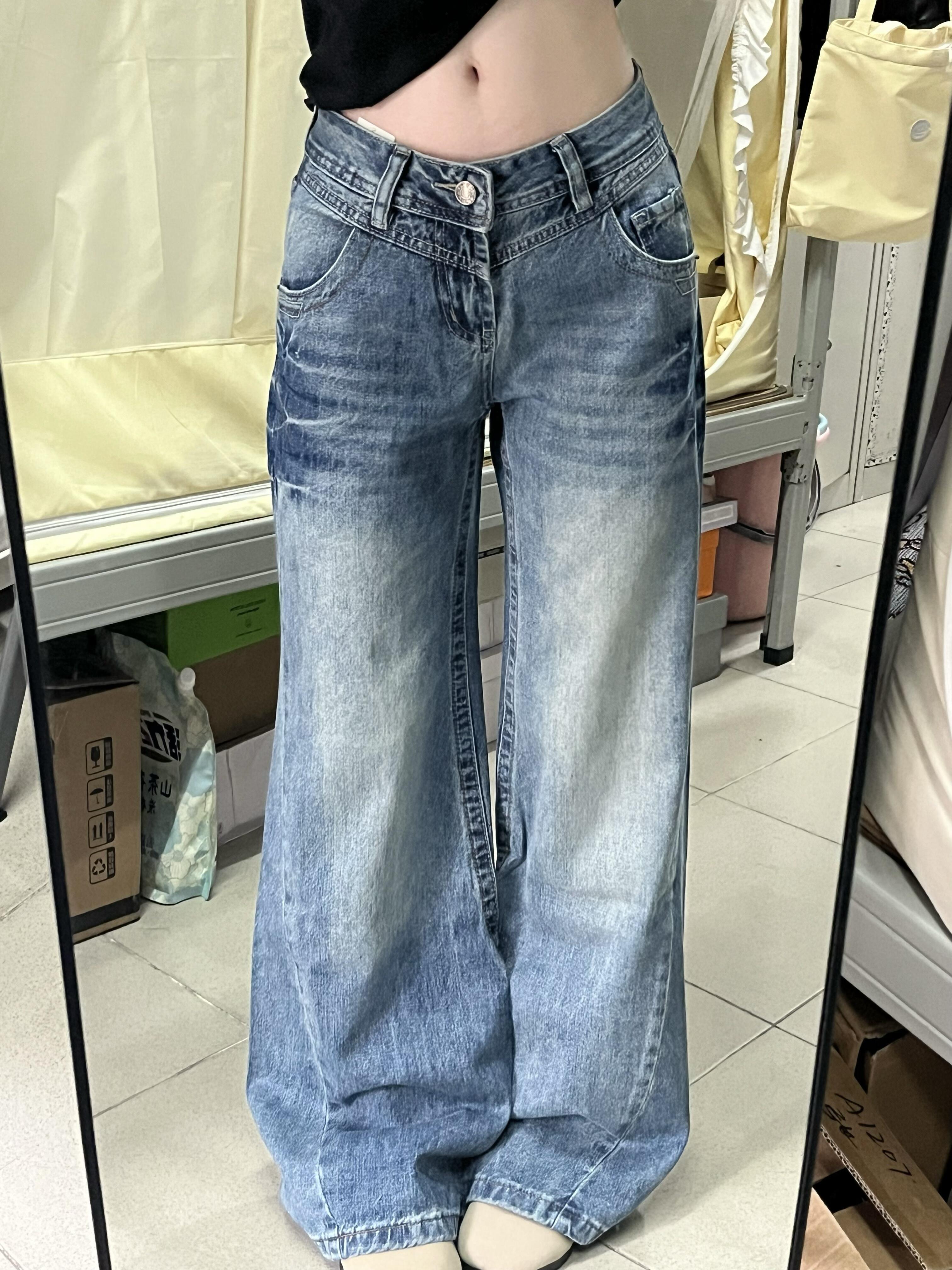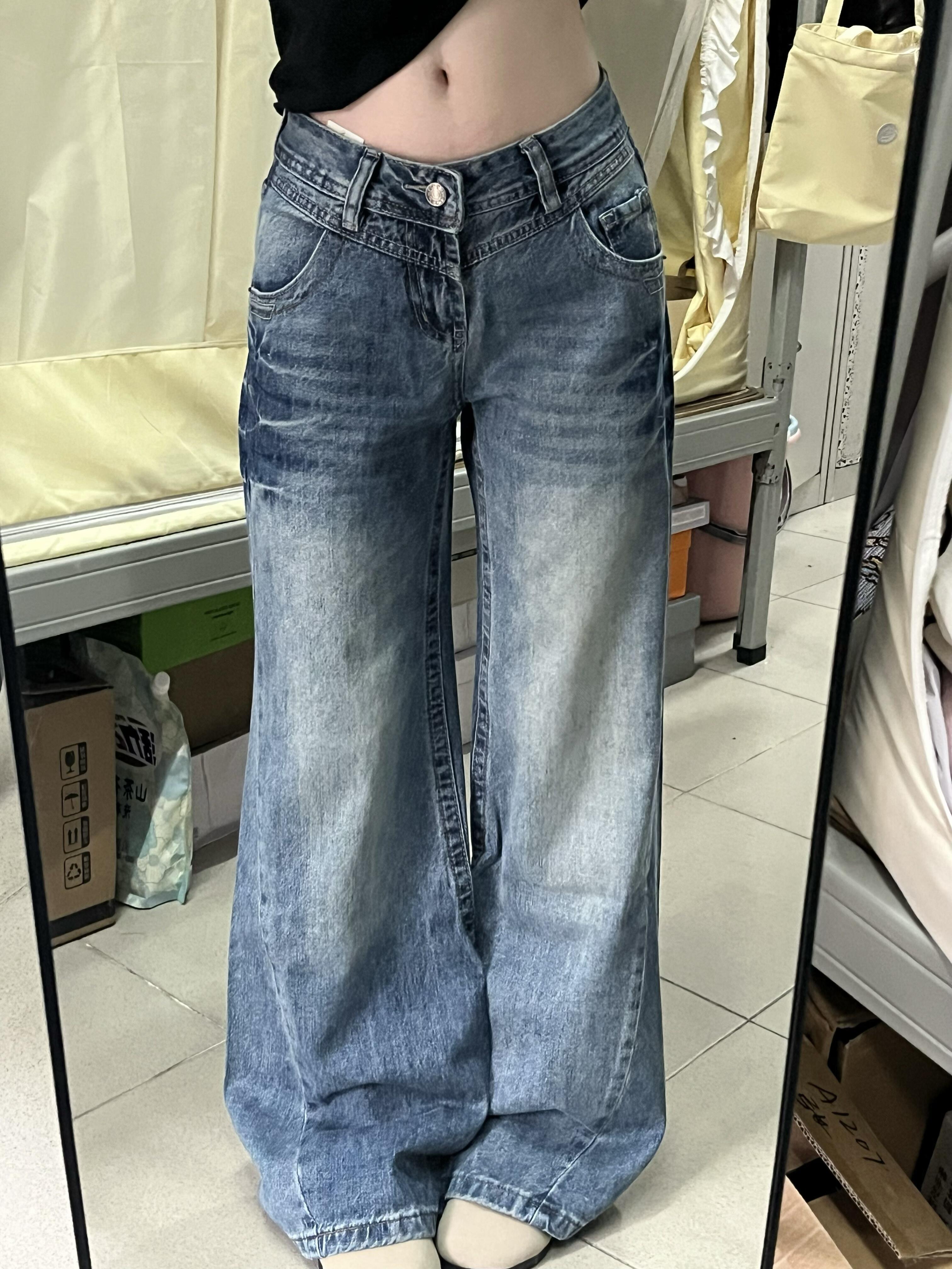 小个子美式复古低腰阔腿牛仔裤女2025秋季新款宽松辣妹微喇叭裤子