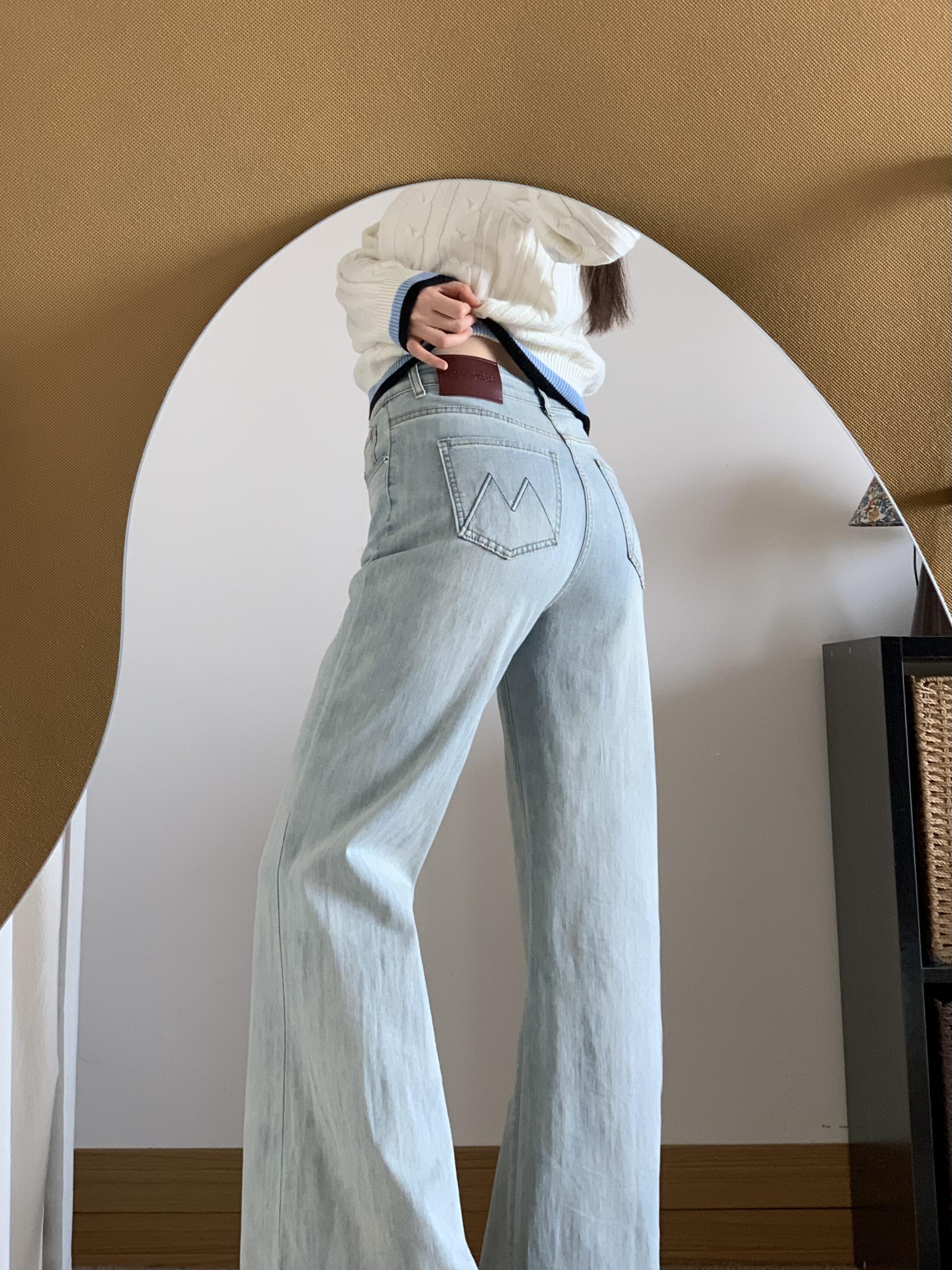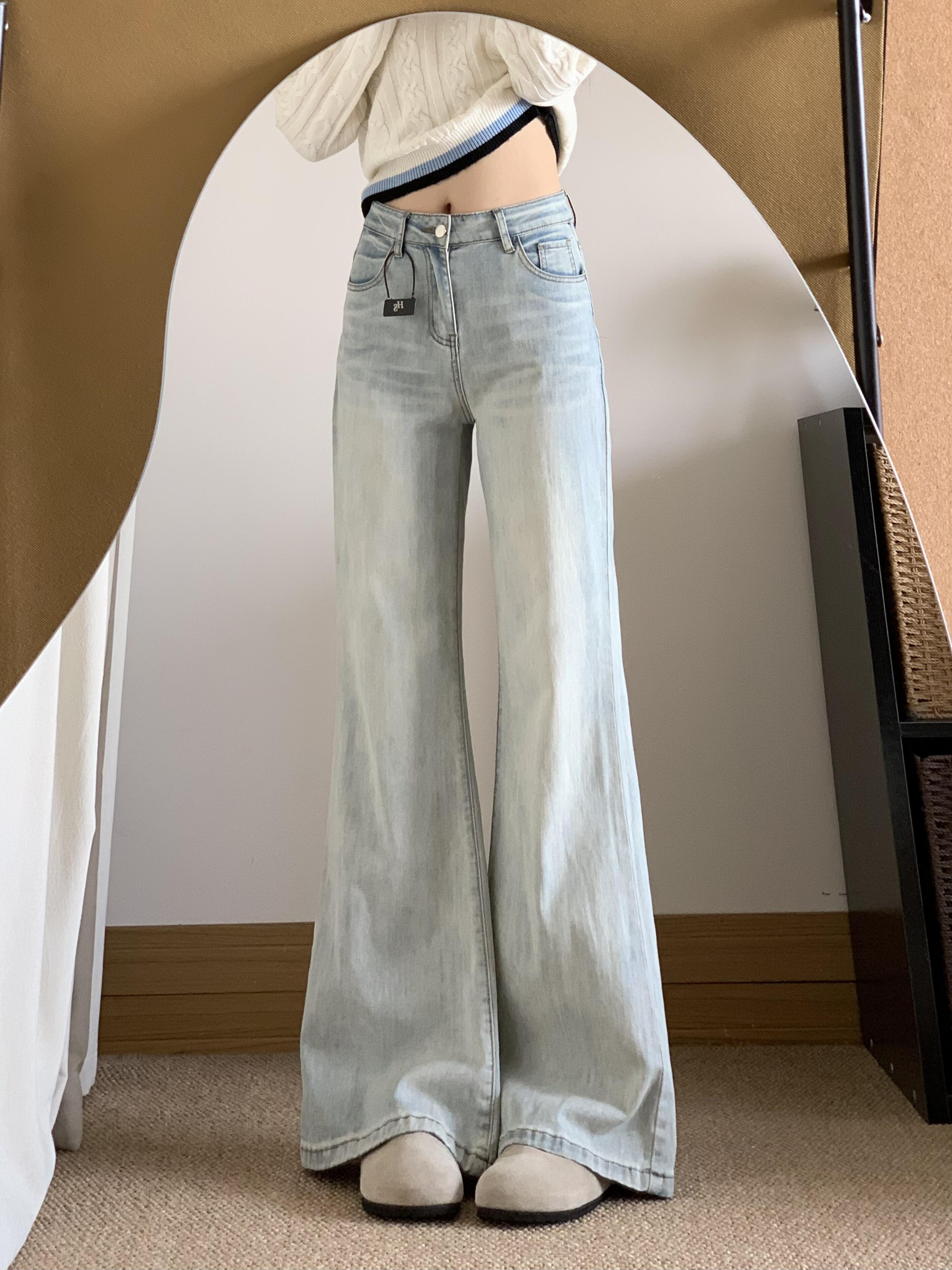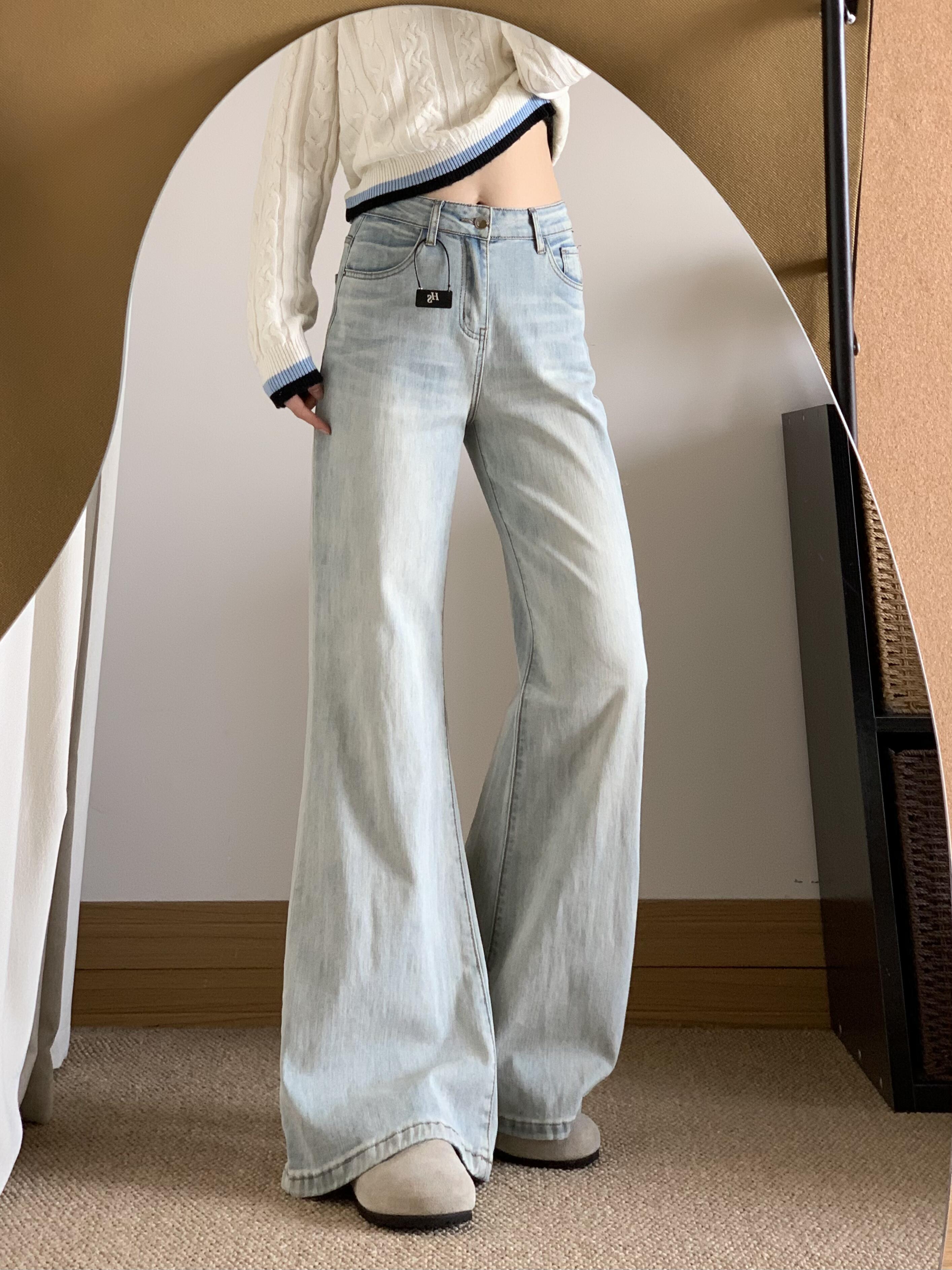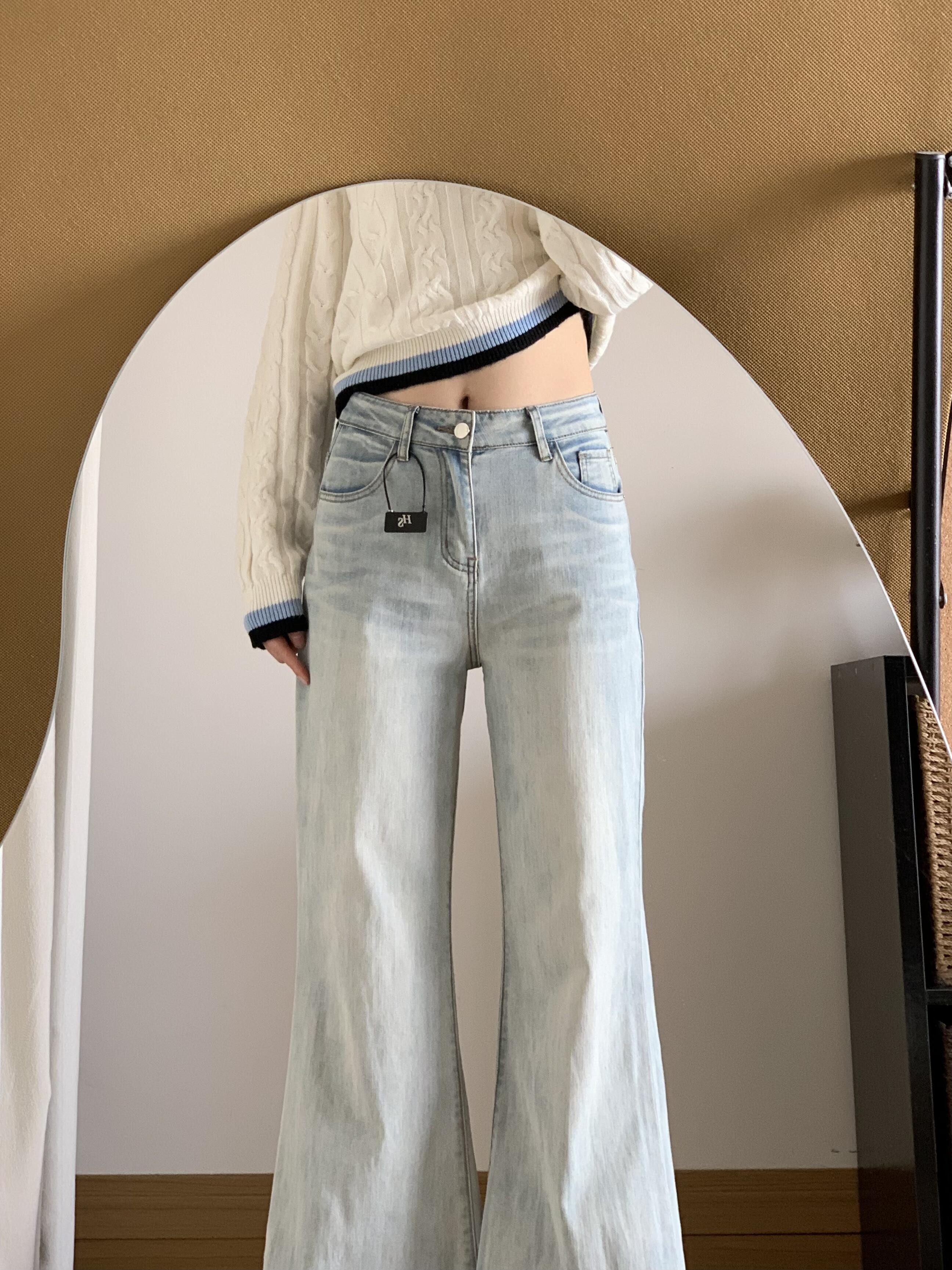 2025년 가을/겨울 신상, 연한 파란색의 슬림핏이 아닌 살짝 나팔바지 스타일의 여성용 청바지입니다. 하이웨이스트 디자인에 슬림해 보이는 실루엣, 트렌디한 플레어 팬츠입니다.