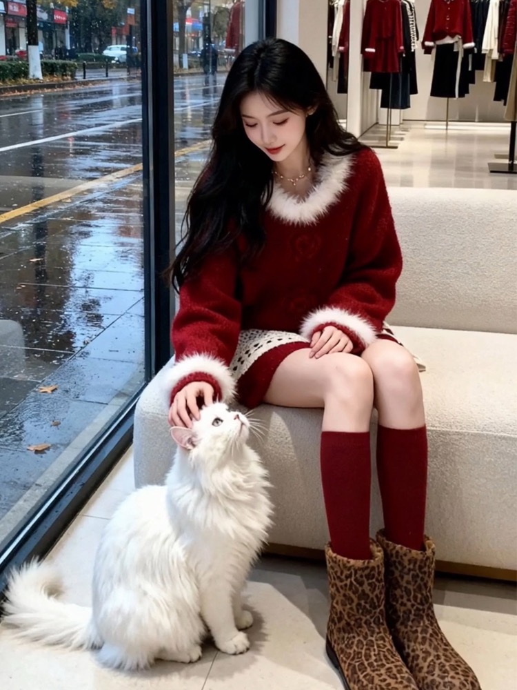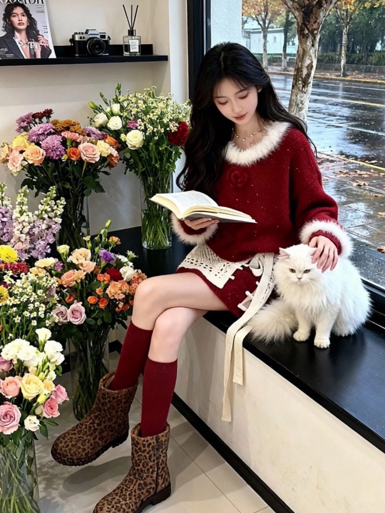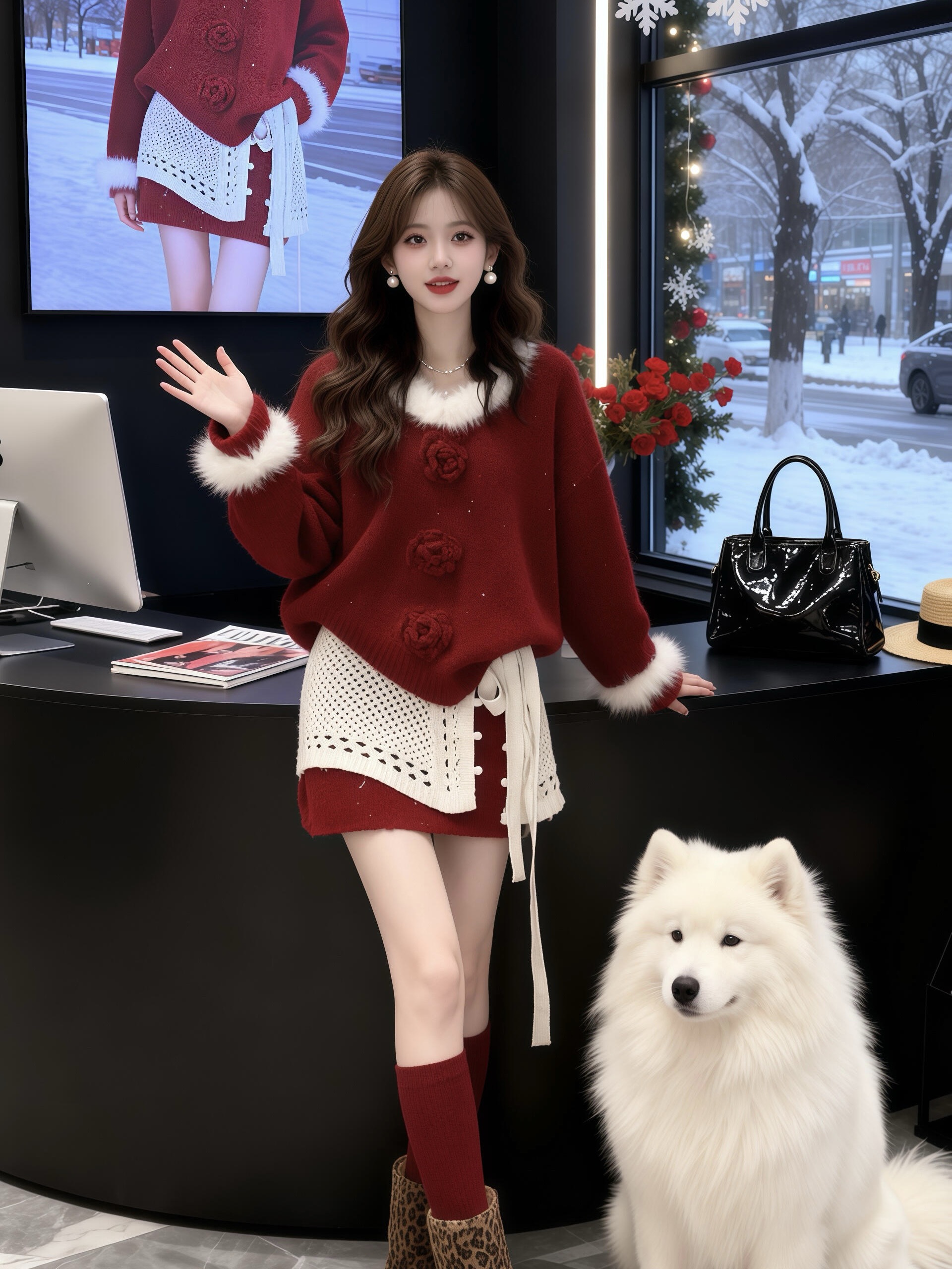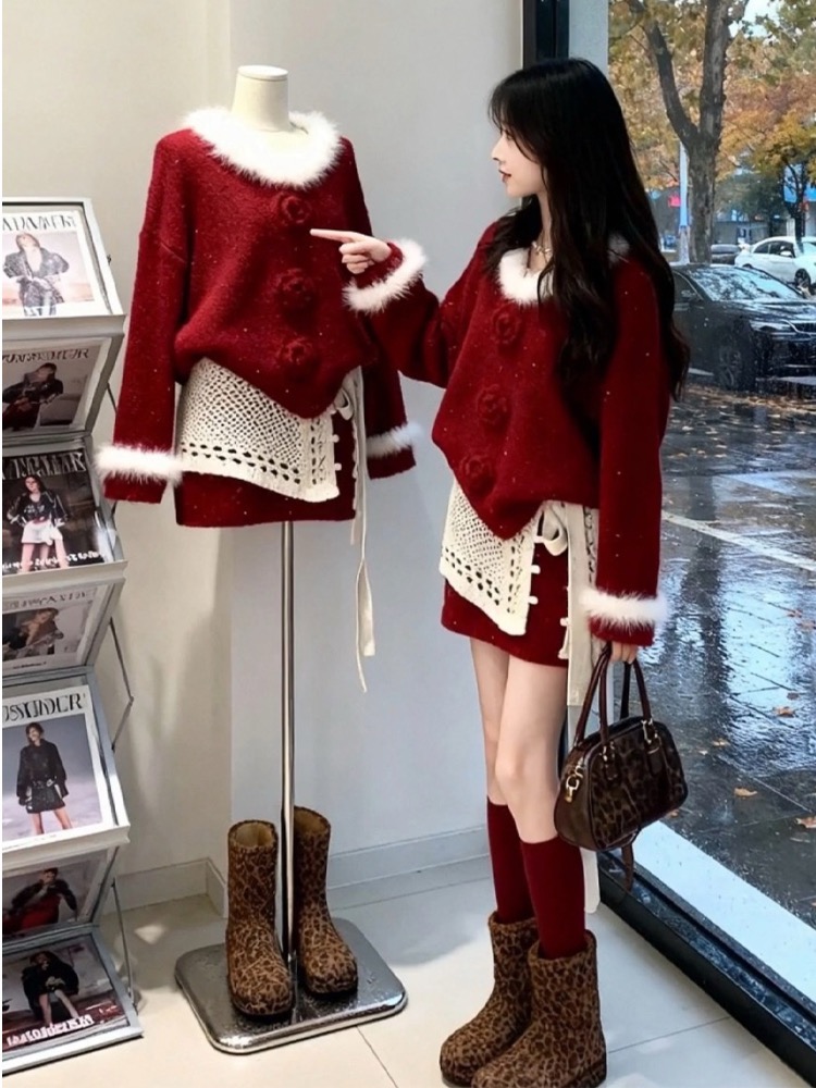 圣诞节新年红色毛针织衫毛衣上衣女秋冬新款半身裙三件套