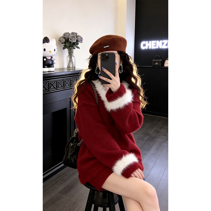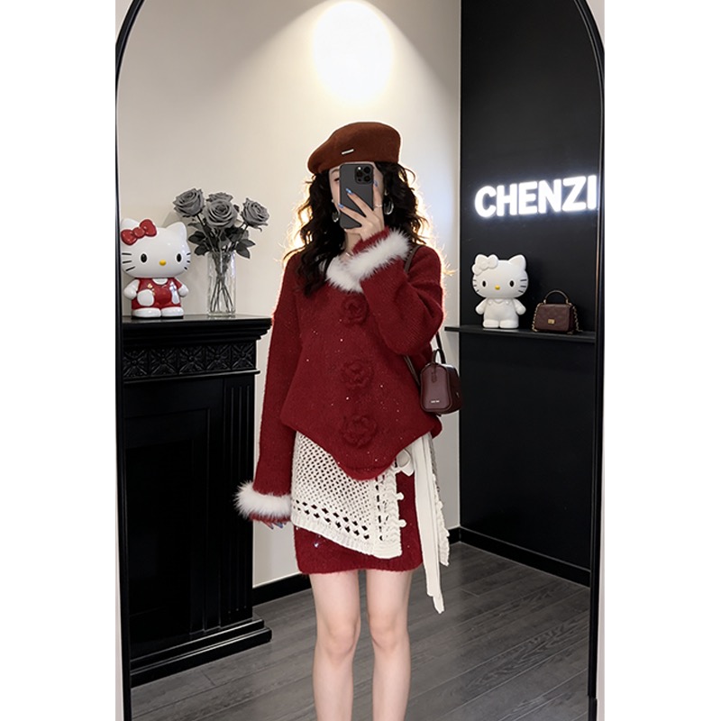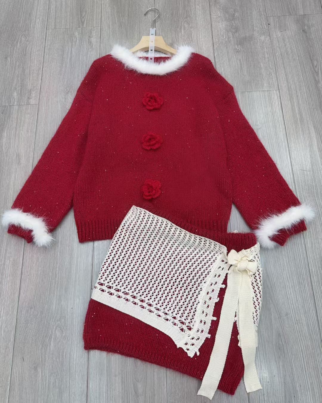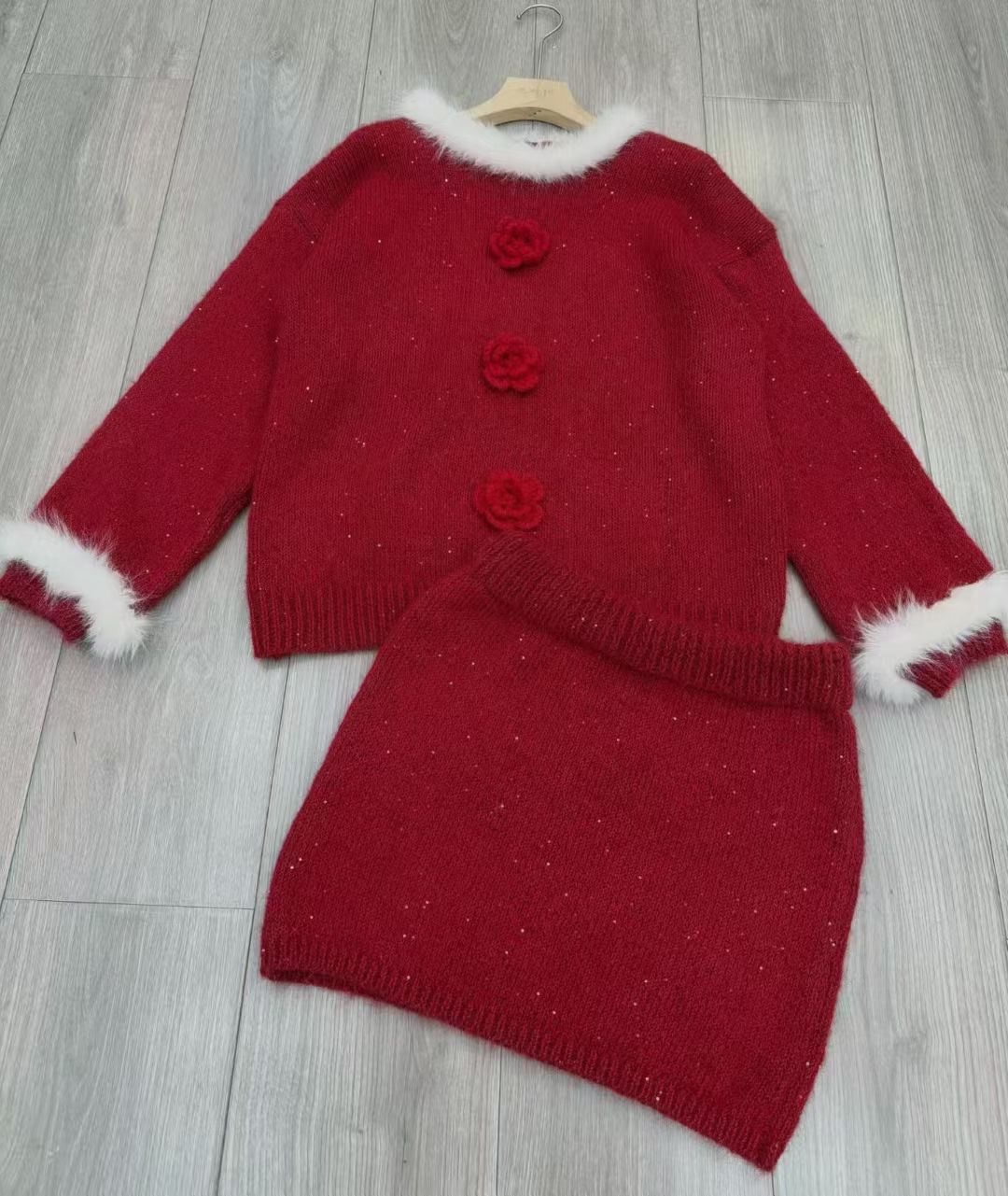 2025년 가을/겨울 트렌디 여성 신상 레드 루즈핏 플로럴 니트 스웨터 & 스커트 투피스 세트