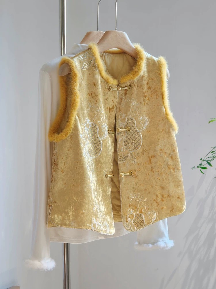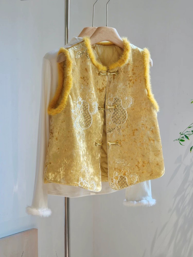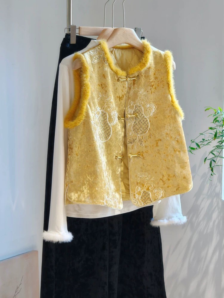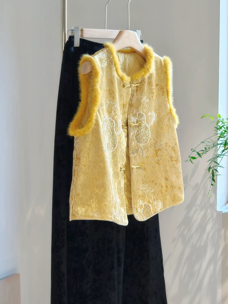 金黄色水貂毛丝绒马甲夹棉外穿高级感年轻洋气减龄马夹新中式短款