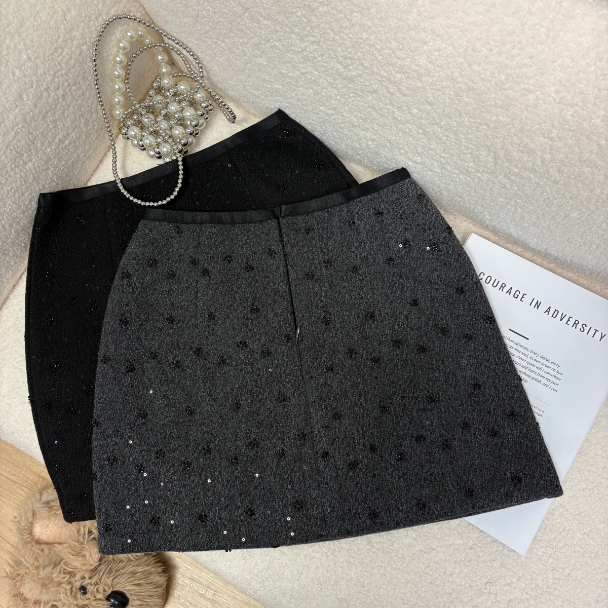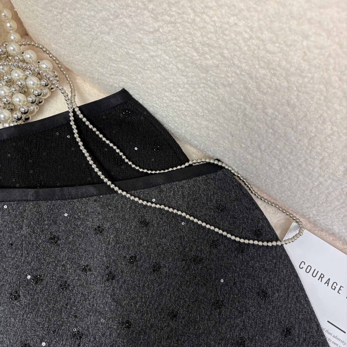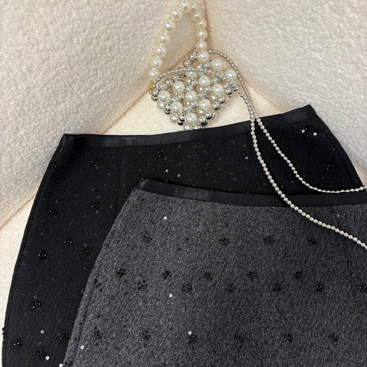 实拍 秋冬新款重工珠片小花朵毛呢半身裙法式气质小香风a字短裙
