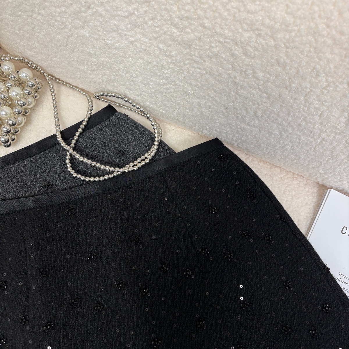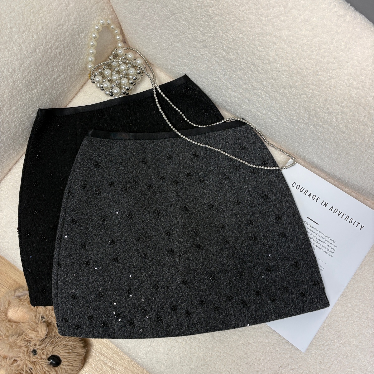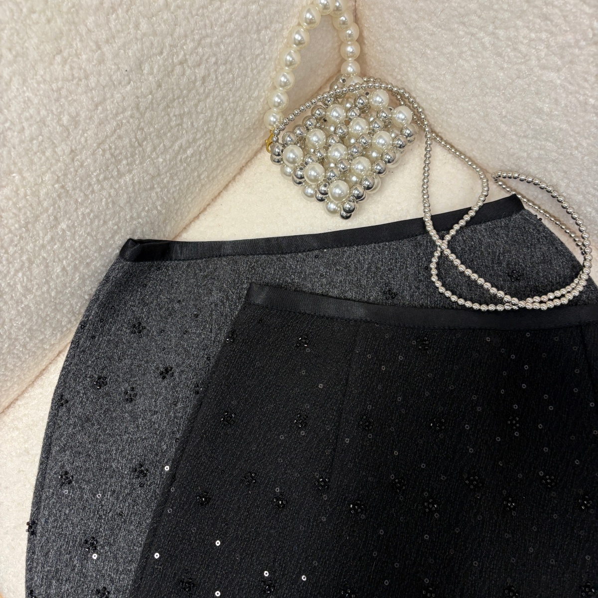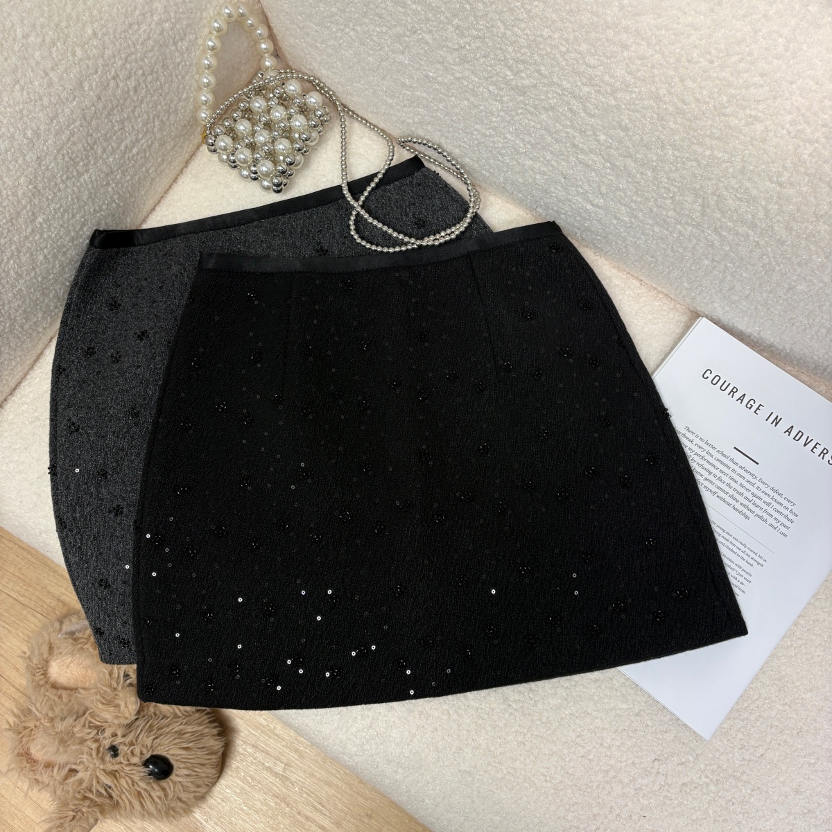 实拍 秋冬新款重工珠片小花朵毛呢半身裙法式气质小香风a字短裙