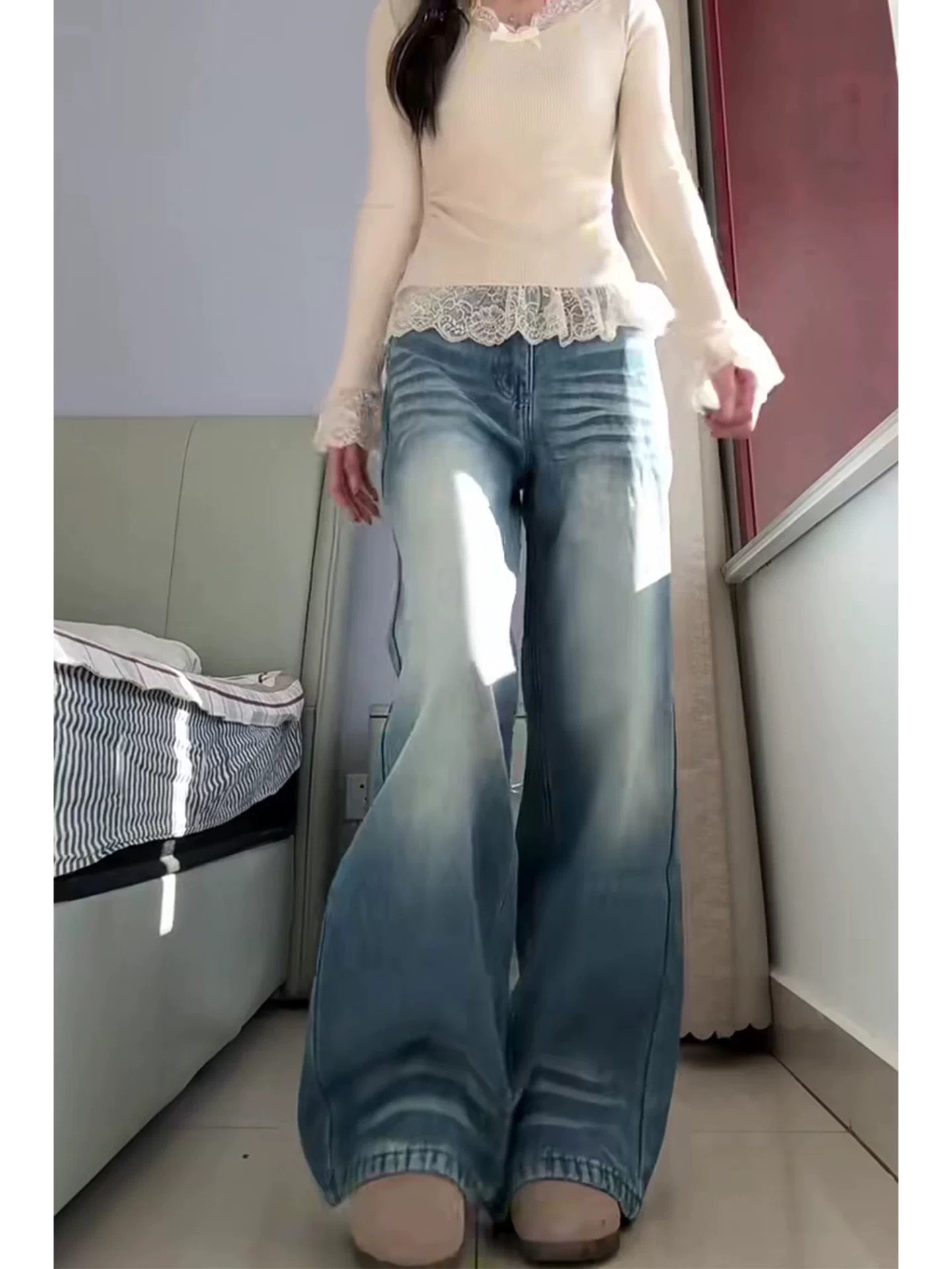 美式复古浅色阔腿牛仔裤女2025秋冬新款宽松显瘦垂感直筒拖地裤子