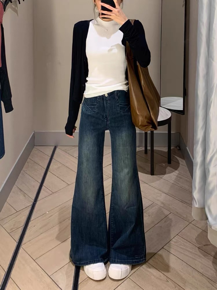 여성용 레트로 스타일 플레어 진, 하이웨이스트, 신축성, 슬림핏, 와이드 레그, 스트레이트 레그, 트렌디한 디자인.