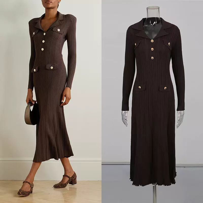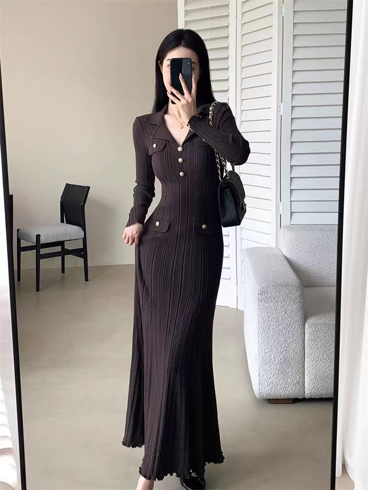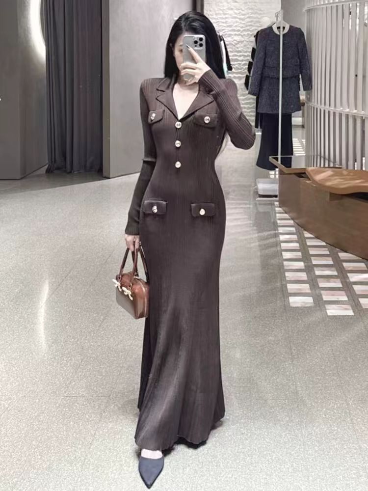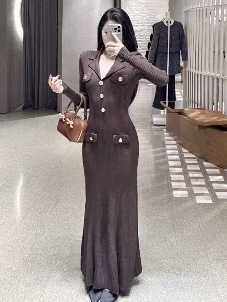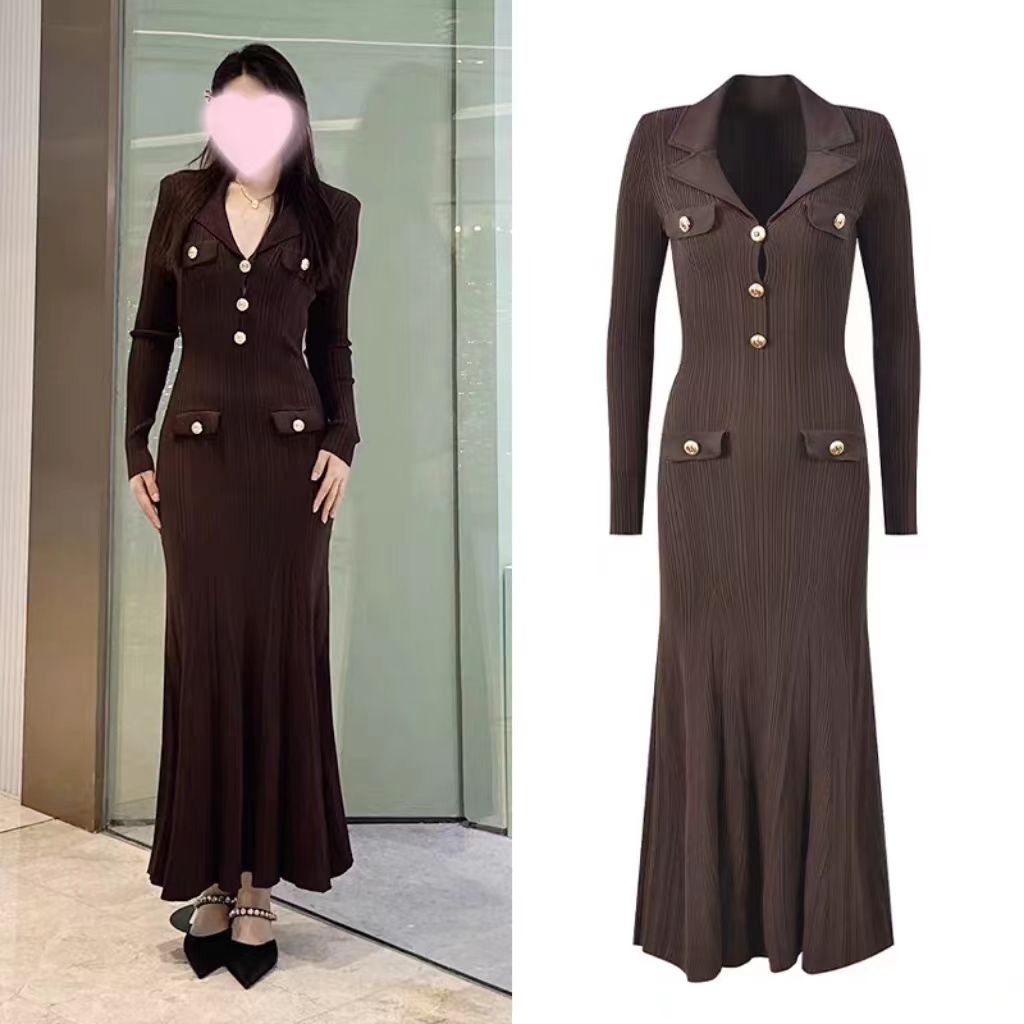 韩国名媛风金属扣长袖修身显瘦针织连衣裙百搭气质优雅鱼尾长裙