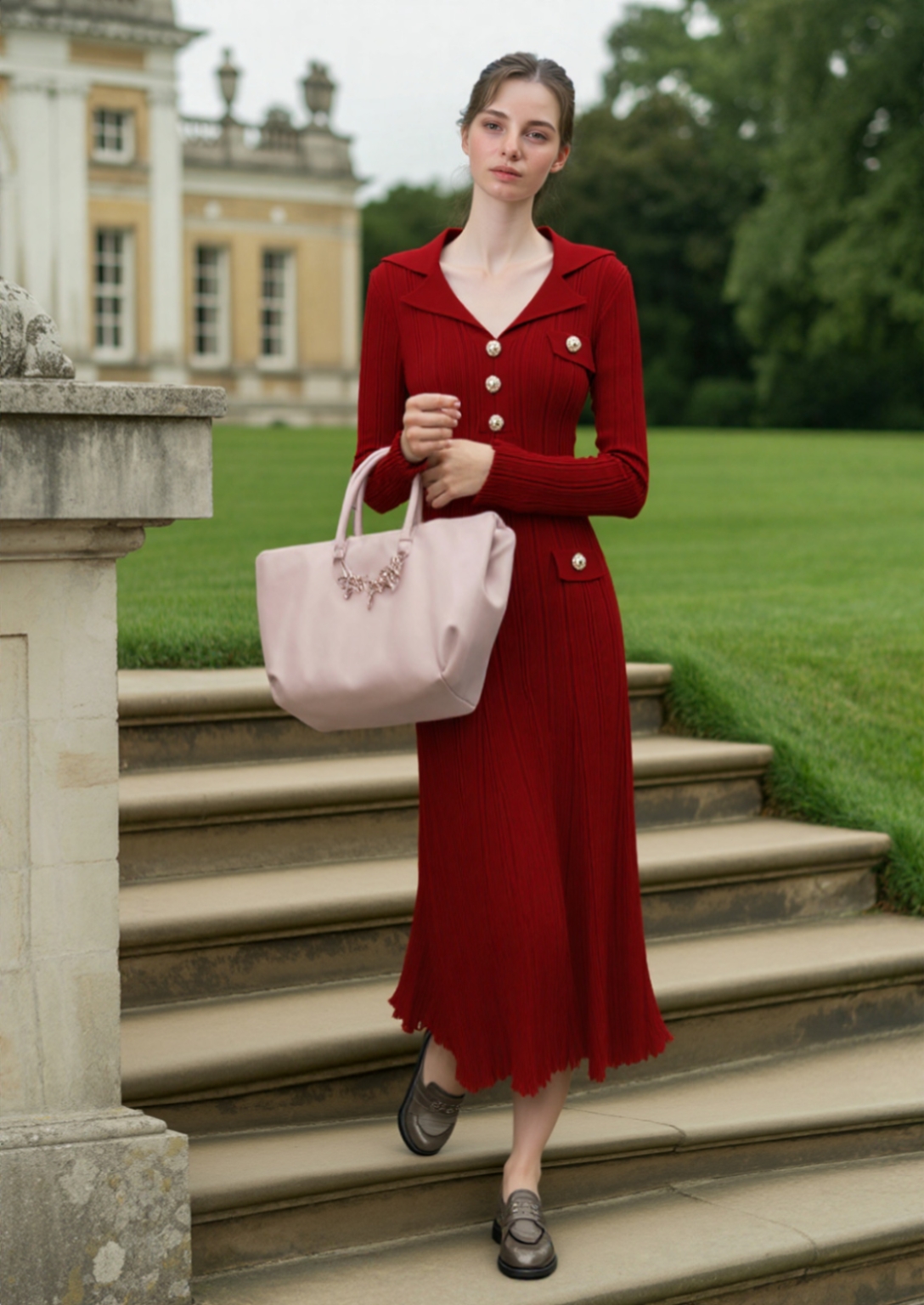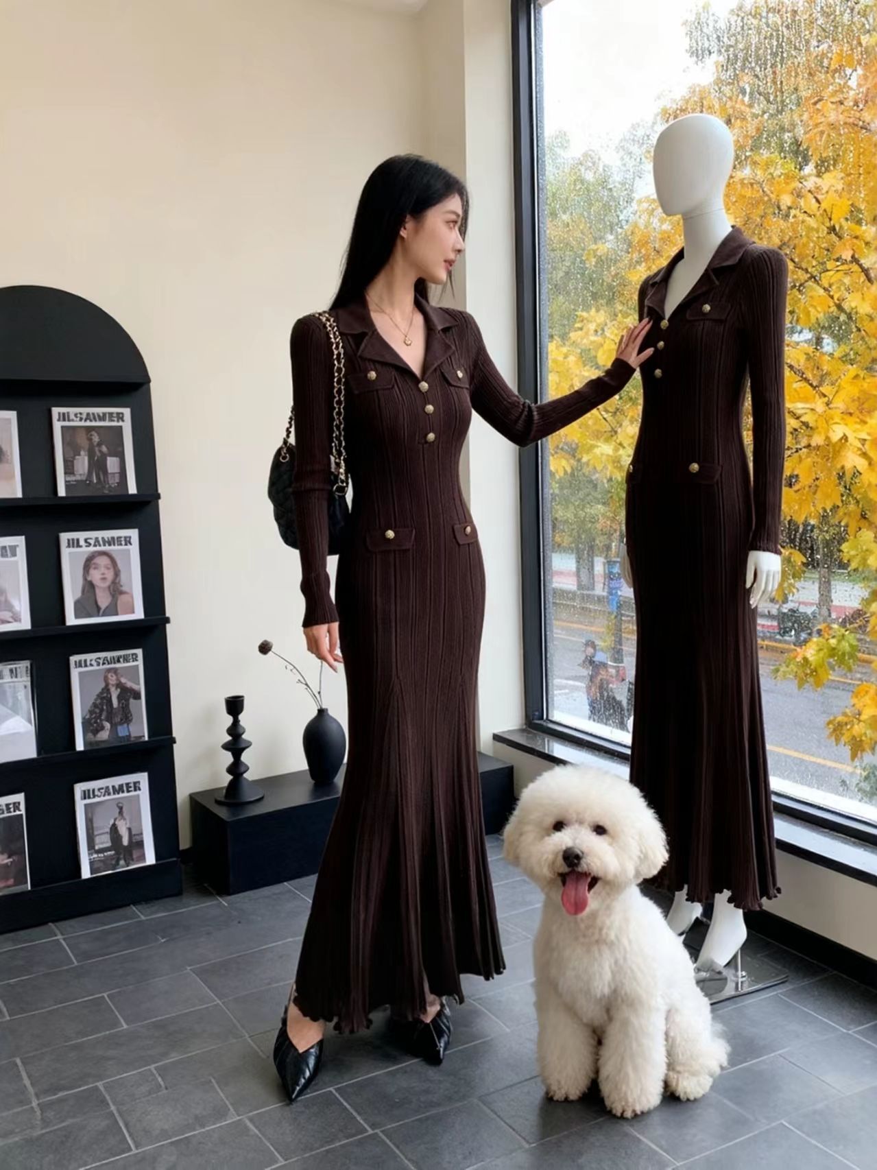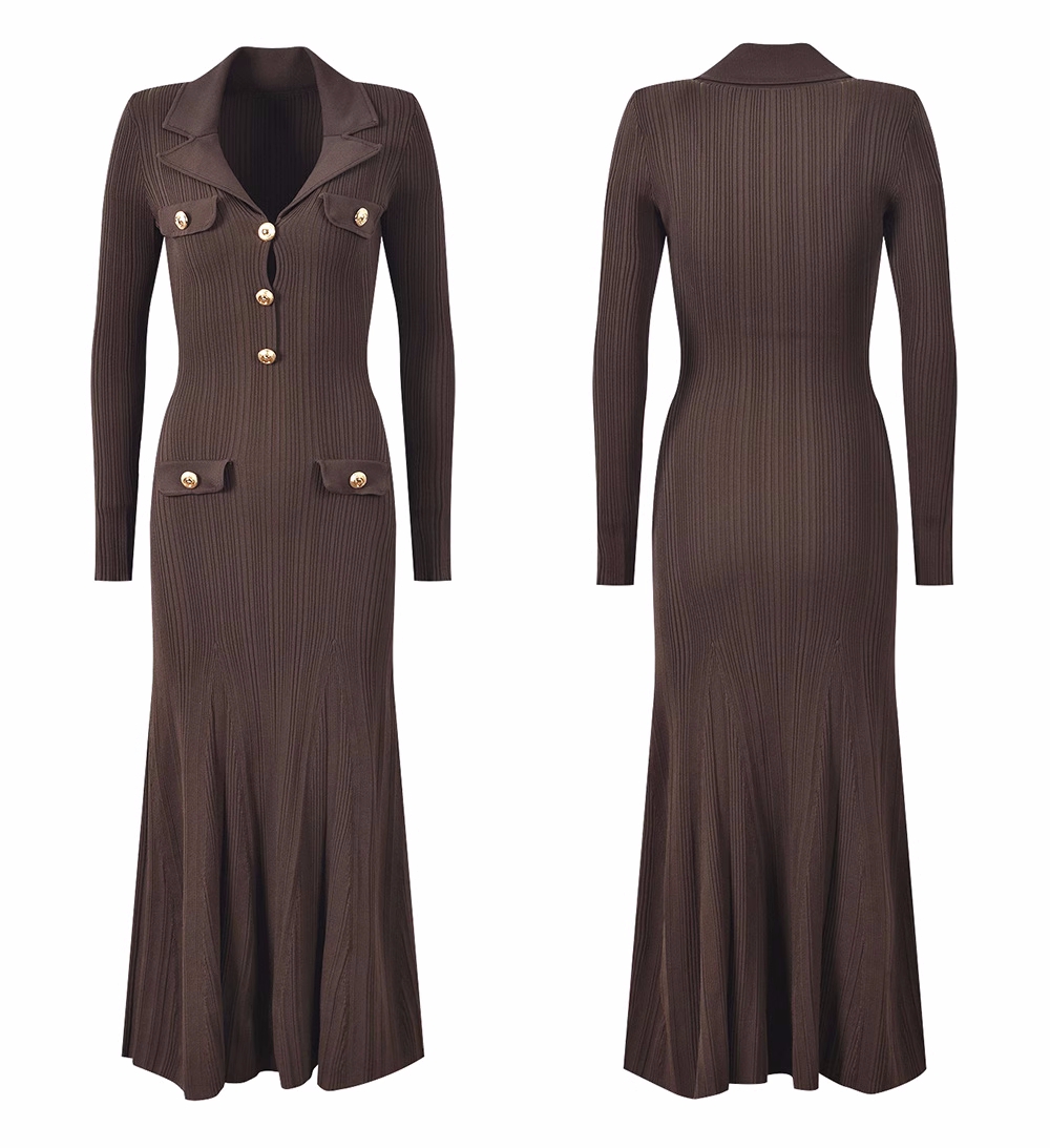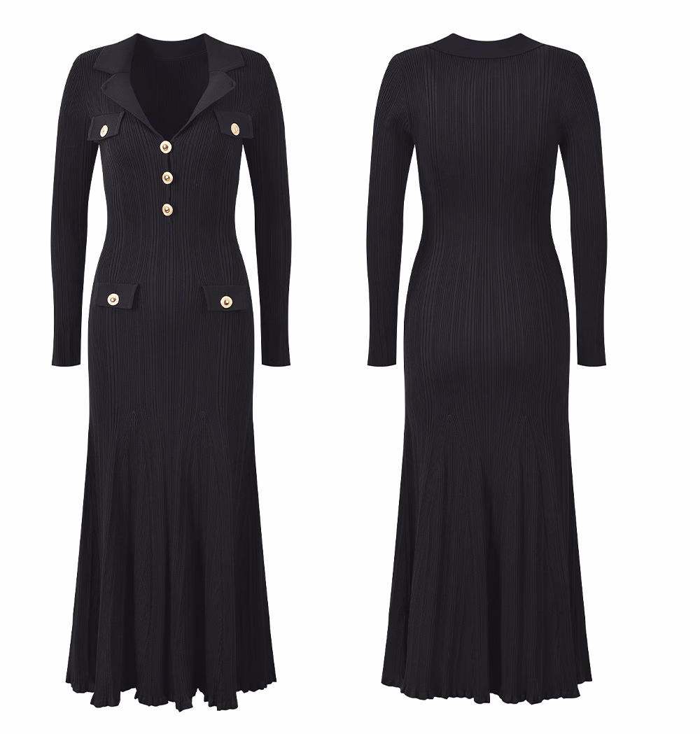 韩国名媛风金属扣长袖修身显瘦针织连衣裙百搭气质优雅鱼尾长裙