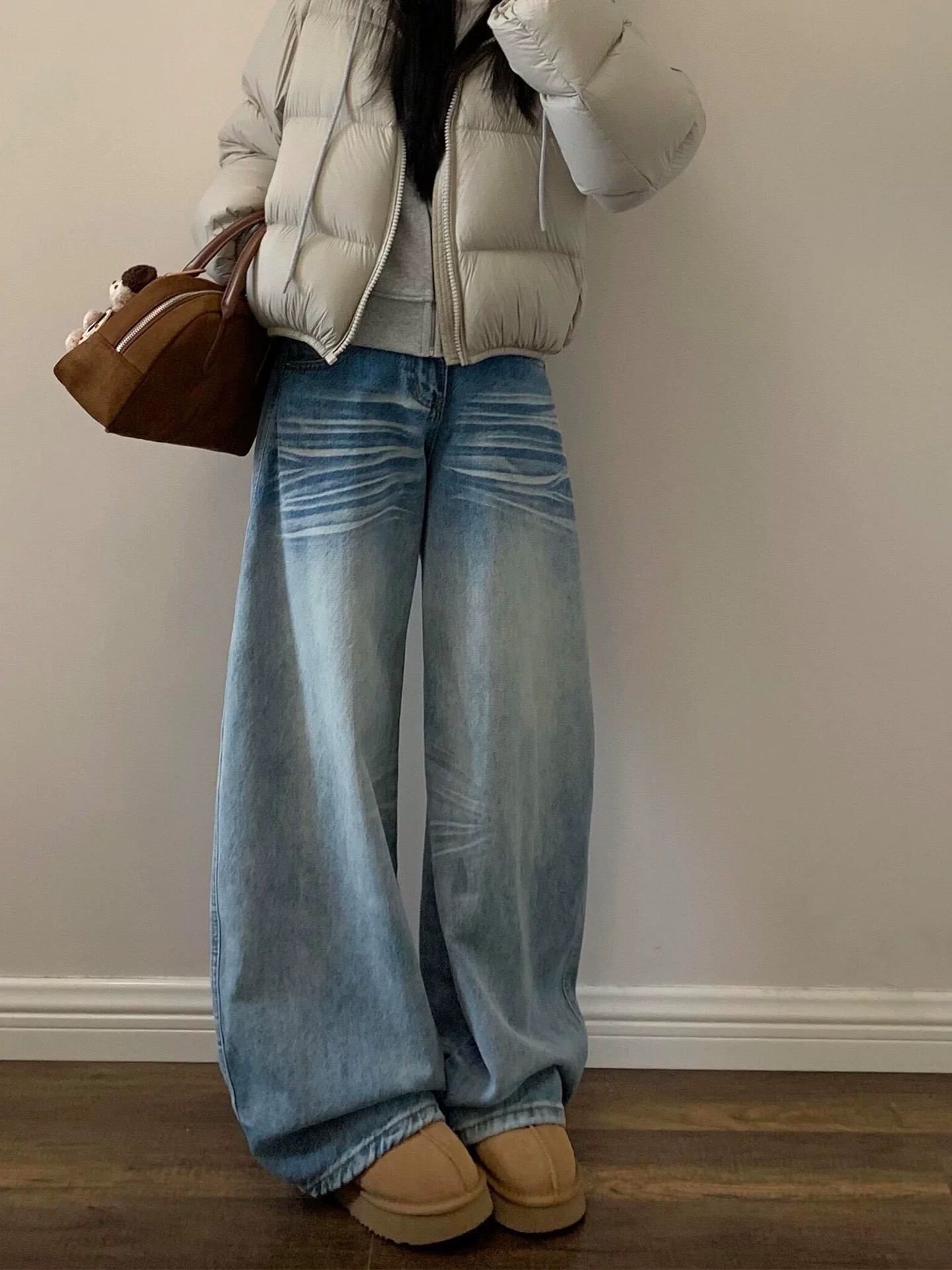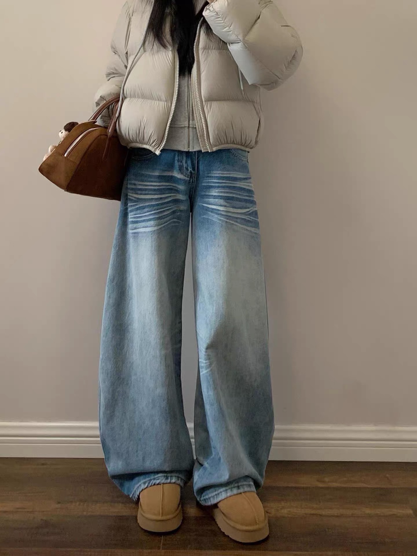 美式水洗立体猫须低腰牛仔裤女2025秋冬季新款宽松显瘦百搭阔腿裤
