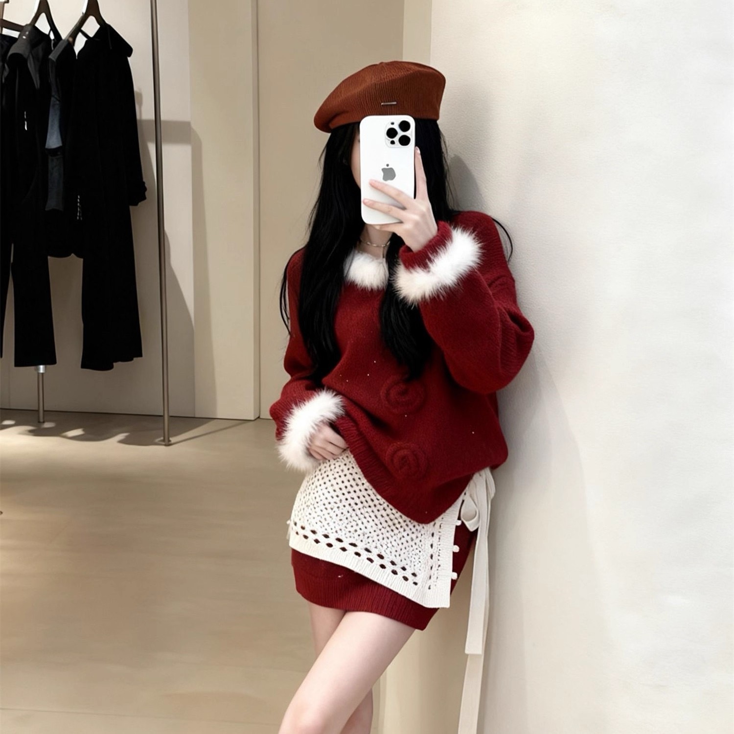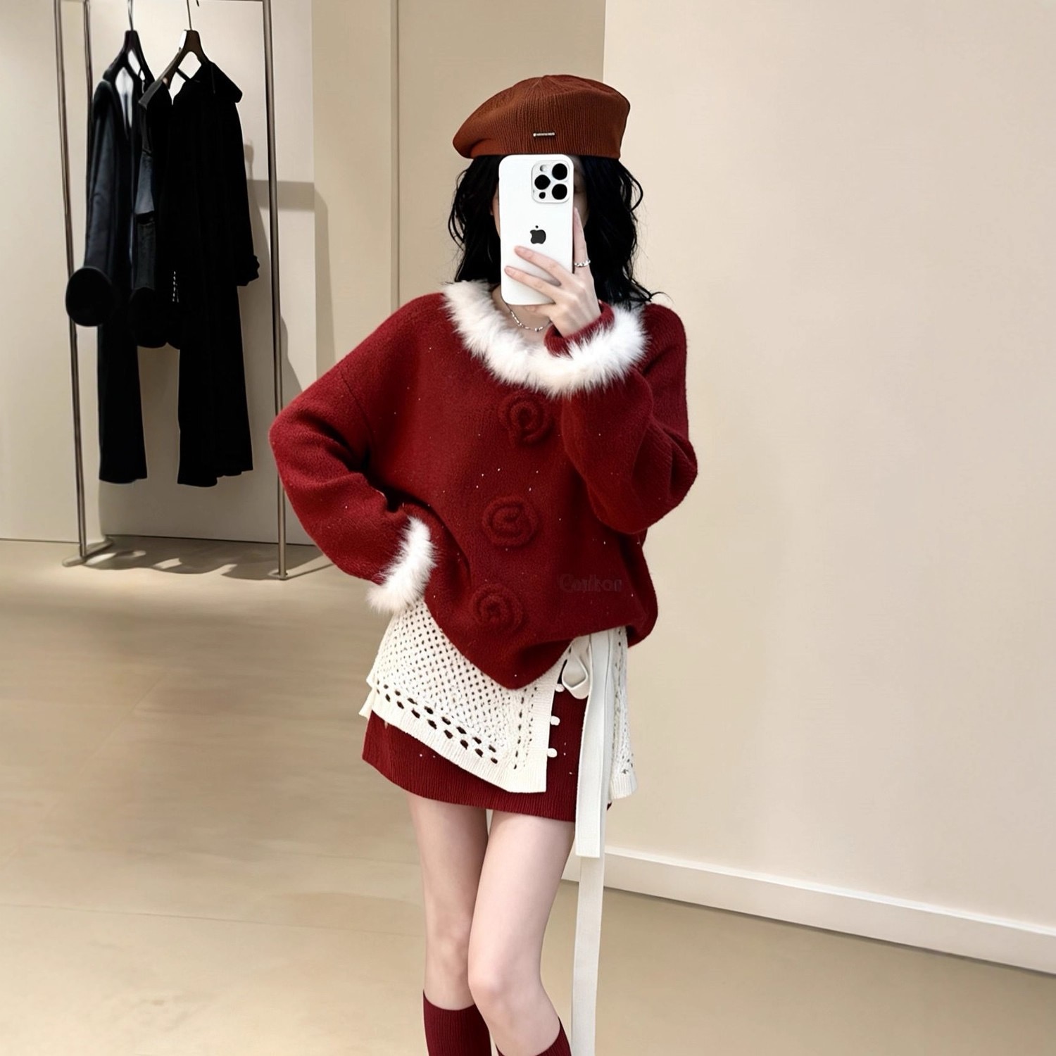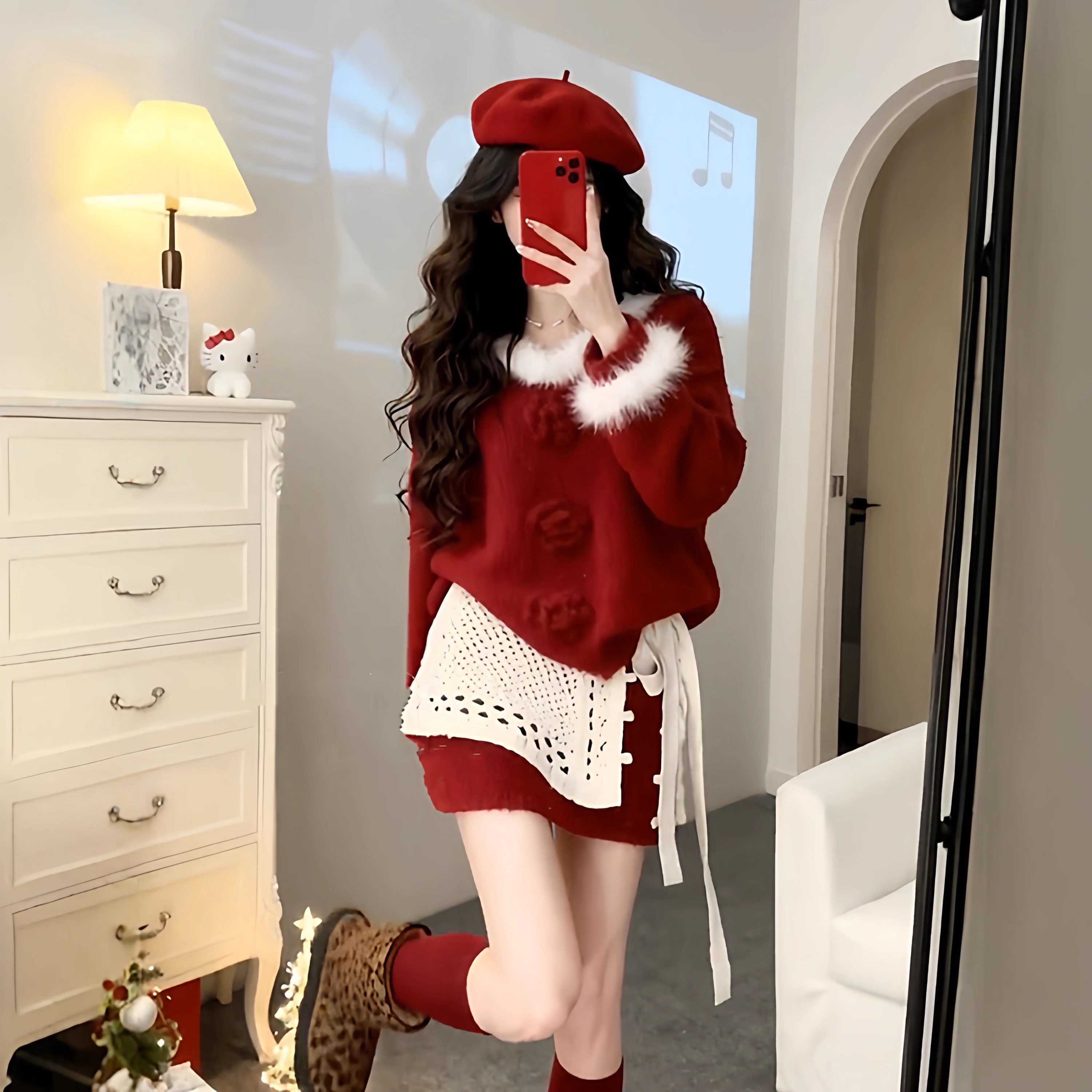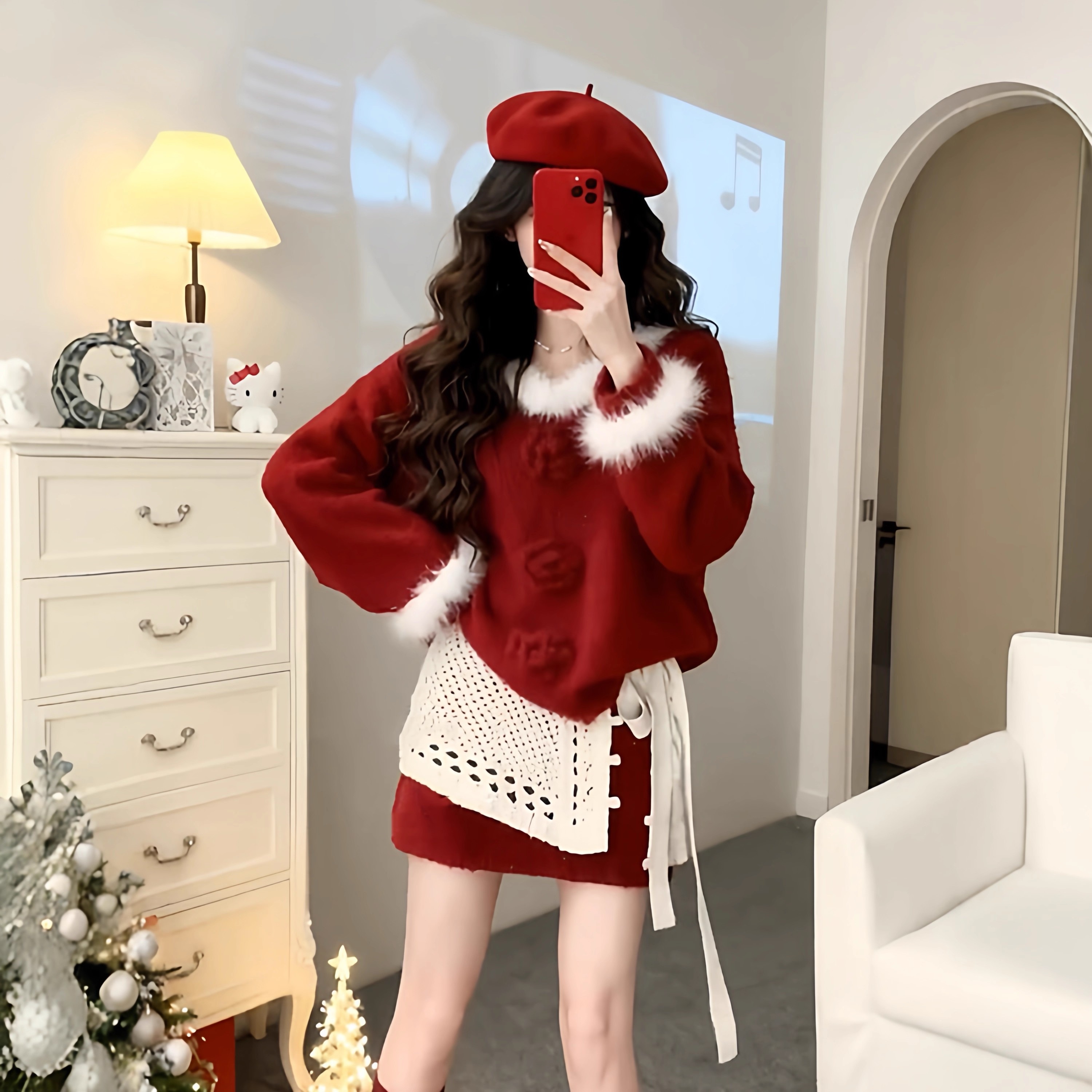 新年圣诞红色穿搭一整套女秋冬针织毛绒花边领上衣搭配屁帘款半裙