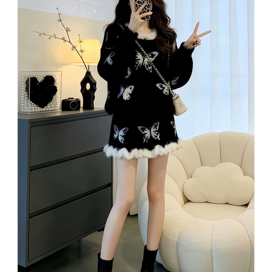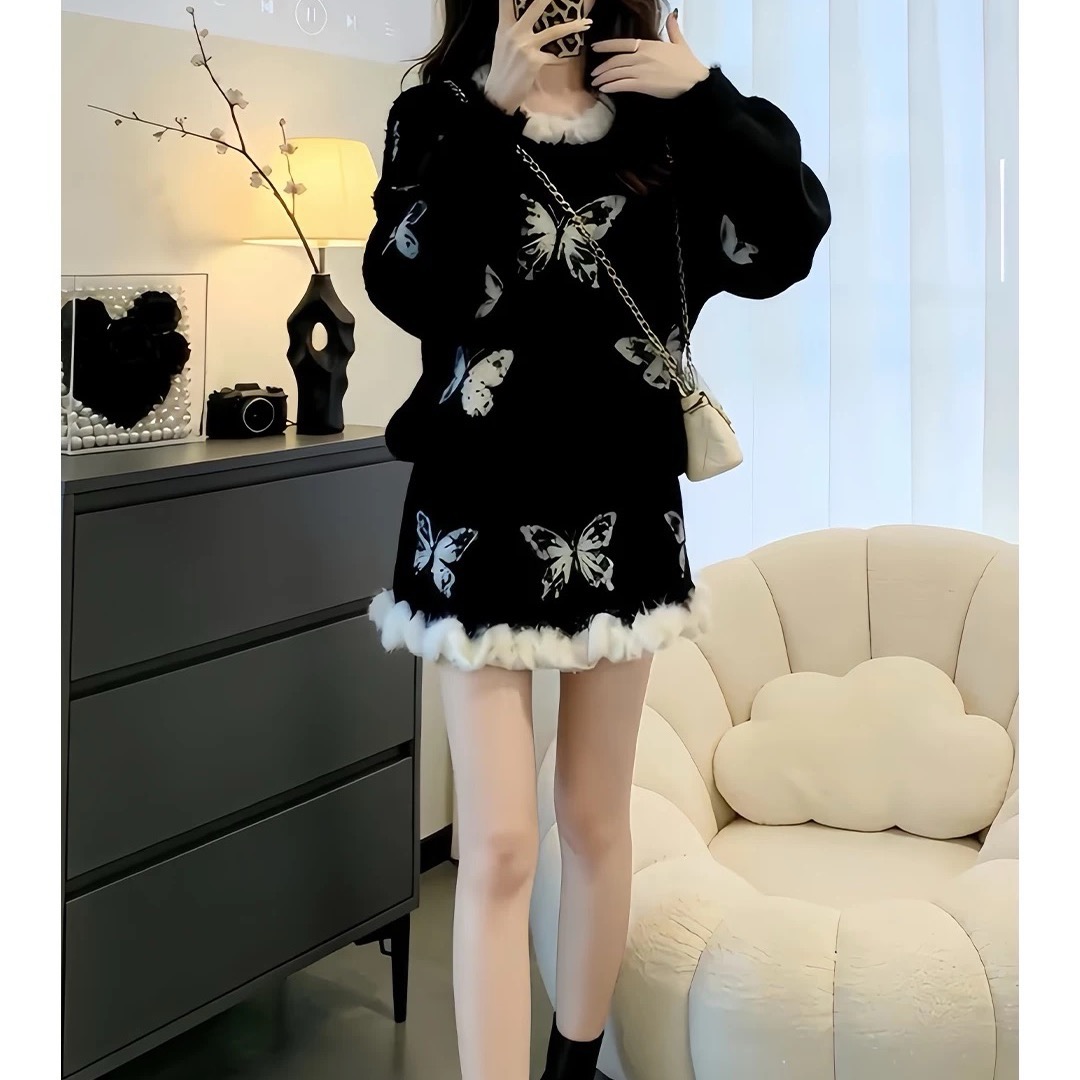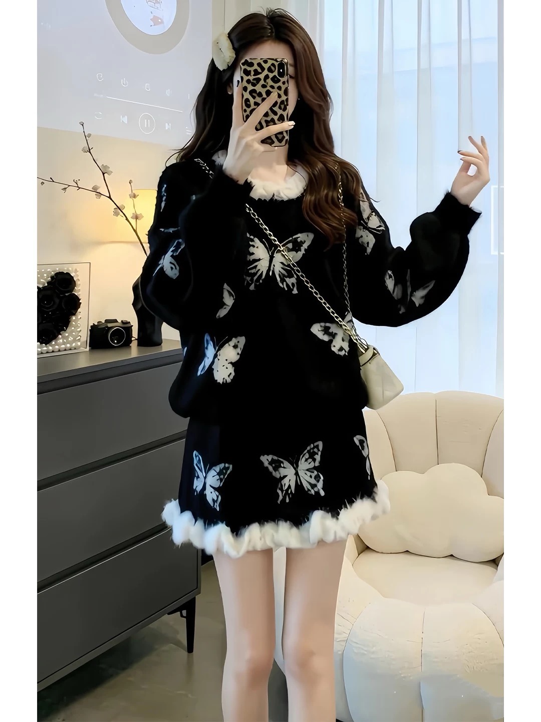 韩风chic一整套温柔风巨好看复古黑色针织衫短裙两件套装2025冬季