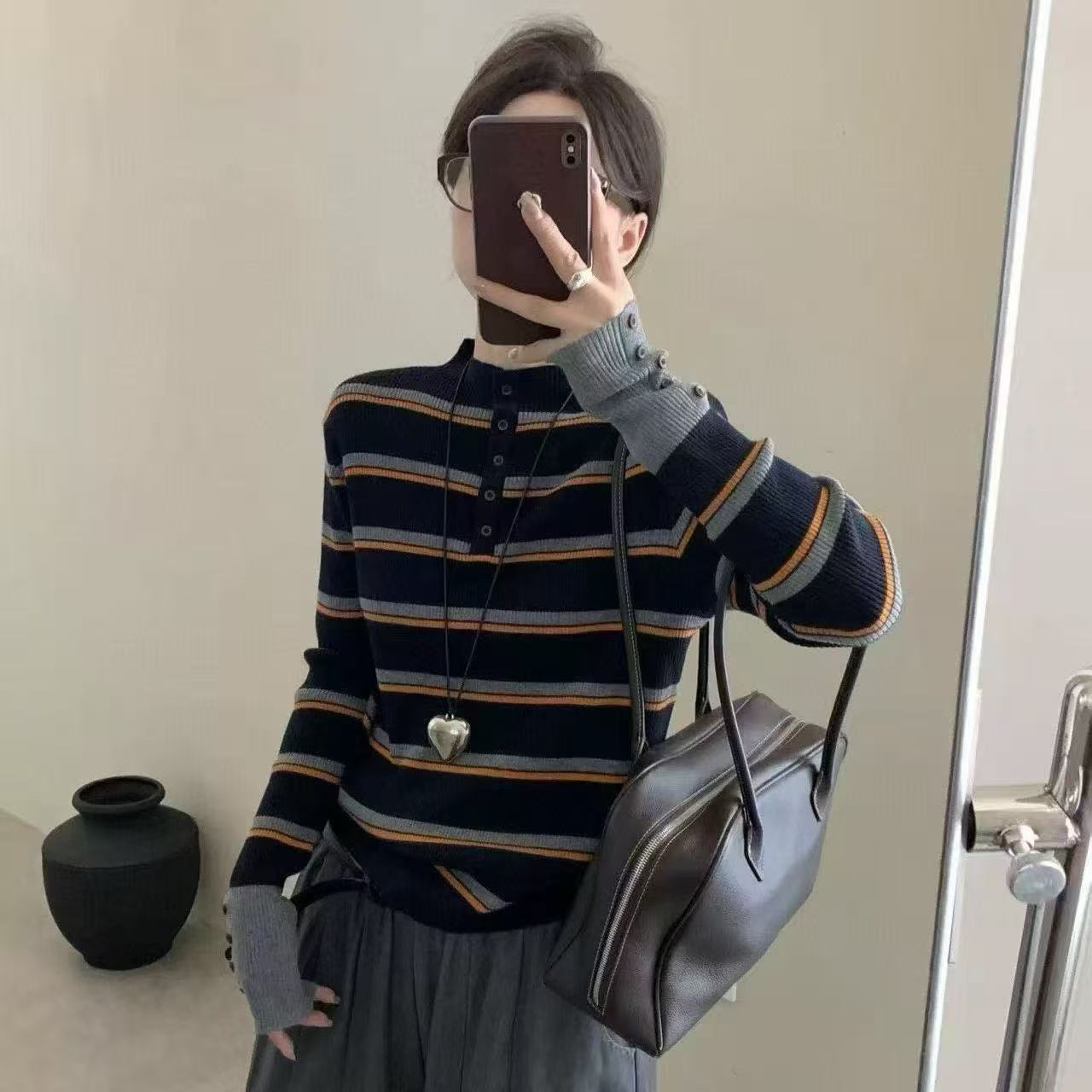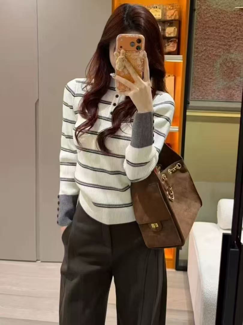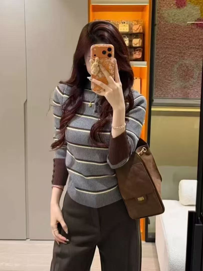 加厚韩系chic条纹半高领针织打底衫女秋冬修身显瘦内搭小众上衣