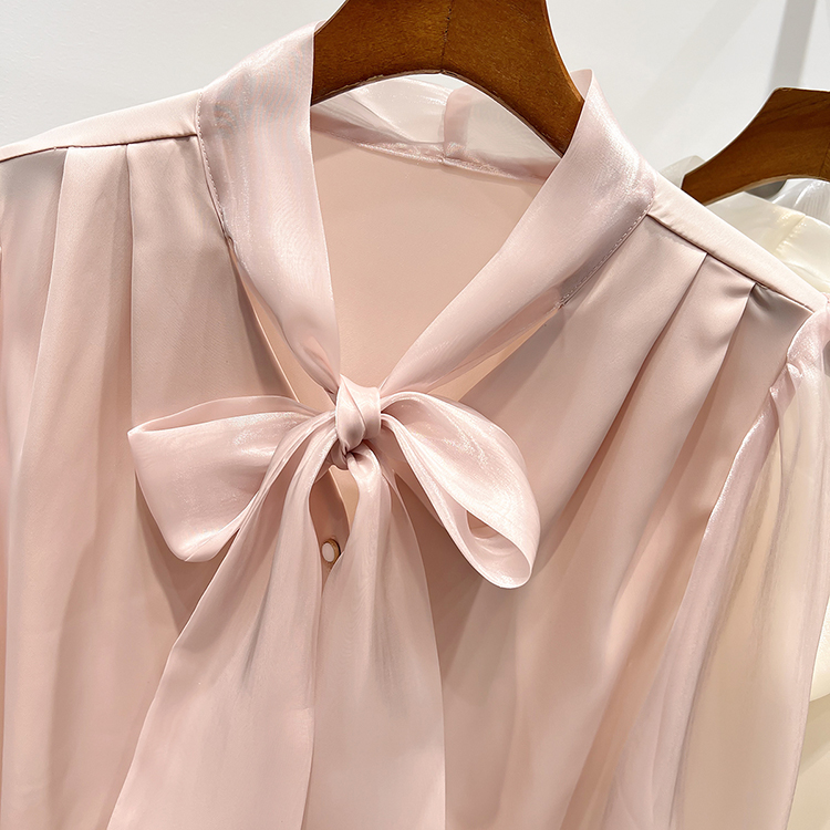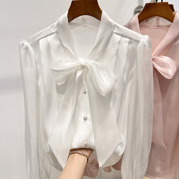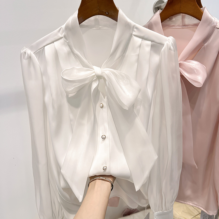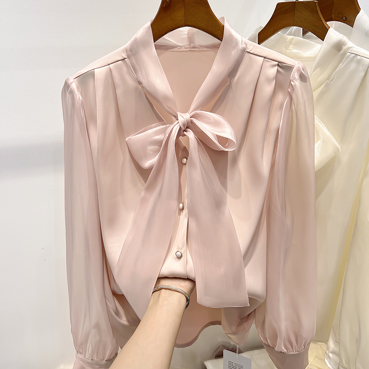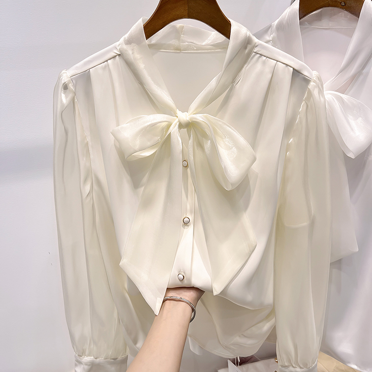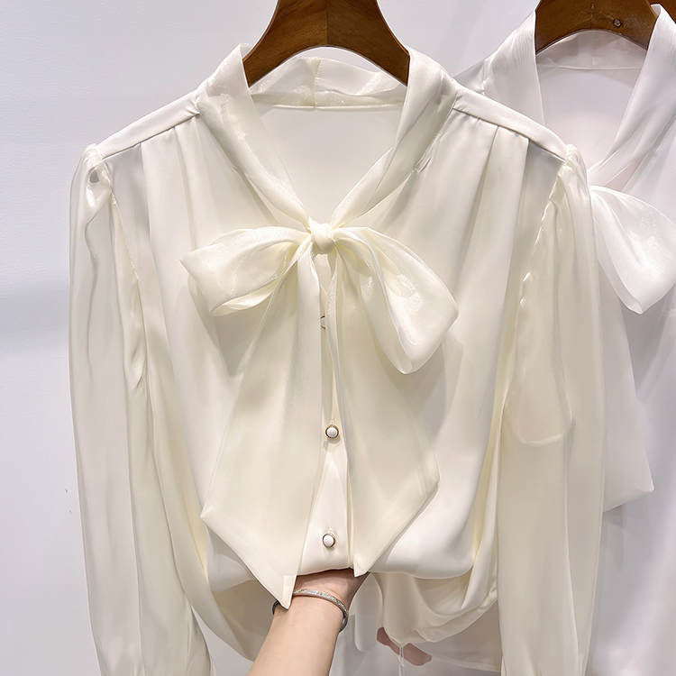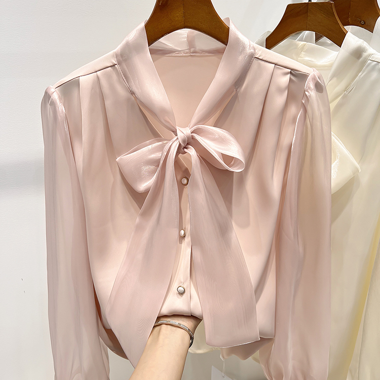 网图 欧货气质显瘦纯色V领欧根纱系带单排扣长袖雪纺衬衫女春