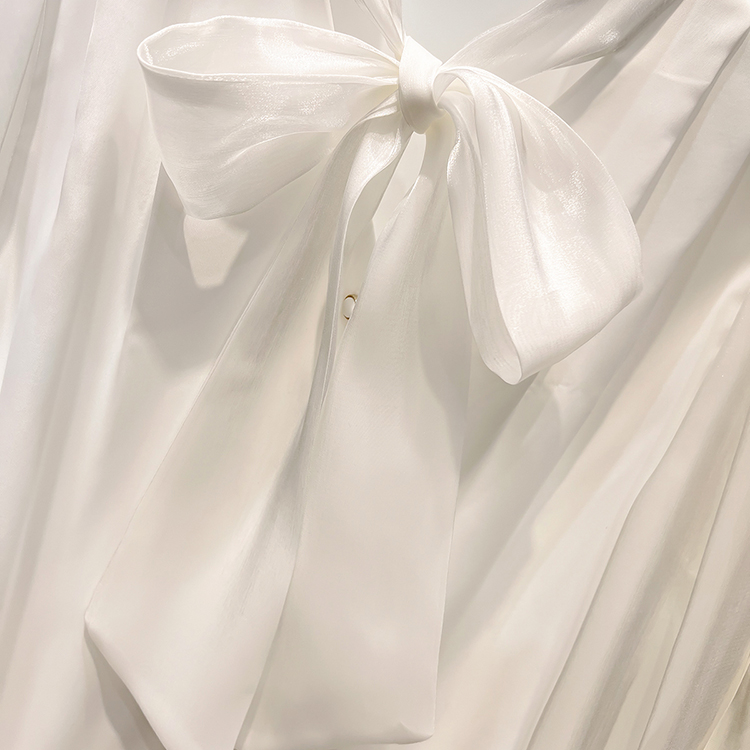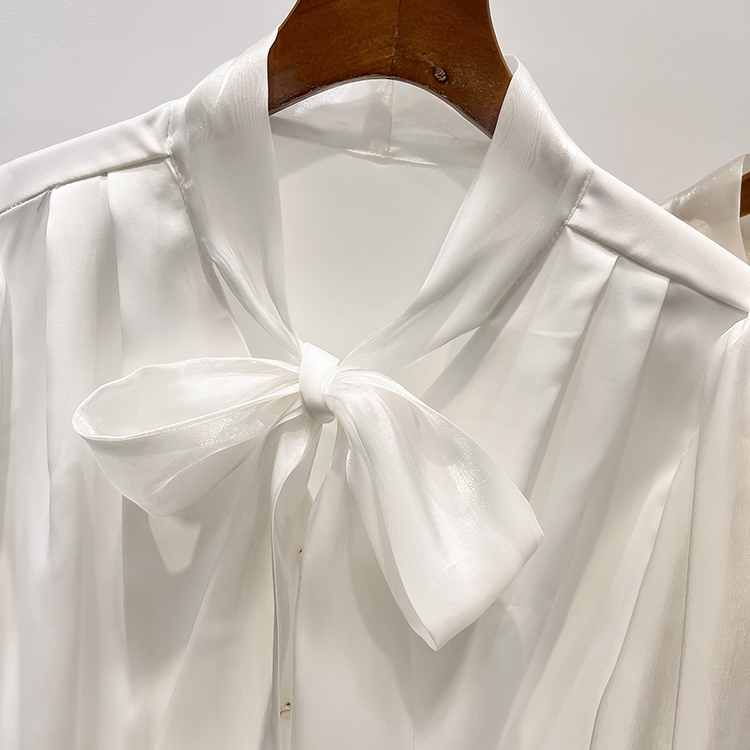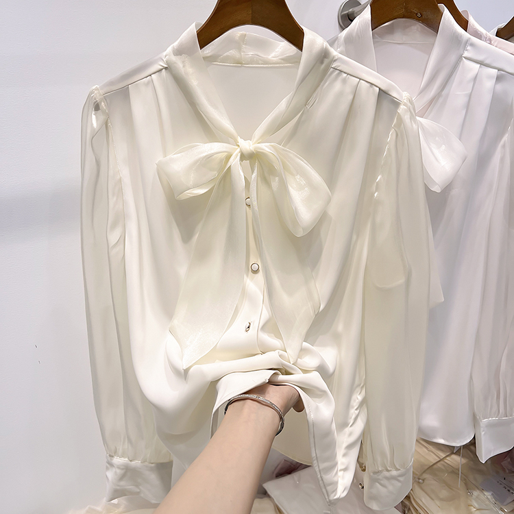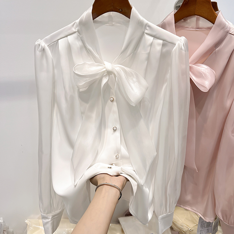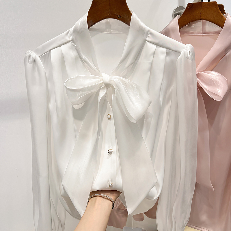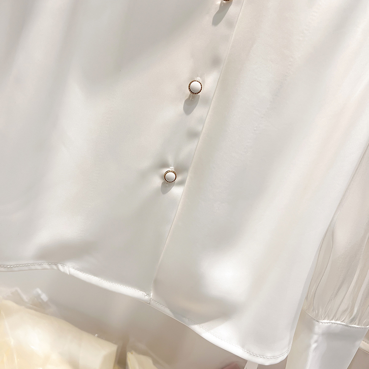 网图 欧货气质显瘦纯色V领欧根纱系带单排扣长袖雪纺衬衫女春