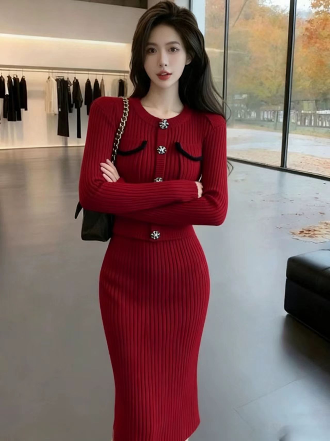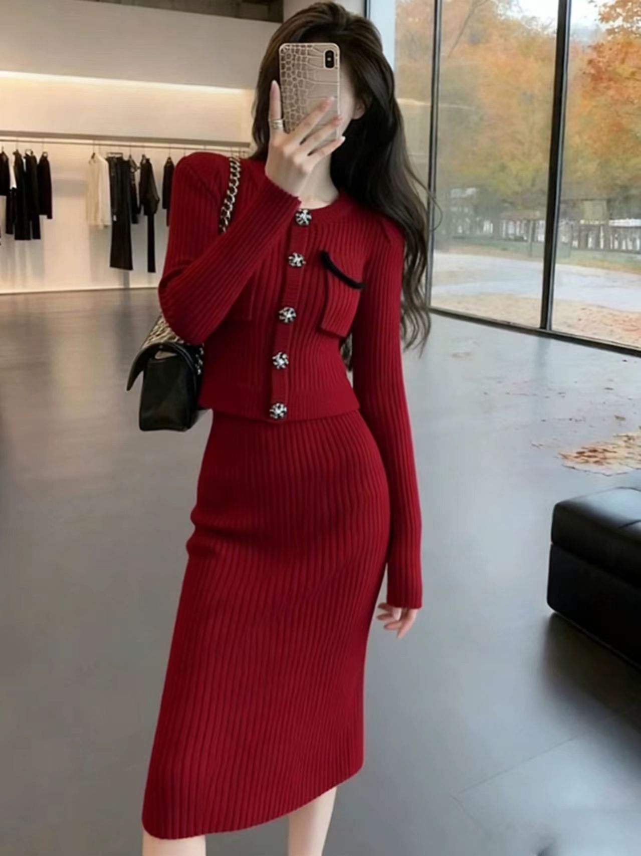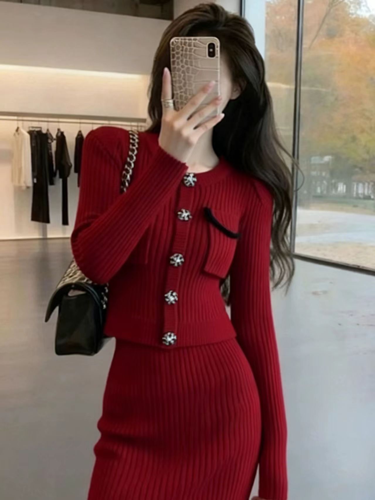 韩国富家千金miu系圣诞新年红色连衣裙套装冬女小香风高级感套裙