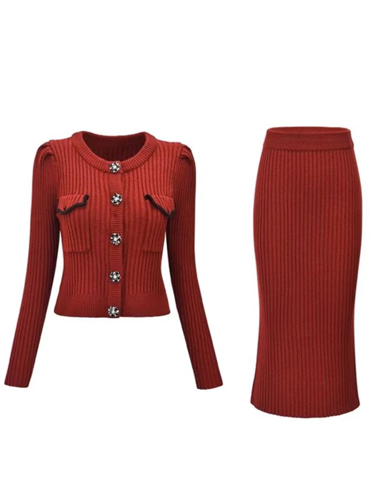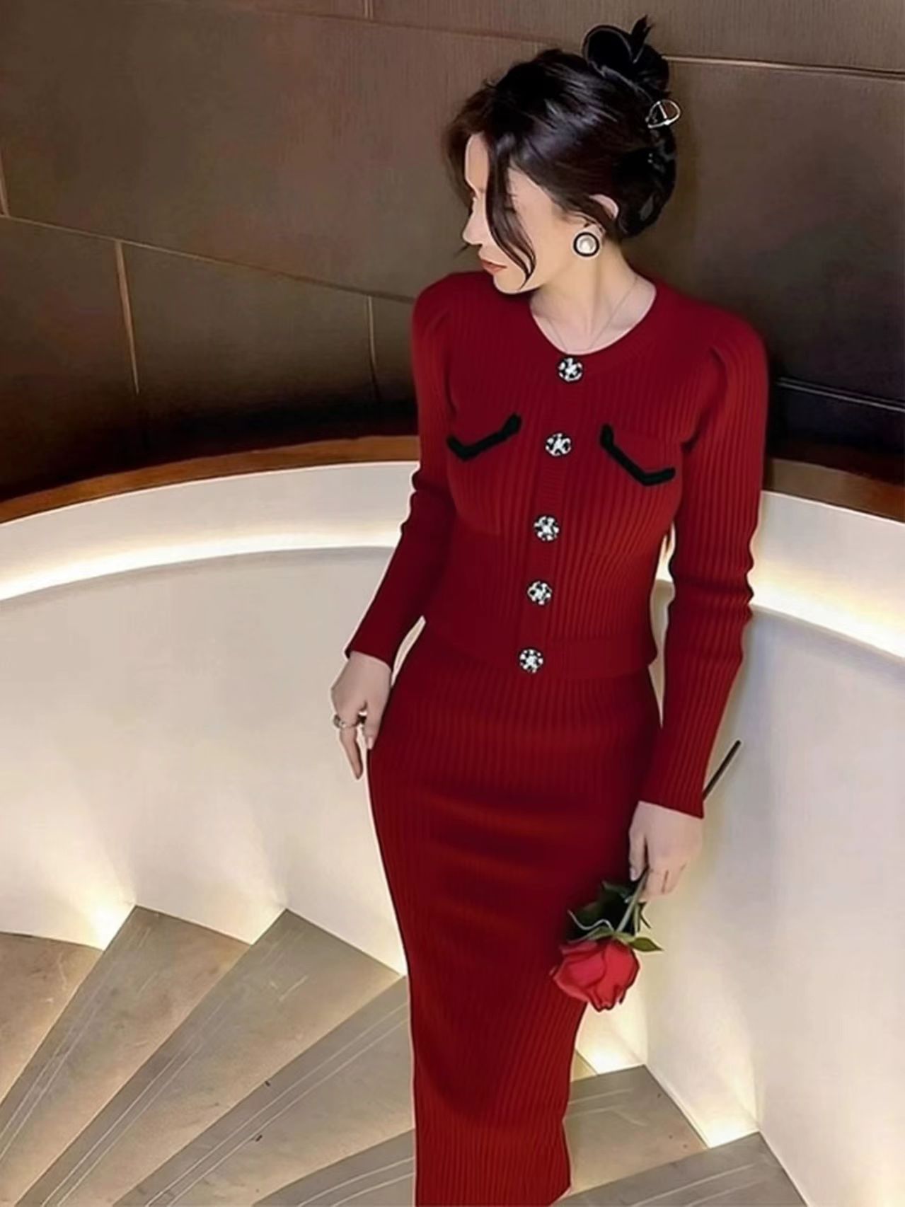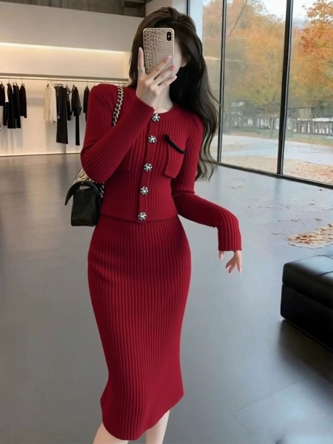 韩国富家千金miu系圣诞新年红色连衣裙套装冬女小香风高级感套裙
