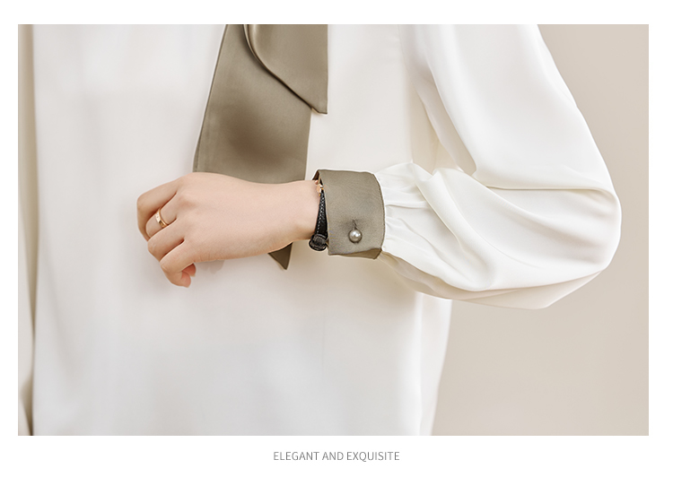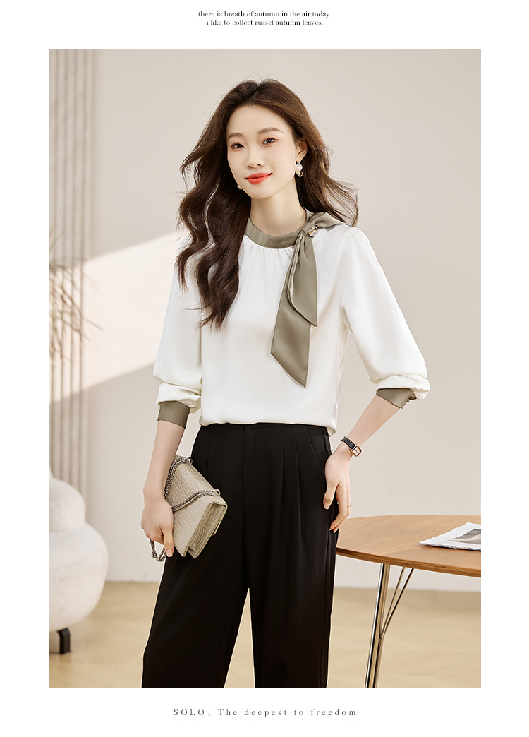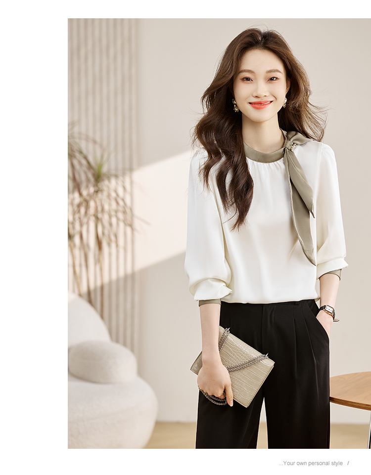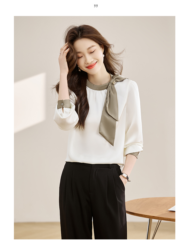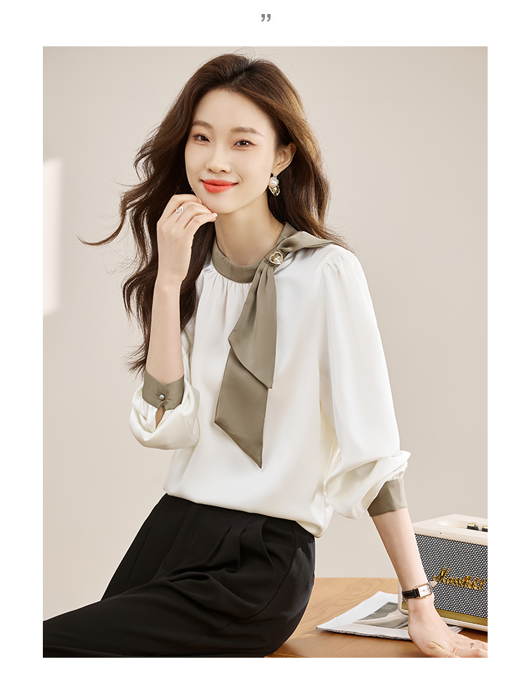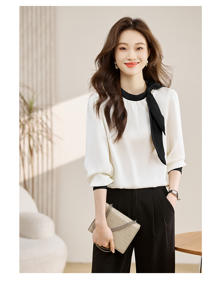 法式温柔领口蝴蝶结衬衫女装2026春秋新款拼色飘带设计感缎面上衣