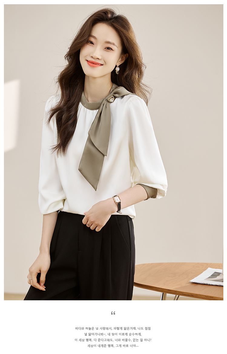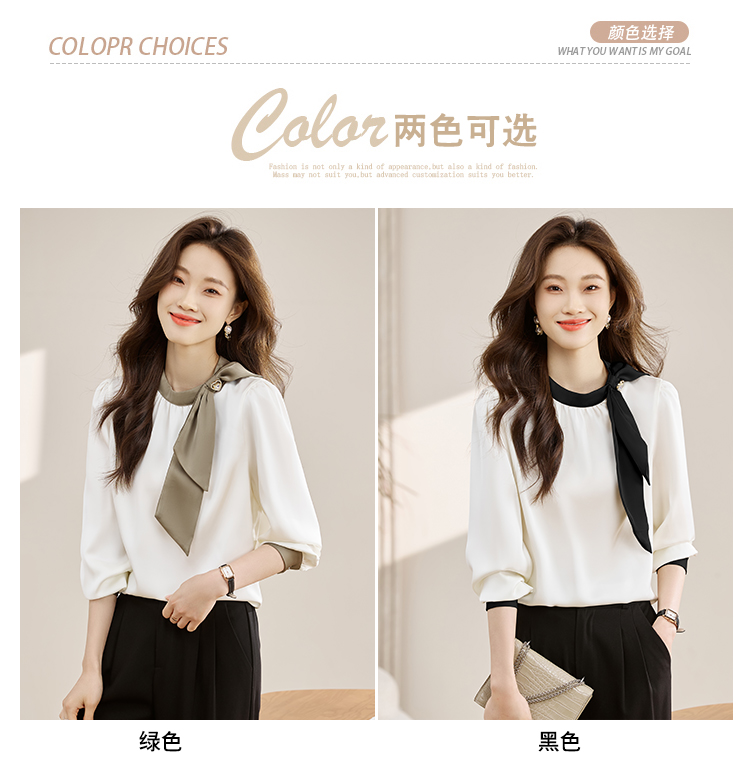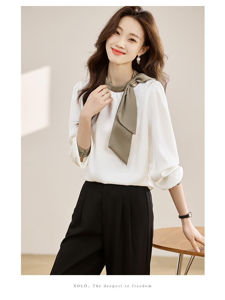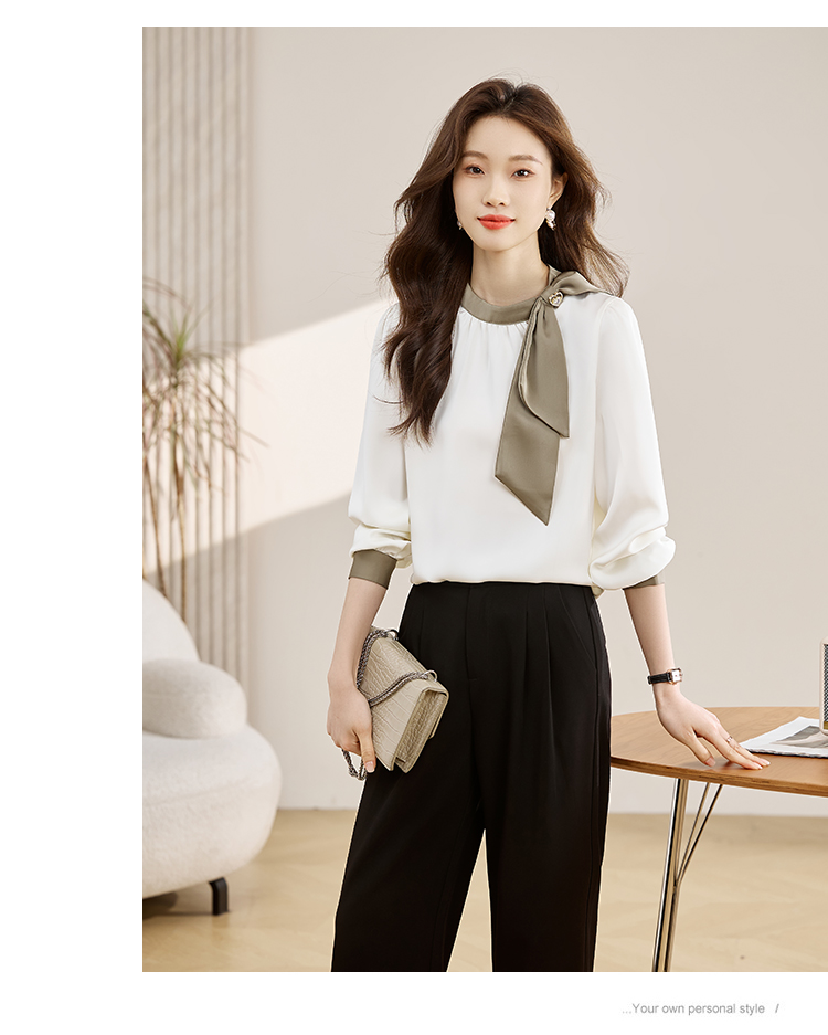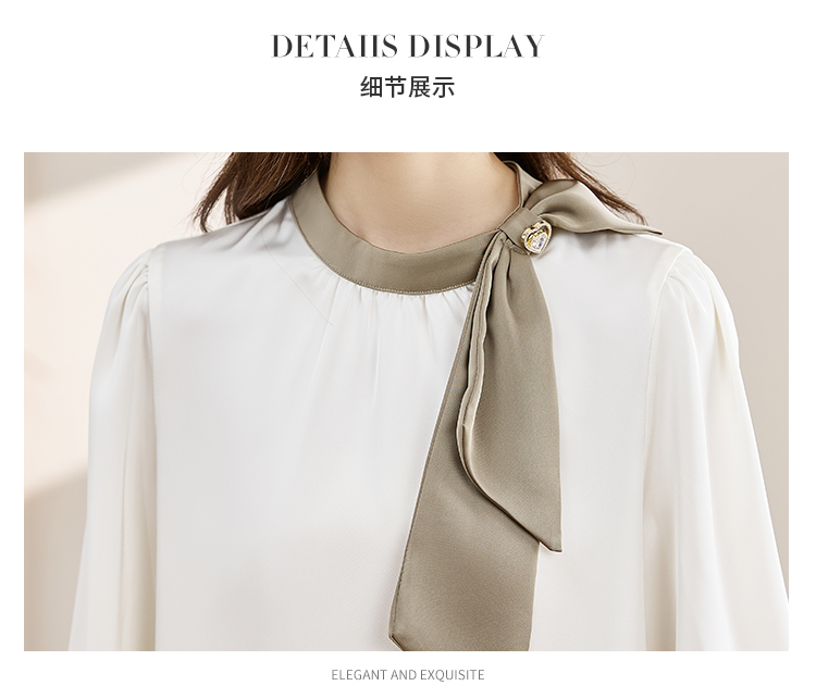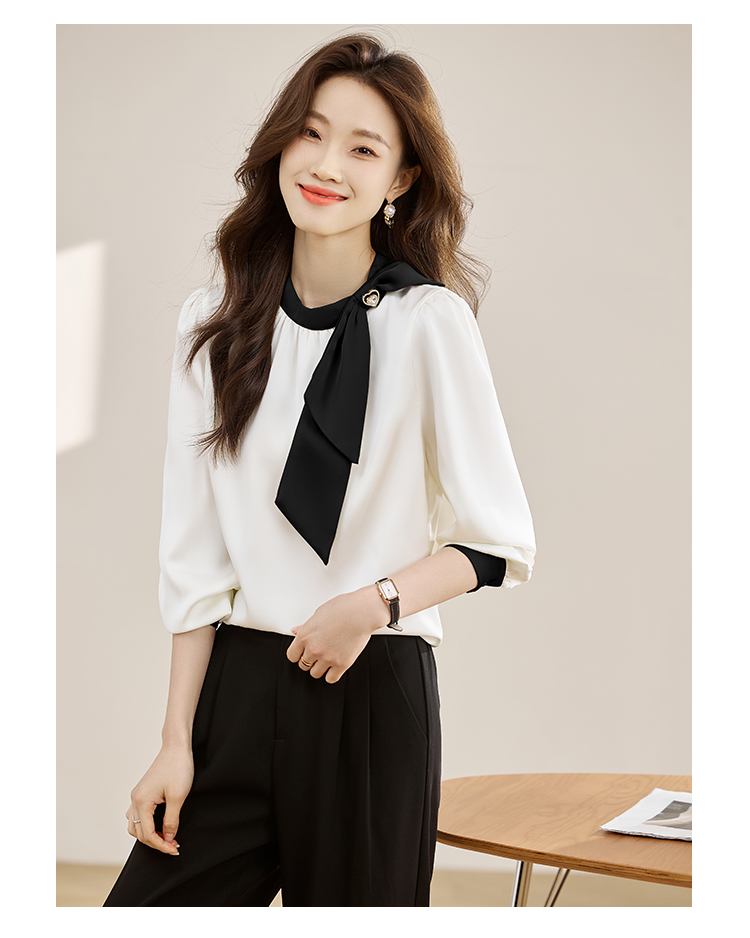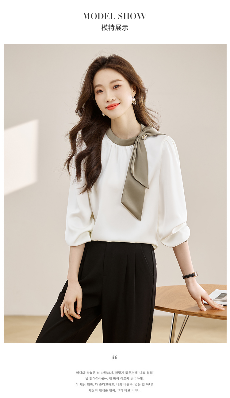 法式温柔领口蝴蝶结衬衫女装2026春秋新款拼色飘带设计感缎面上衣