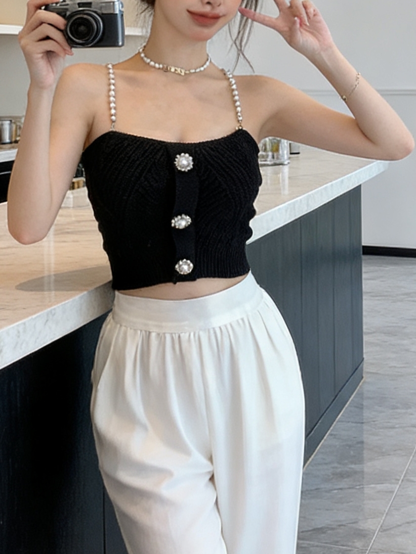 重工珍珠肩带亮钻扣子短款背心抹胸2025春夏季新款美背女针织吊带