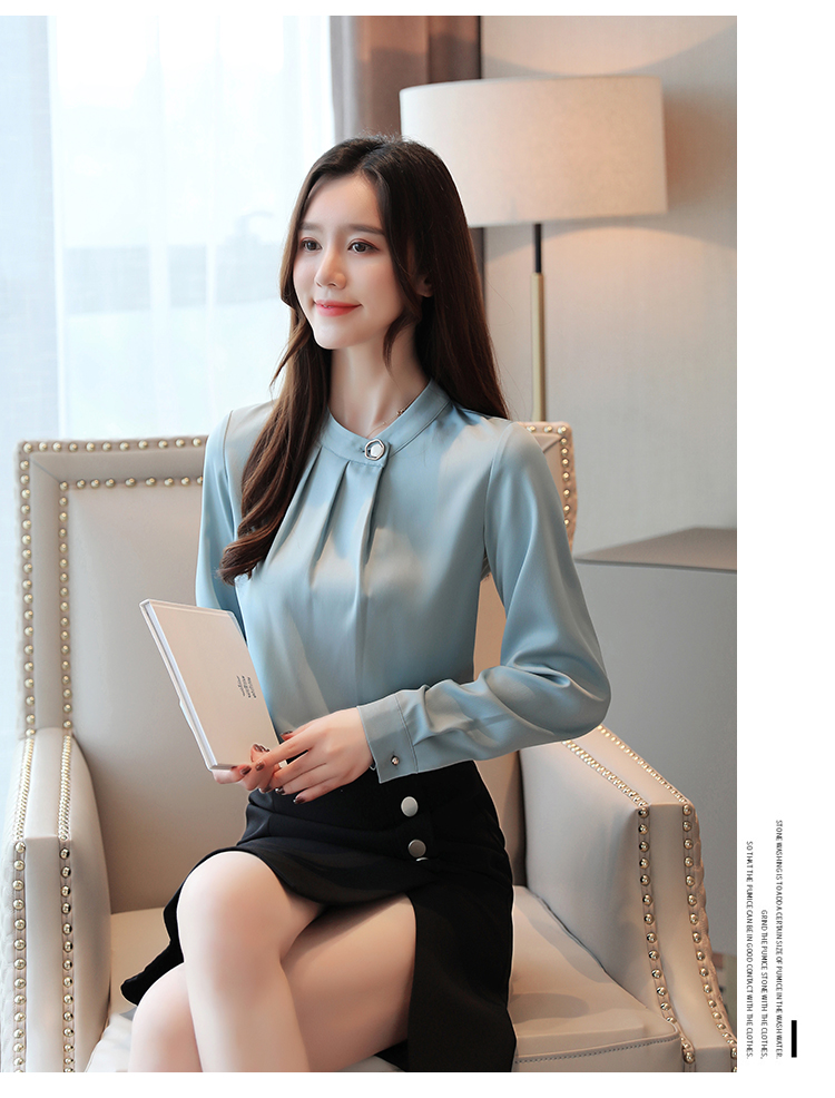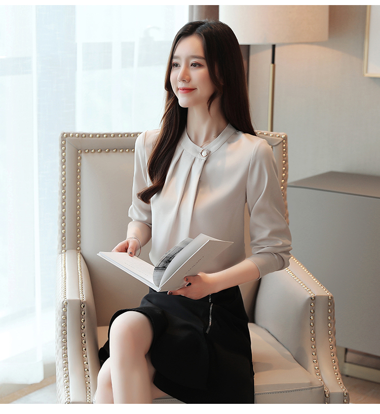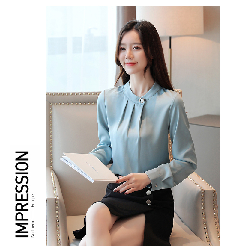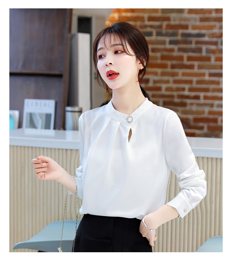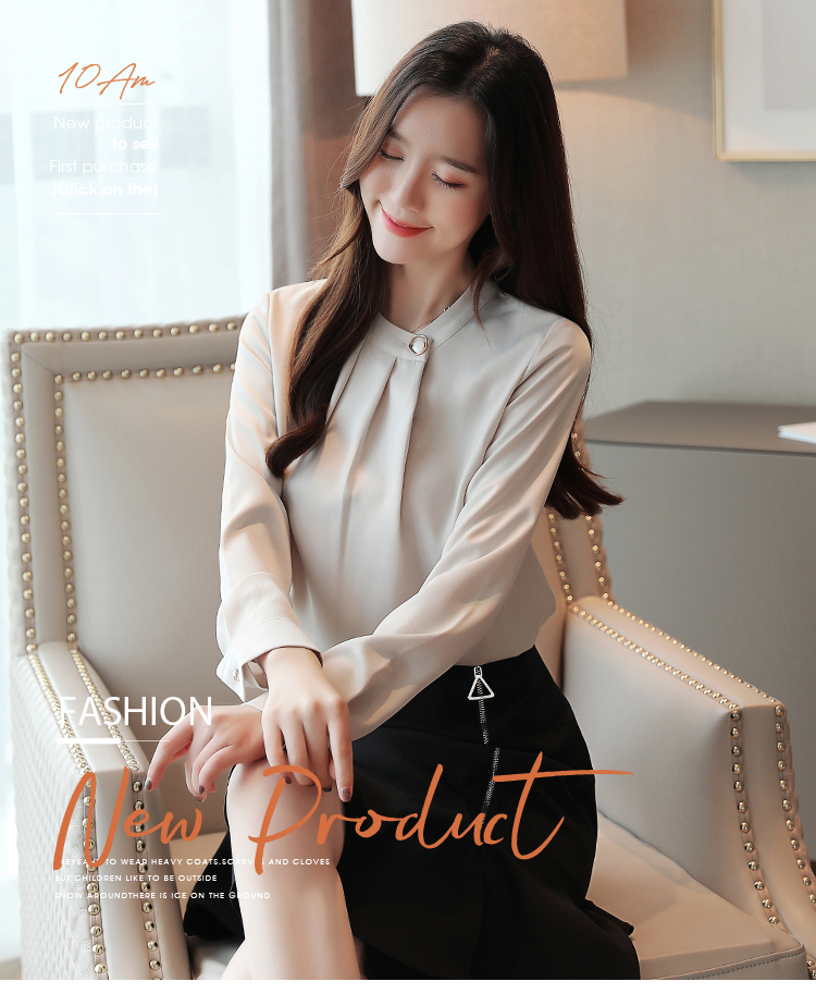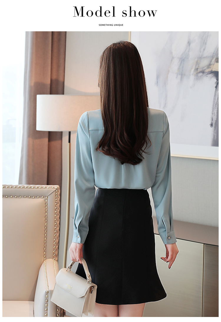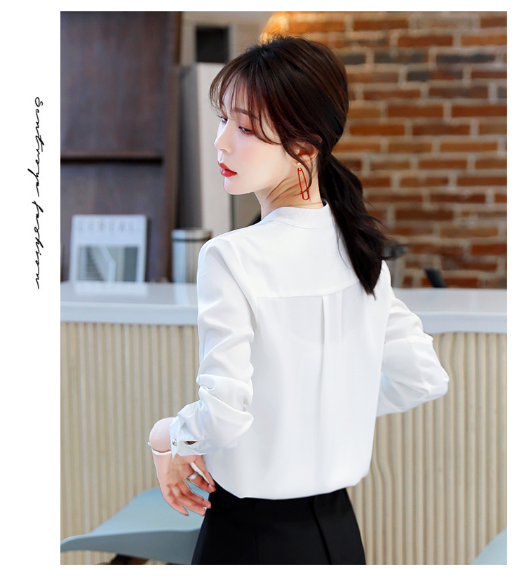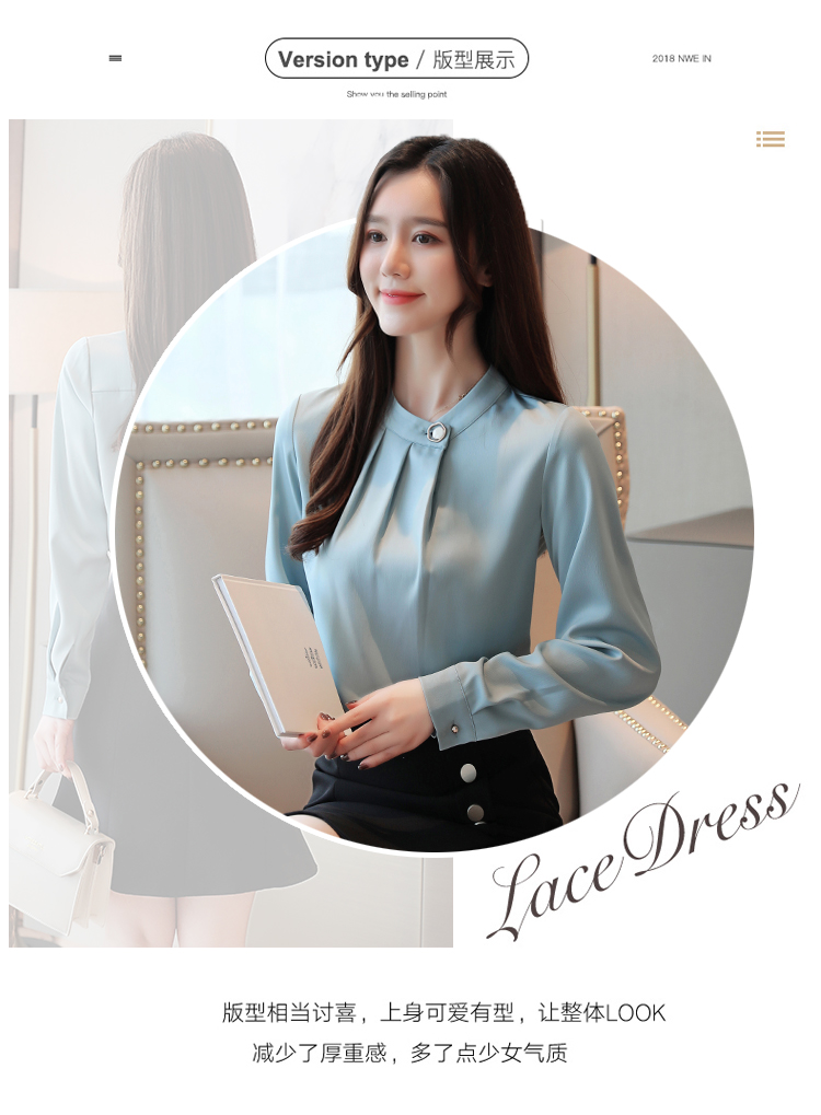 2026년 봄 시즌 전문 여성 셔츠의 실제 사진입니다. 독특한 한국 스타일의 긴팔 새틴 시폰 블라우스입니다.