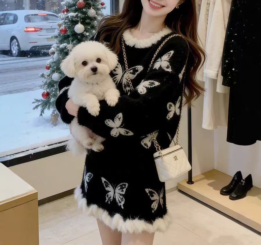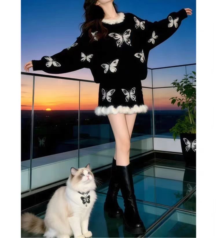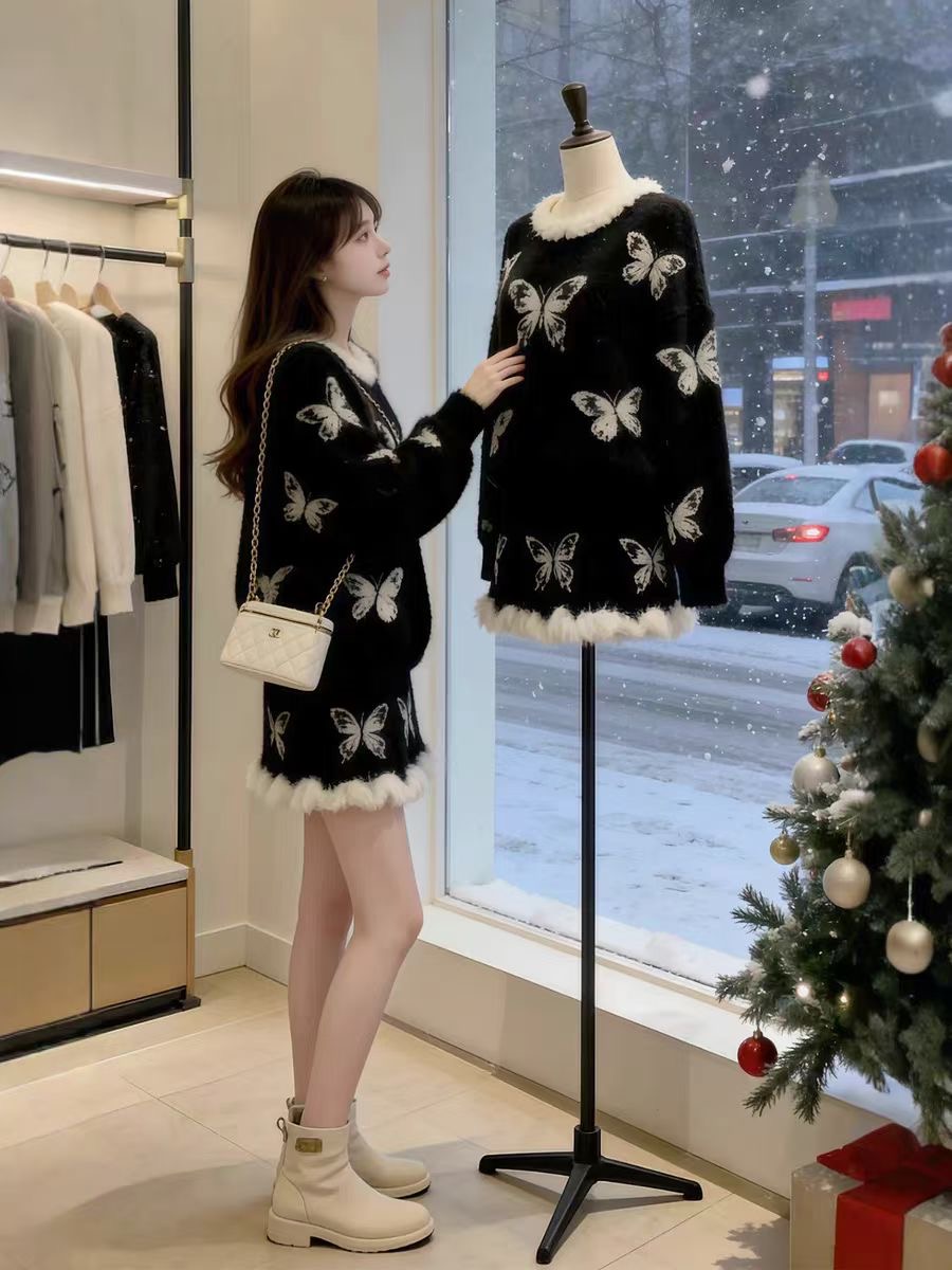 아담한 체형의 여성을 위한 가을/겨울용 우아한 스타일의 투피스 세트: 세련된 리본 장식 니트 스웨터와 스커트로, 어려 보이고 날씬해 보이는 효과를 줍니다.