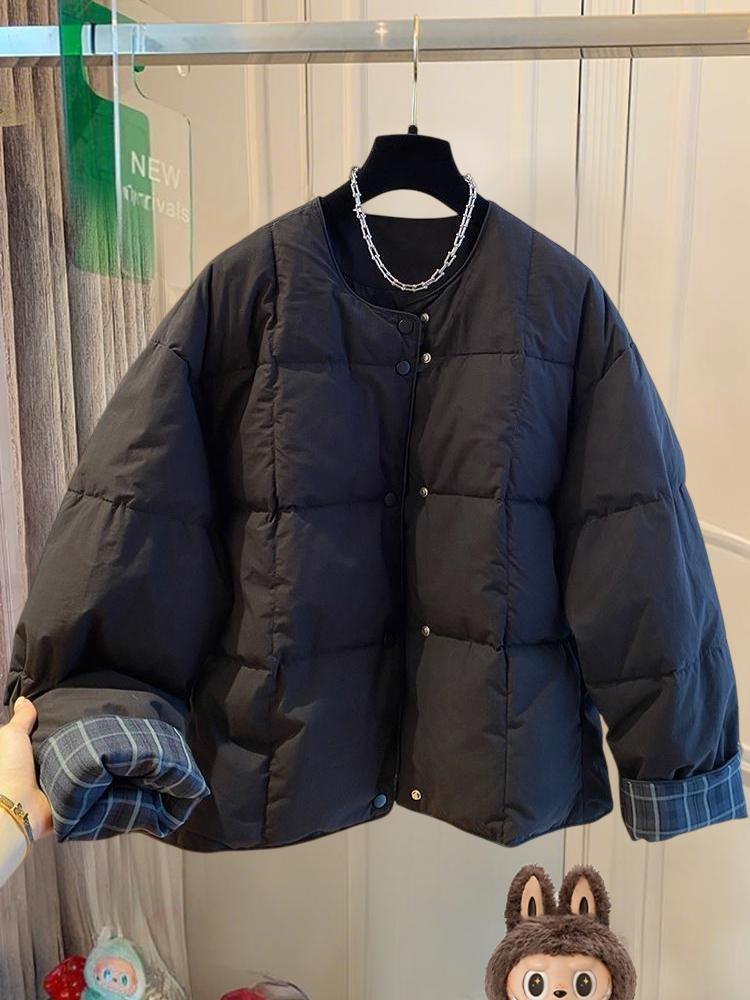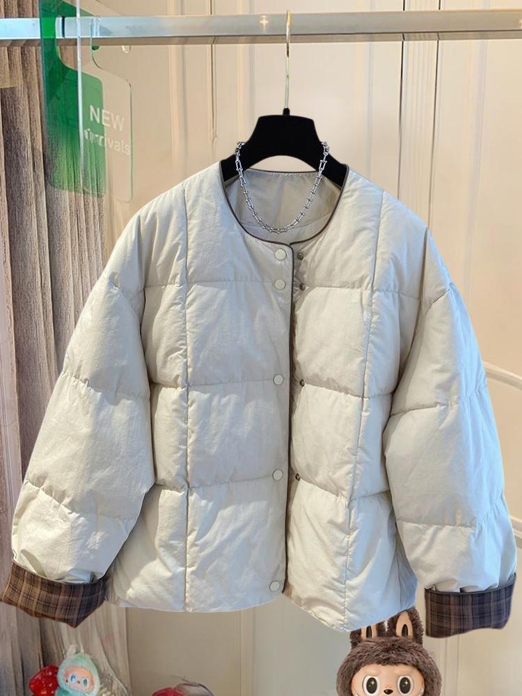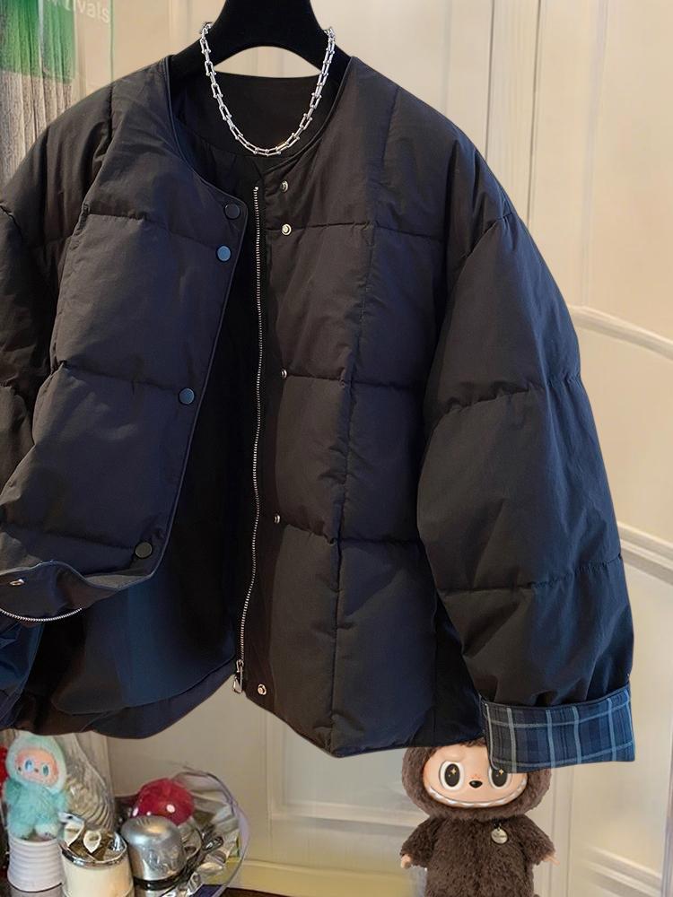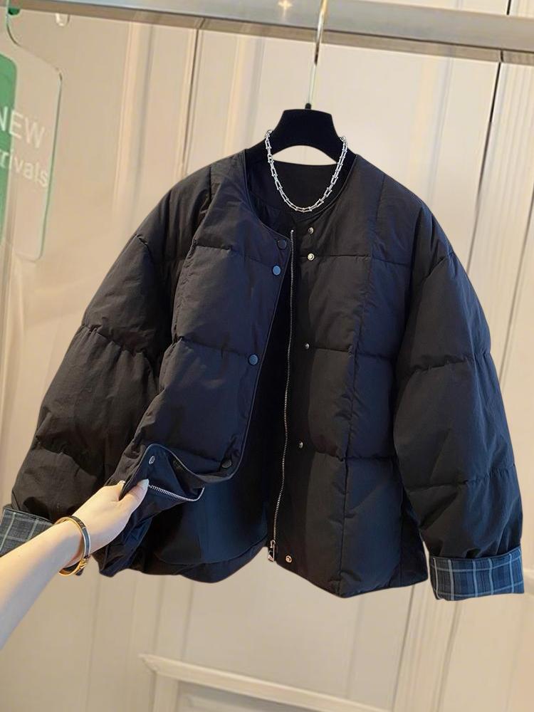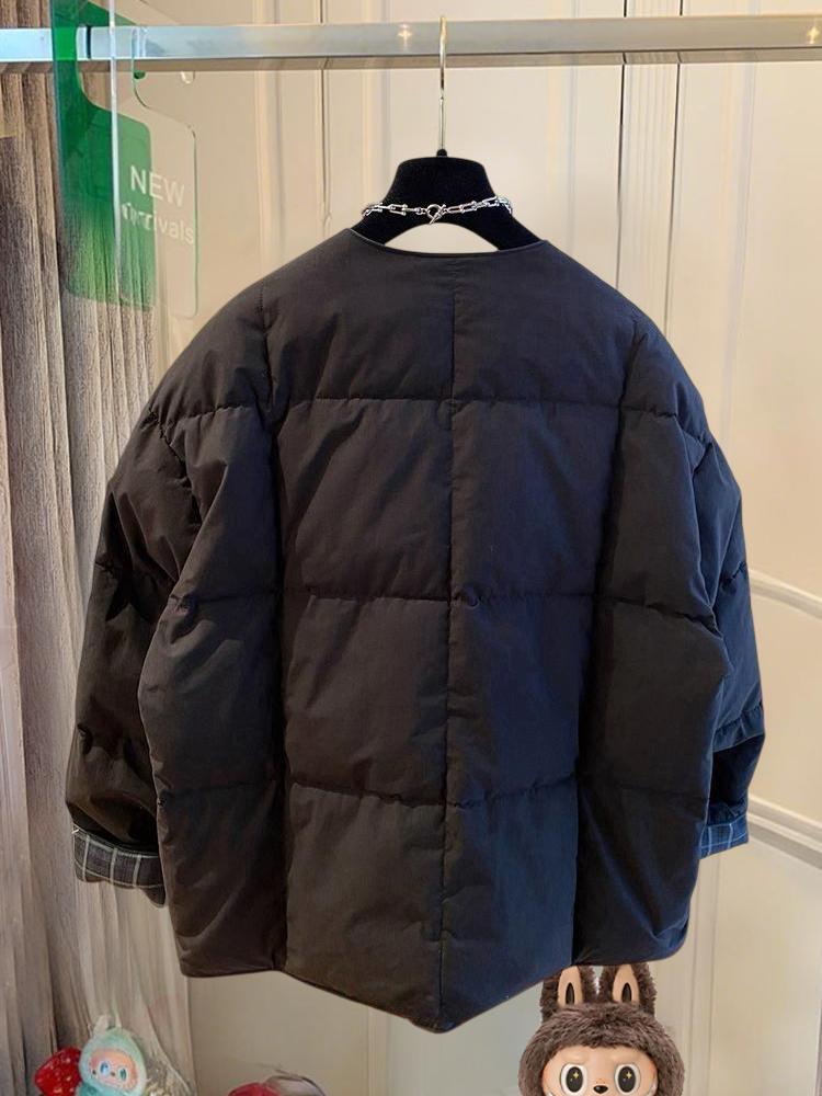 韩国韩版超好看无领棉服女冬季2025新款宽松格子拼接圆领夹棉外套