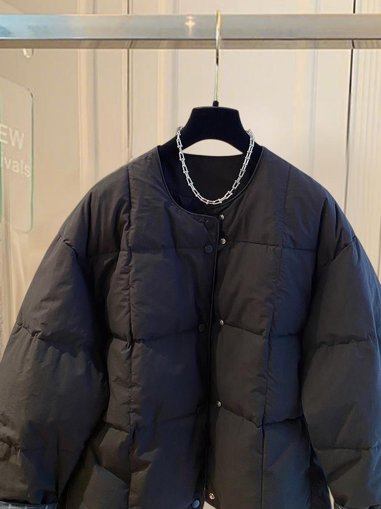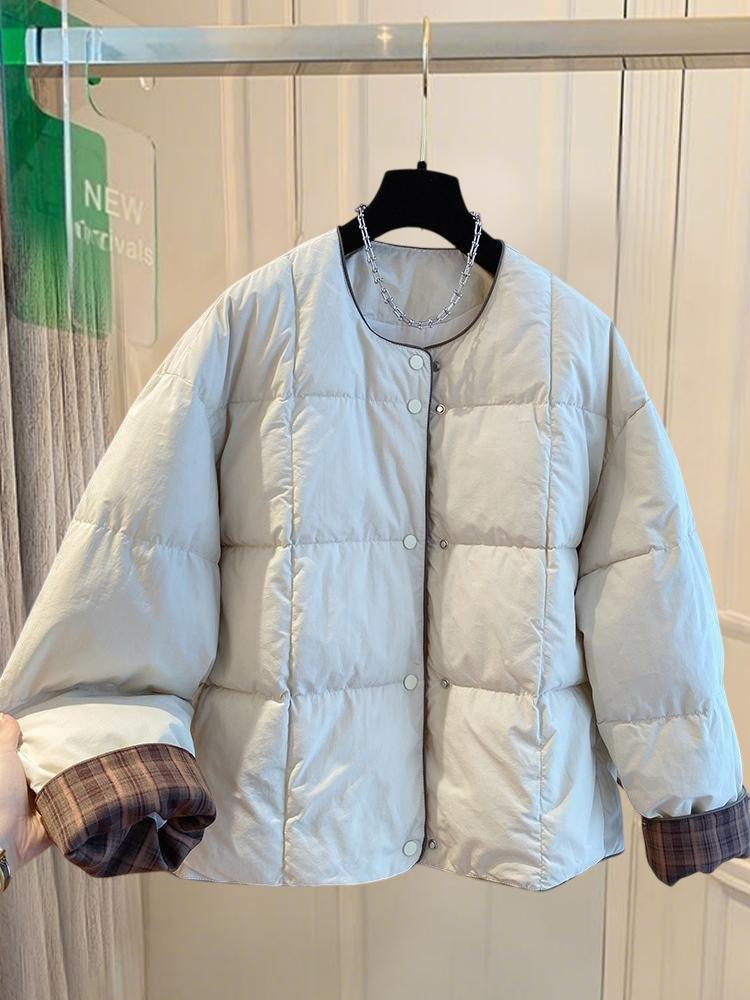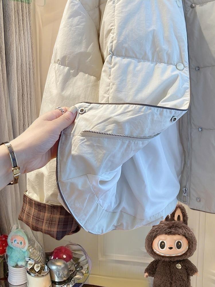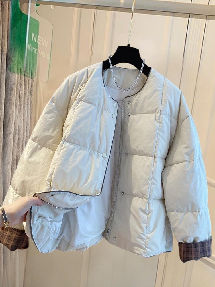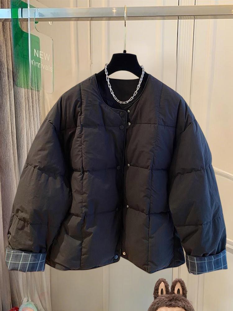 韩国韩版超好看无领棉服女冬季2025新款宽松格子拼接圆领夹棉外套