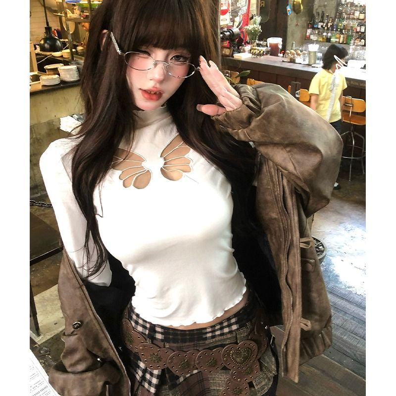 螺纹徳绒蝴蝶结镂空长袖t恤女早秋纯欲辣妹短款半高领打底衫