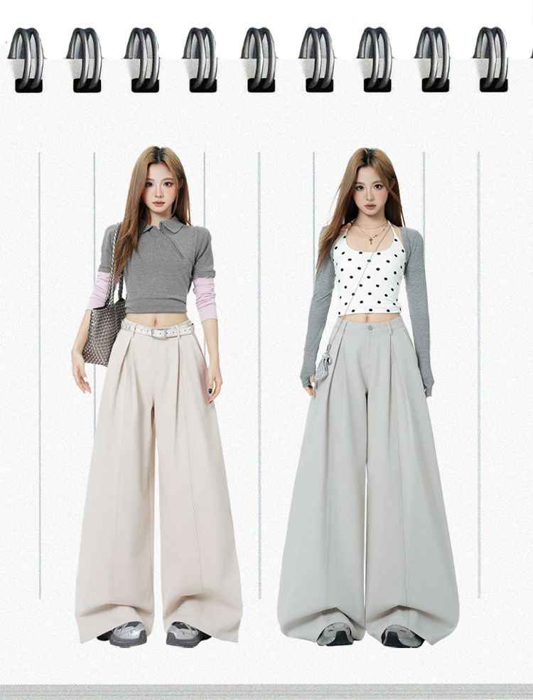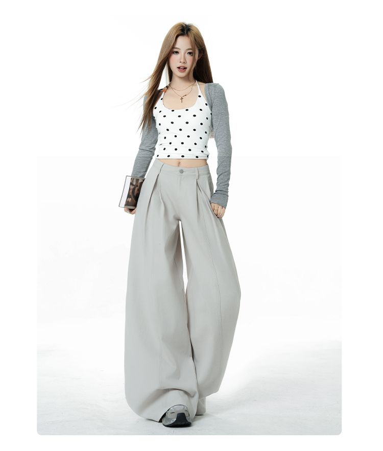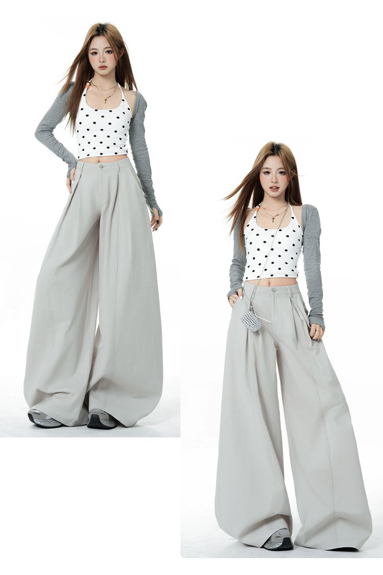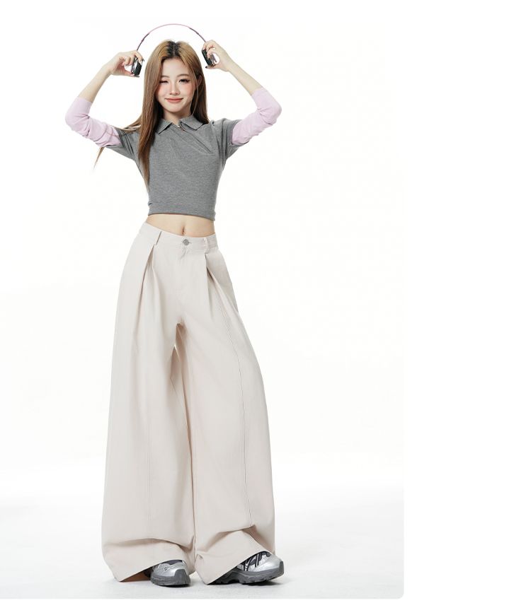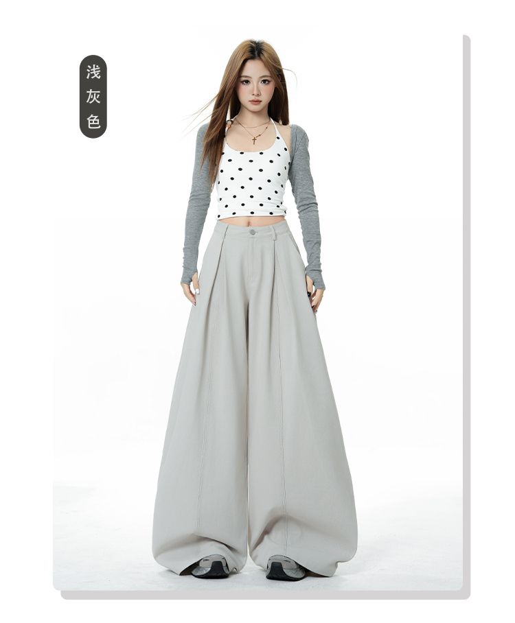 新款米白色美式复古立体褶皱直筒牛仔裤女宽松阔腿长裤