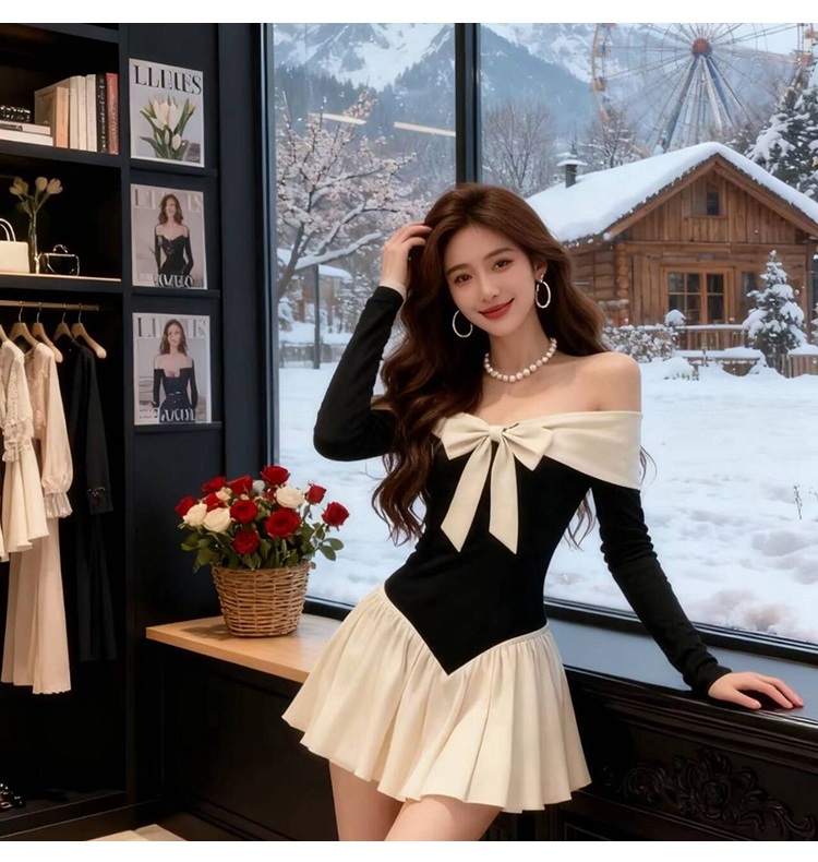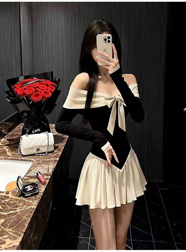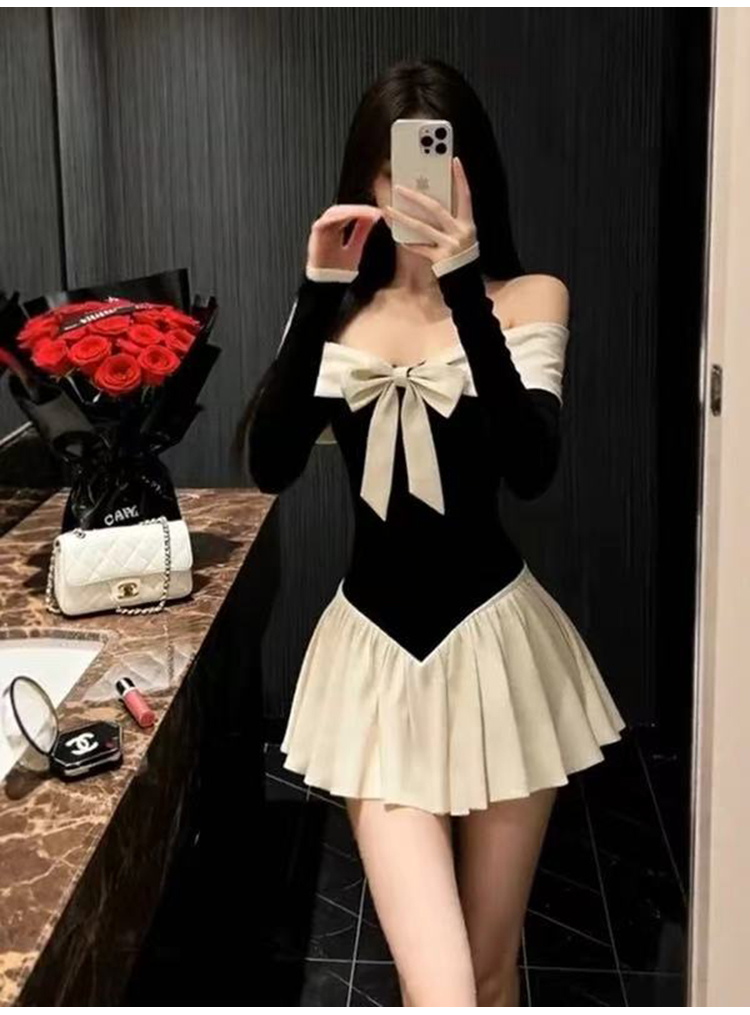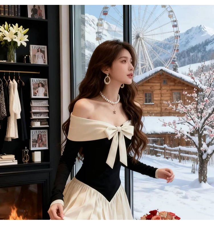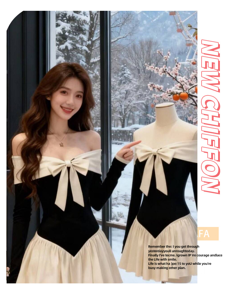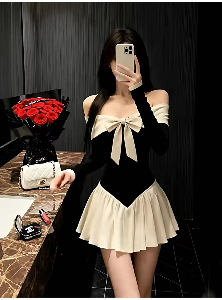 实拍:高级感甜美风一字肩连衣裙秋冬生日礼服蝴蝶结收腰A字裙气质