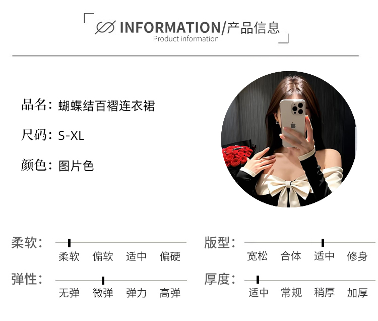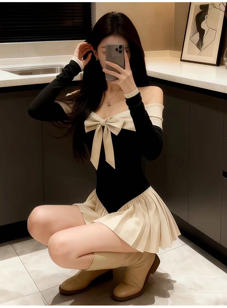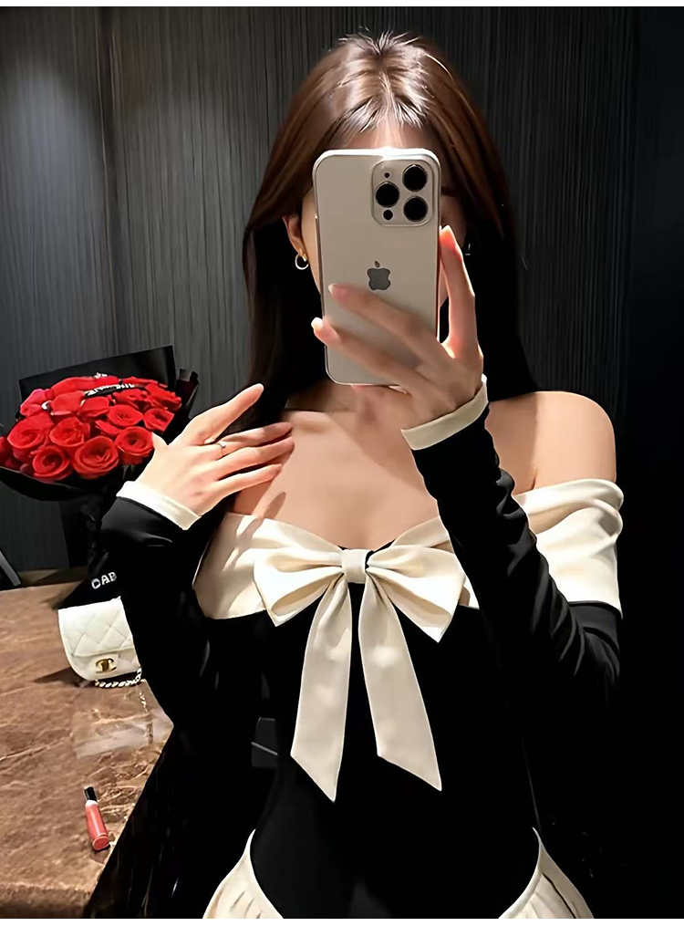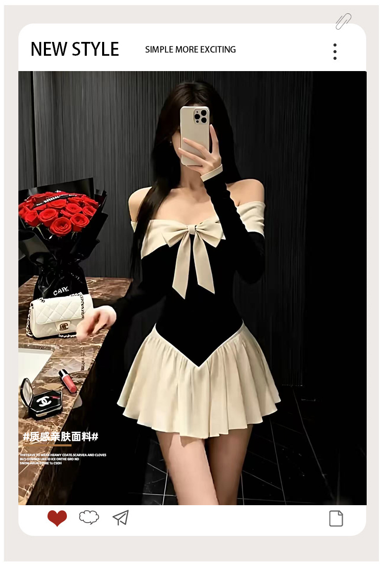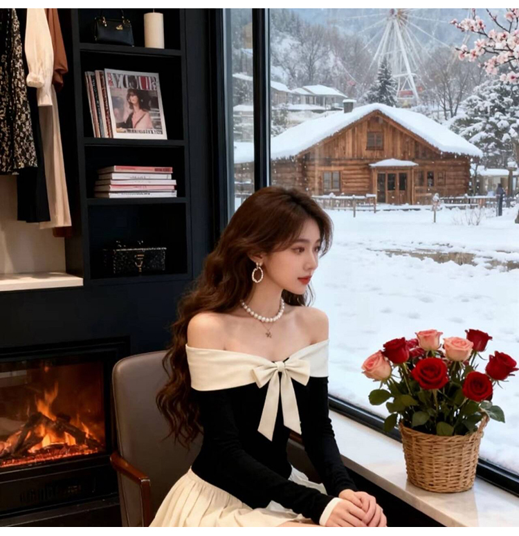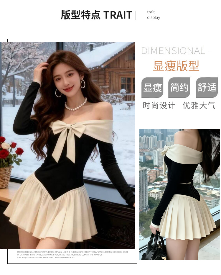 实拍:高级感甜美风一字肩连衣裙秋冬生日礼服蝴蝶结收腰A字裙气质