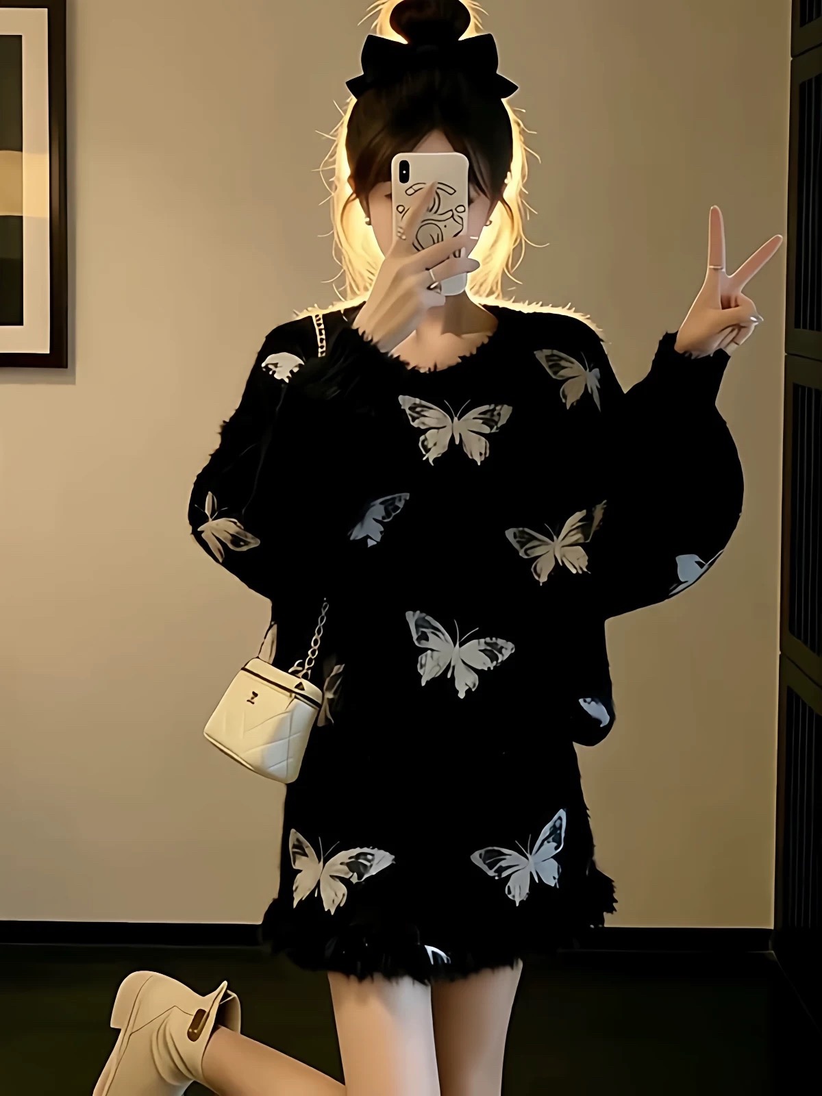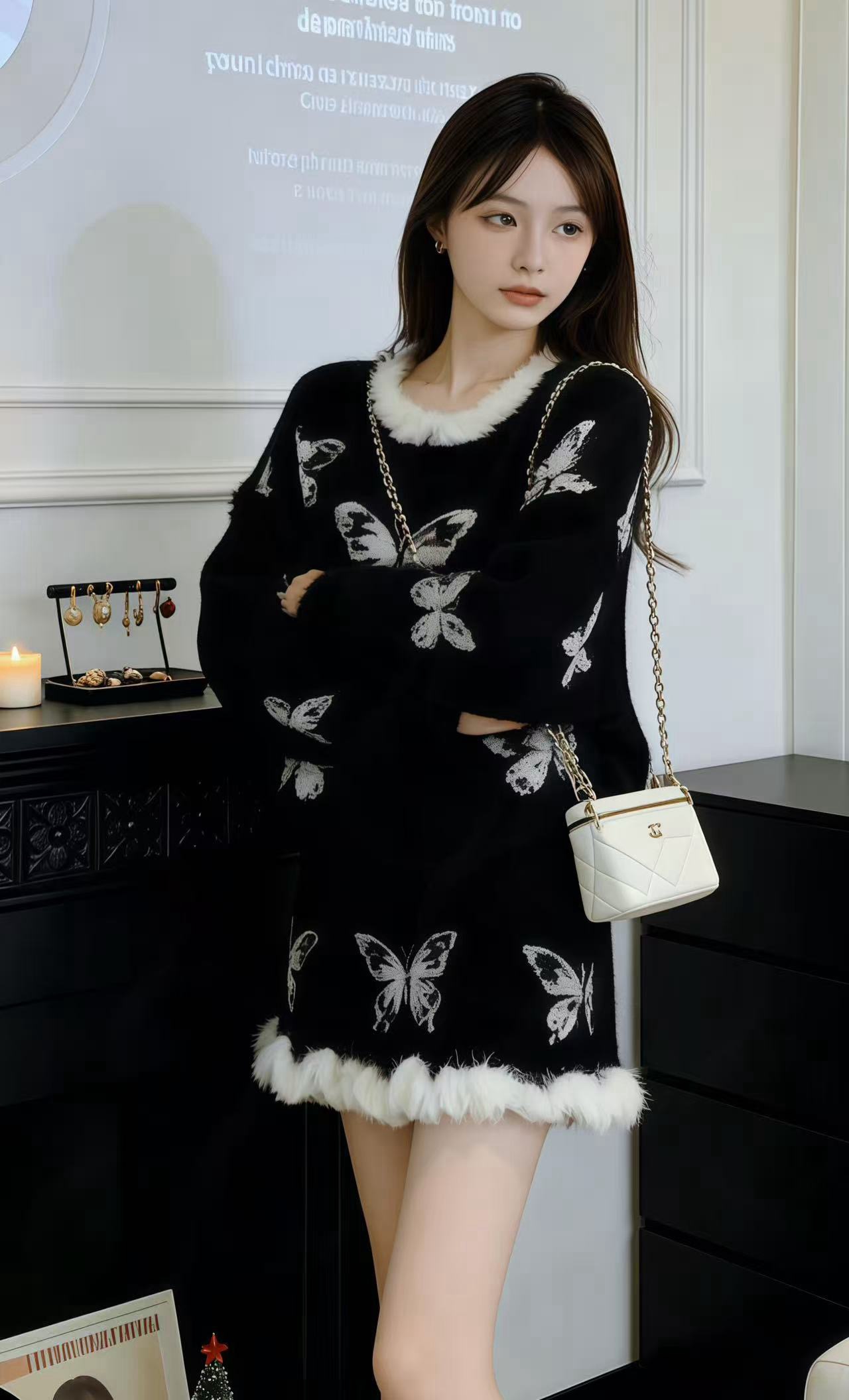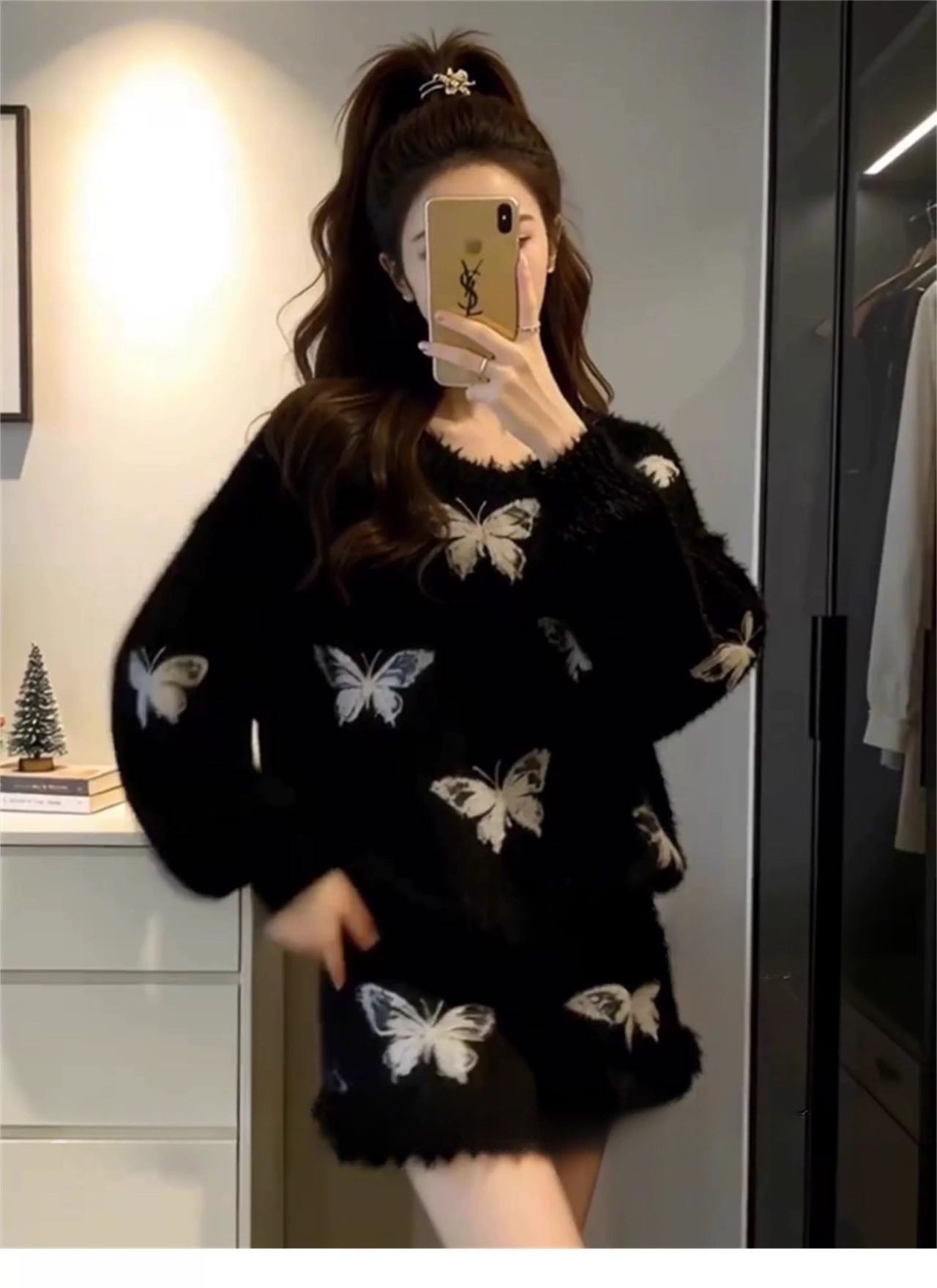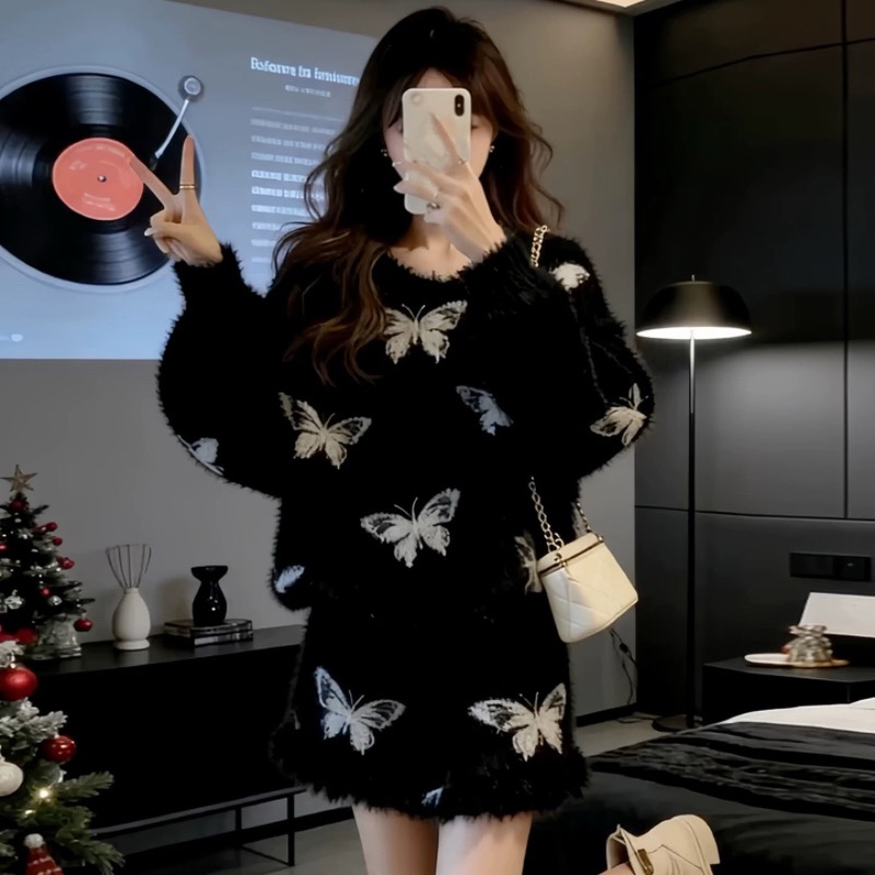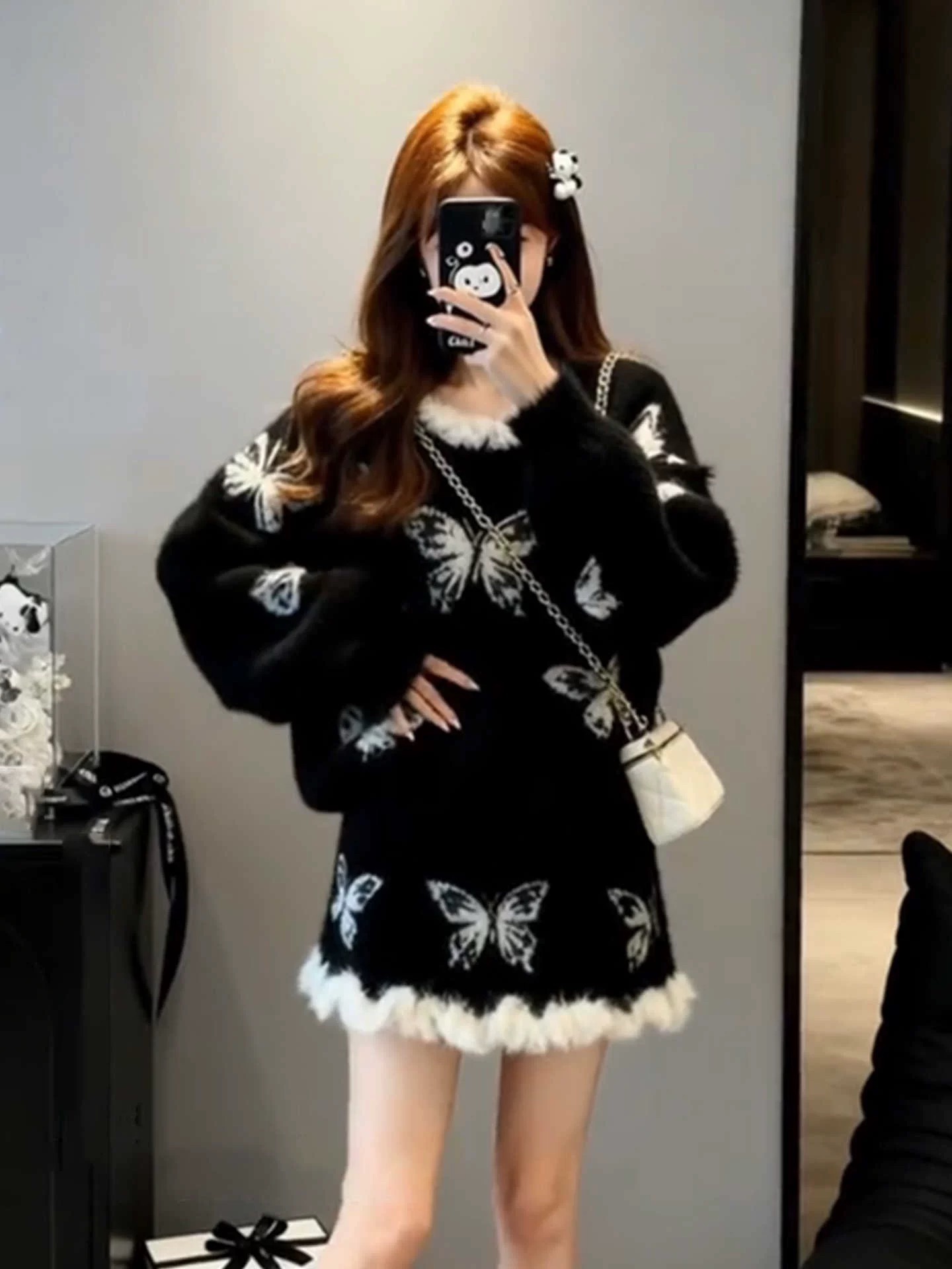 韩风chic一整套温柔风巨好看复古黑色针织衫短裙两件套装2025冬季