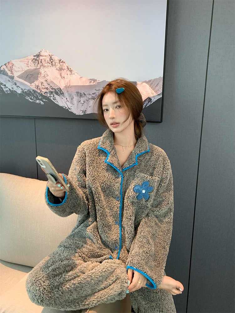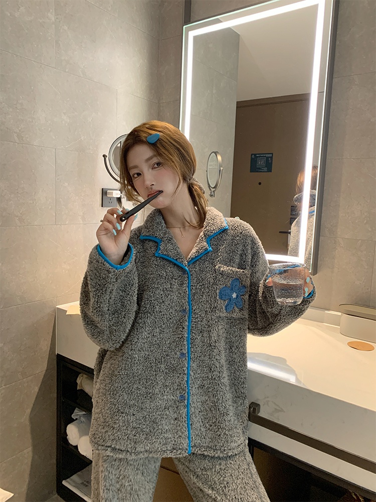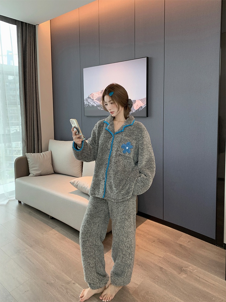 灰蓝小花珊瑚绒睡衣女秋冬季休闲宽松保暖加绒半边绒家居服官方