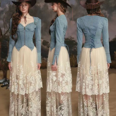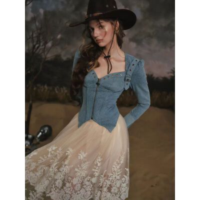 LaceMade 丹宁骑士 法式牛仔设计感蓝色长袖鱼骨上衣百搭修身外套