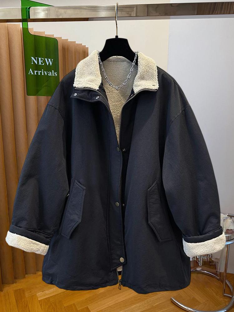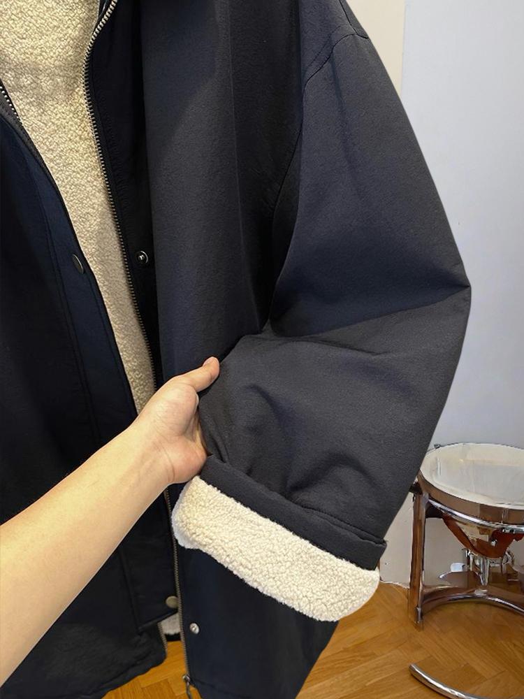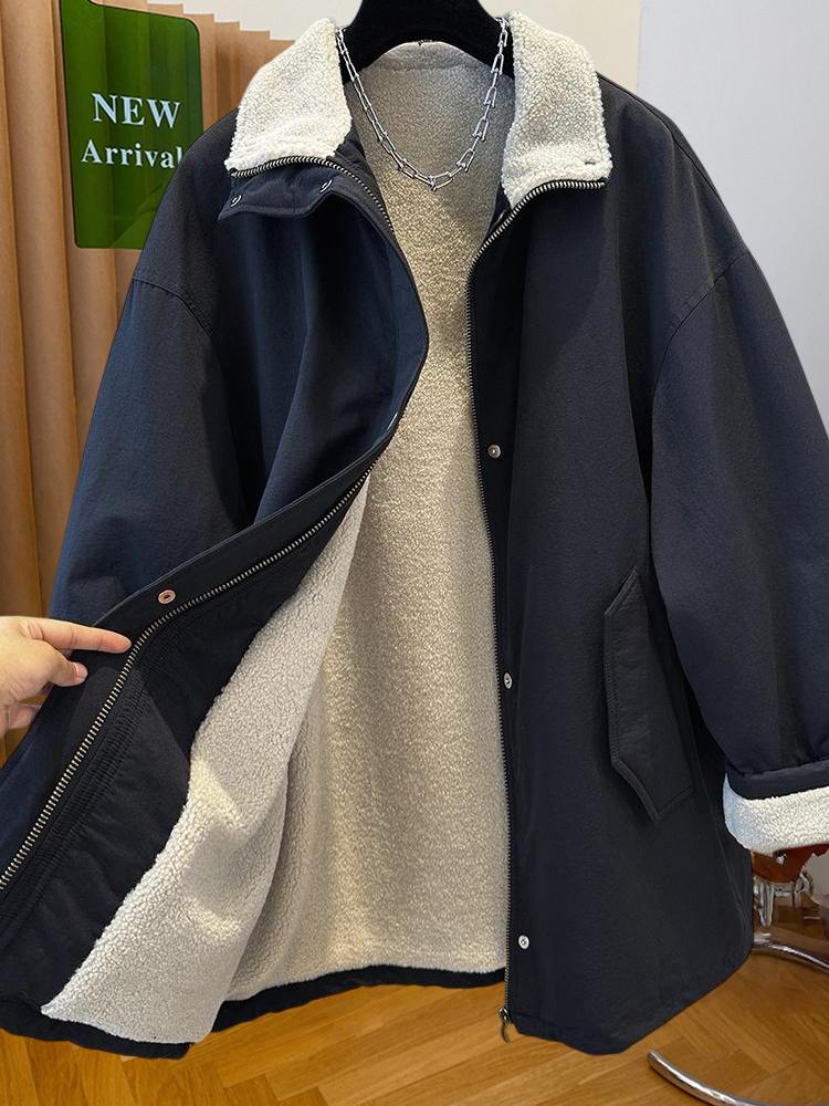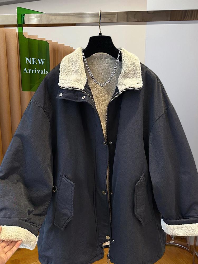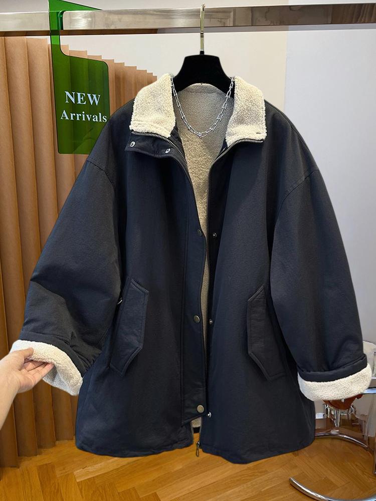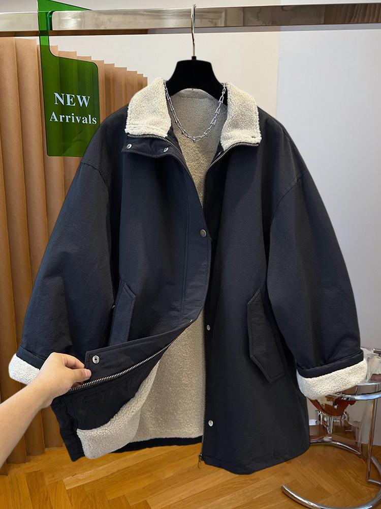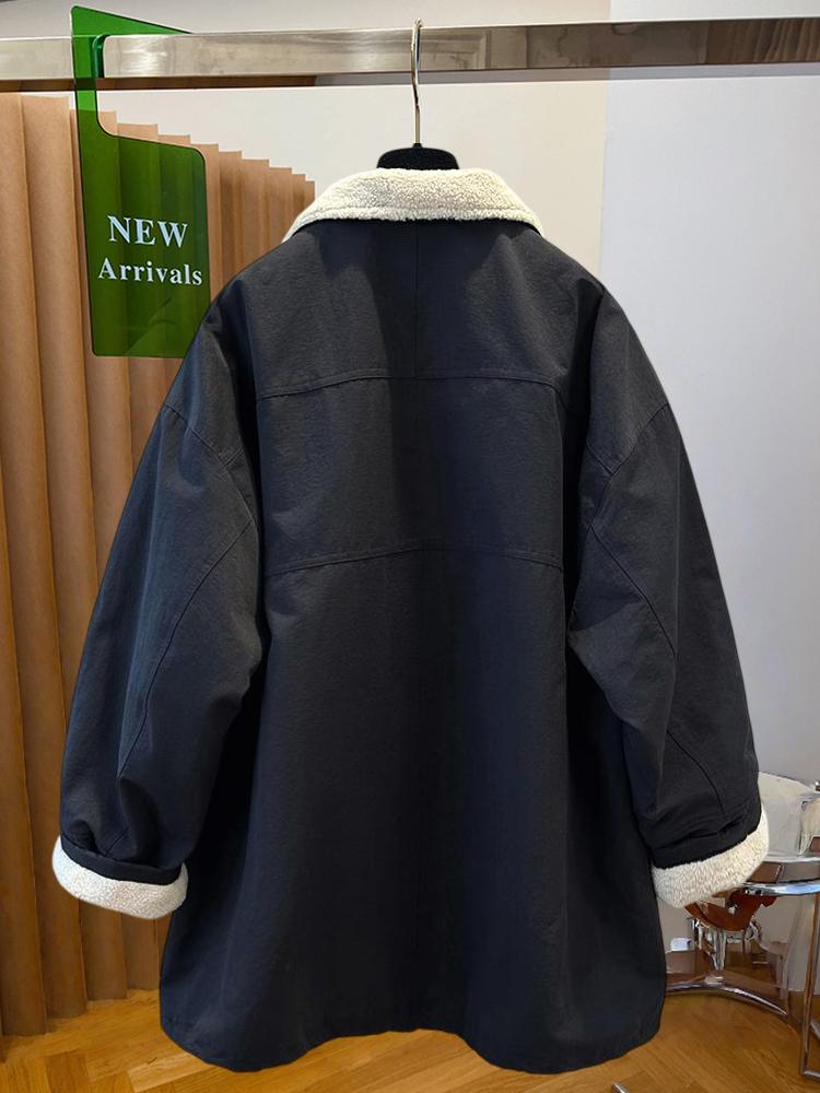 高级感黑色毛茸茸翻领中长款工装外套女加绒加厚宽松2025冬季新款