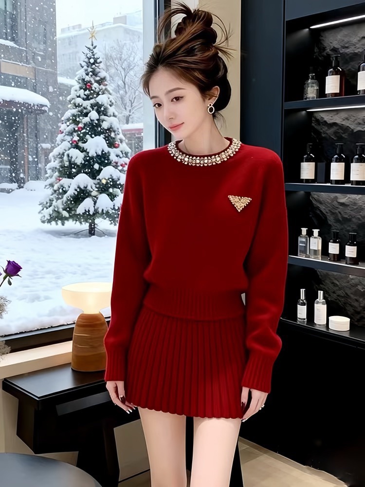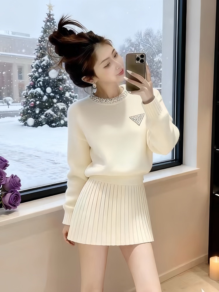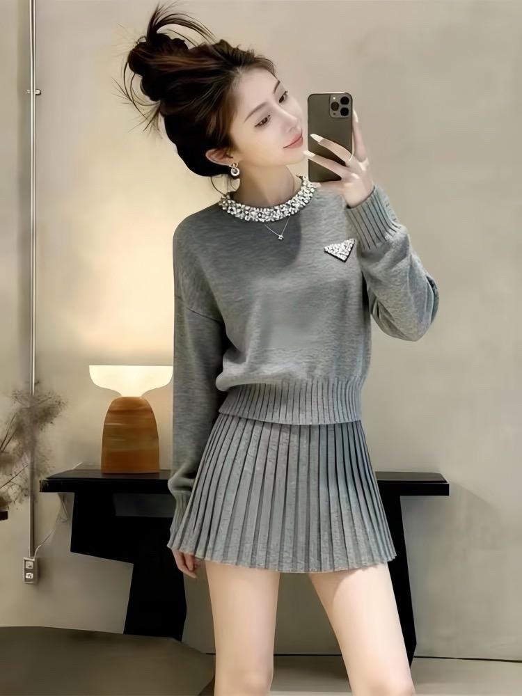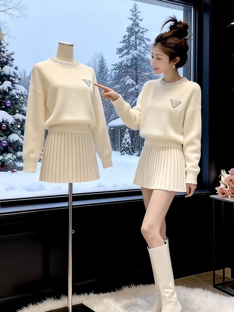 韩系绝美套装2025冬装一整套圆领装饰小个子针织毛衣百褶裙套装女