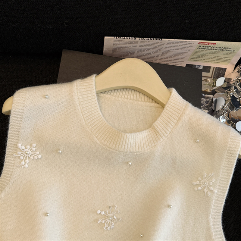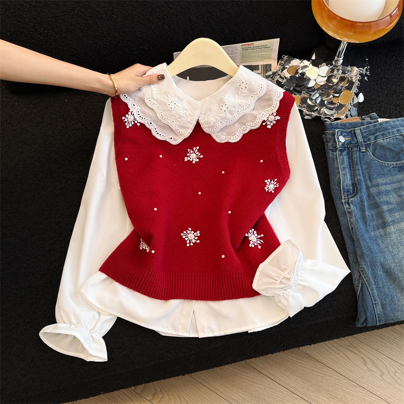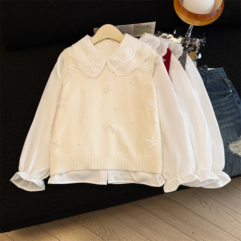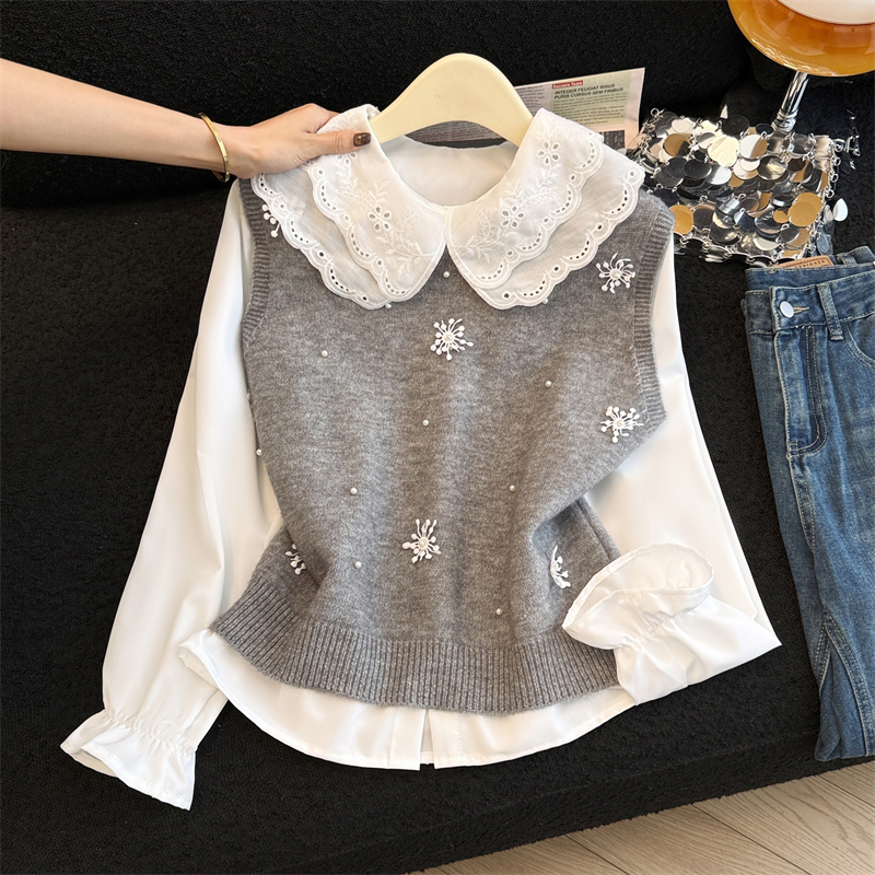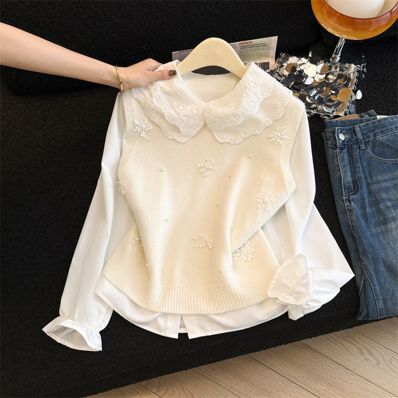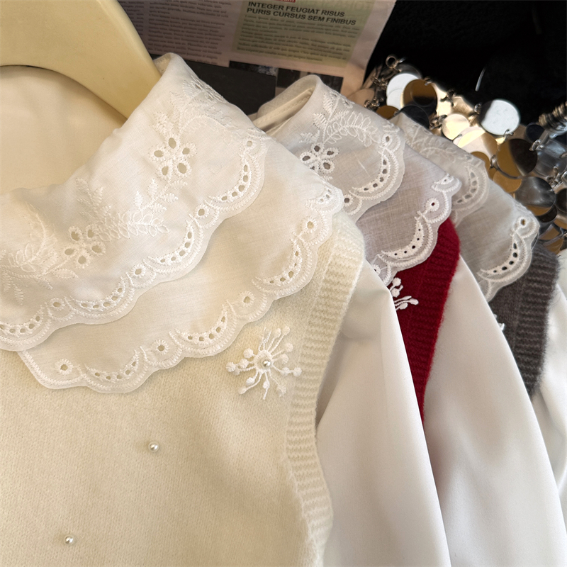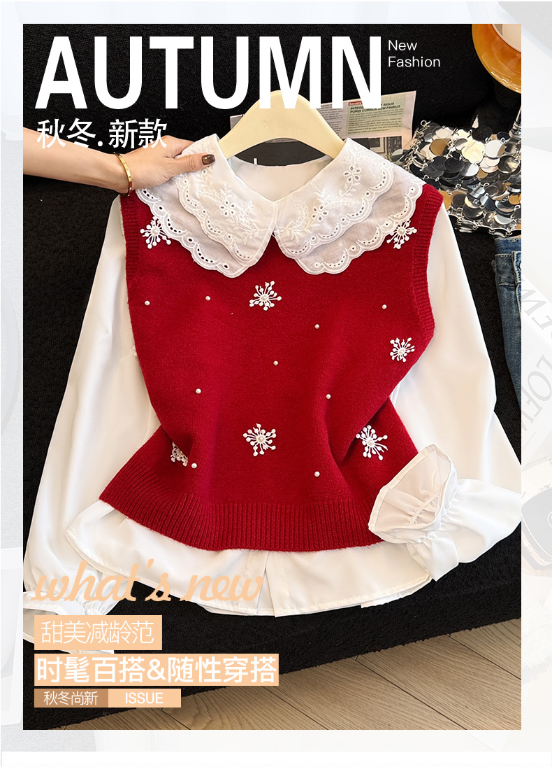 레이어드 디자인의 니트 조끼와 셔츠 투피스 세트, 그리고 민소매 스웨터 조끼의 실제 사진입니다.
