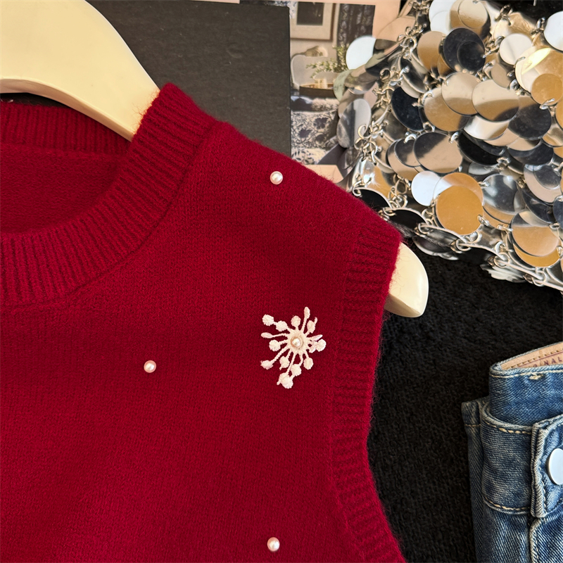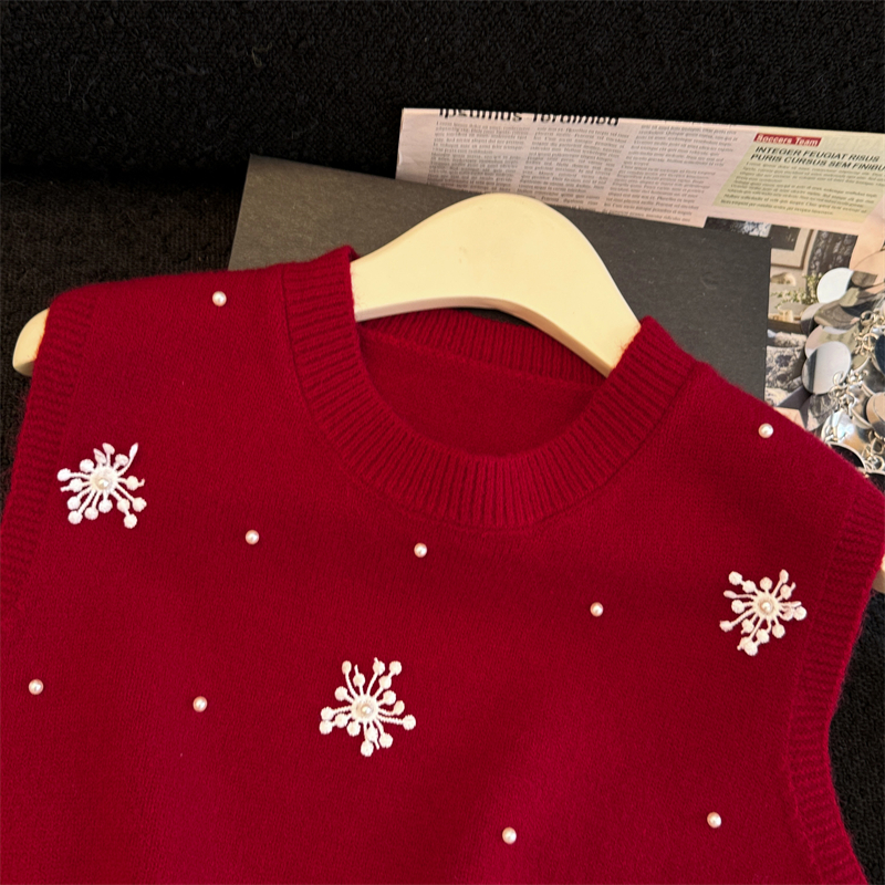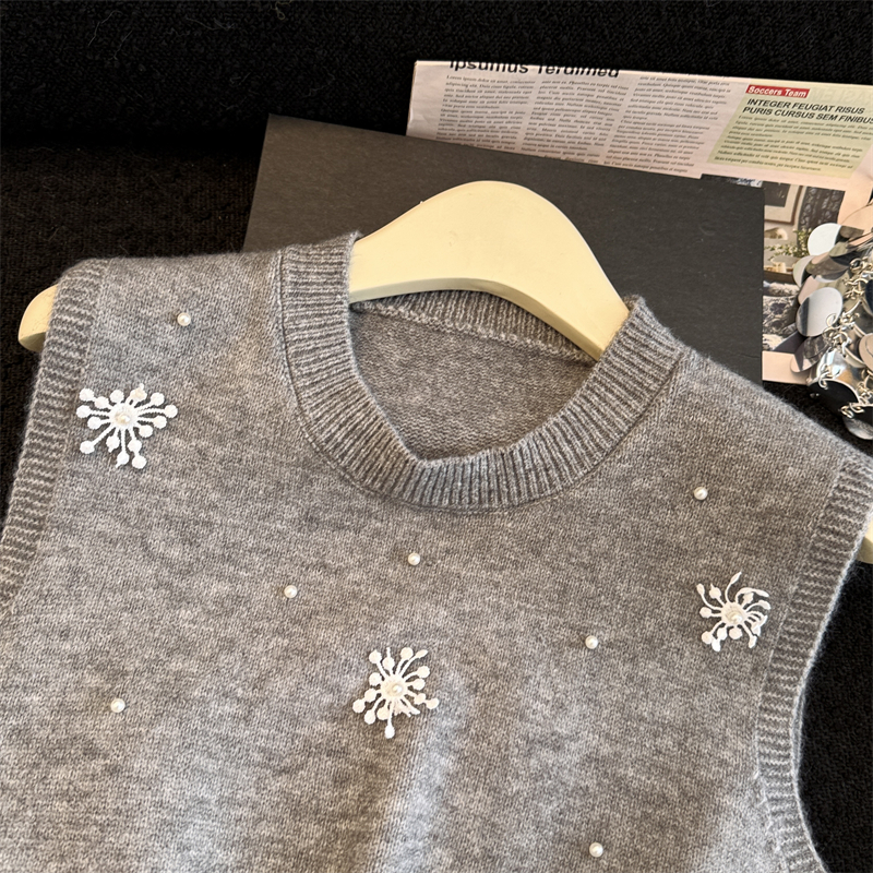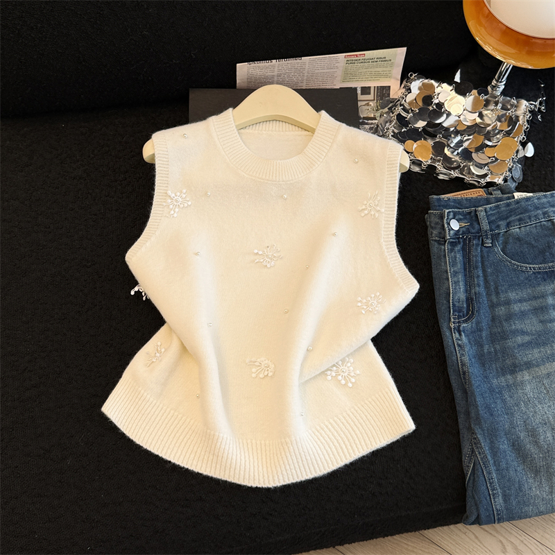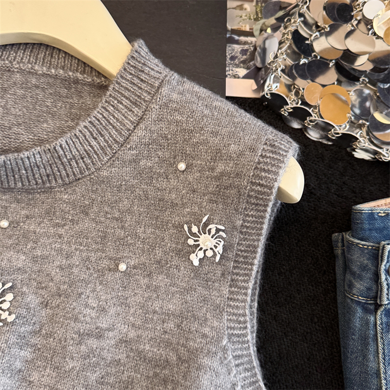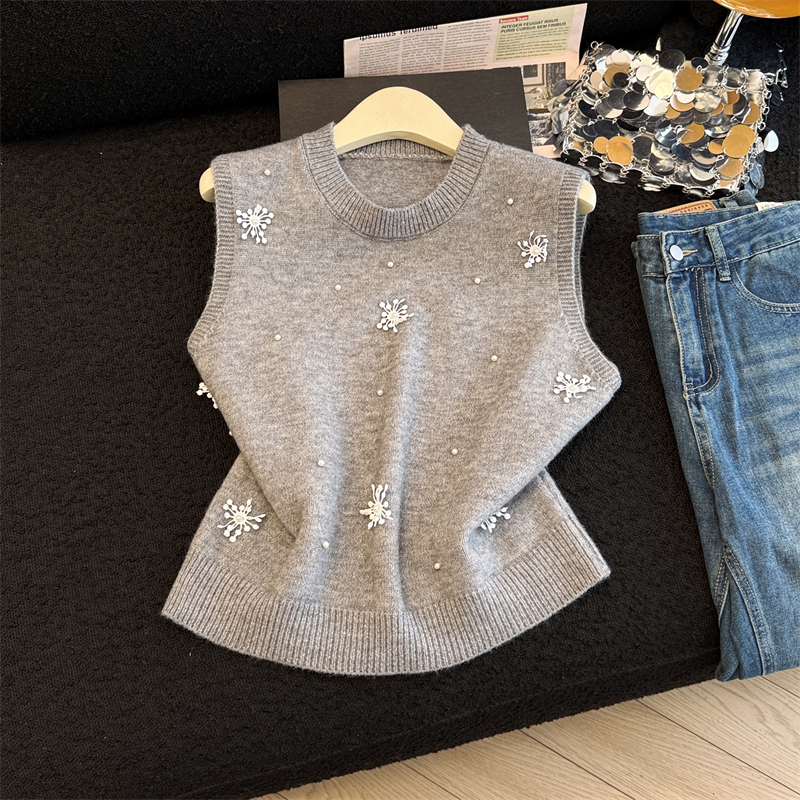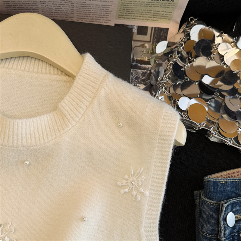 레이어드 디자인의 니트 조끼와 셔츠 투피스 세트, 그리고 민소매 스웨터 조끼의 실제 사진입니다.