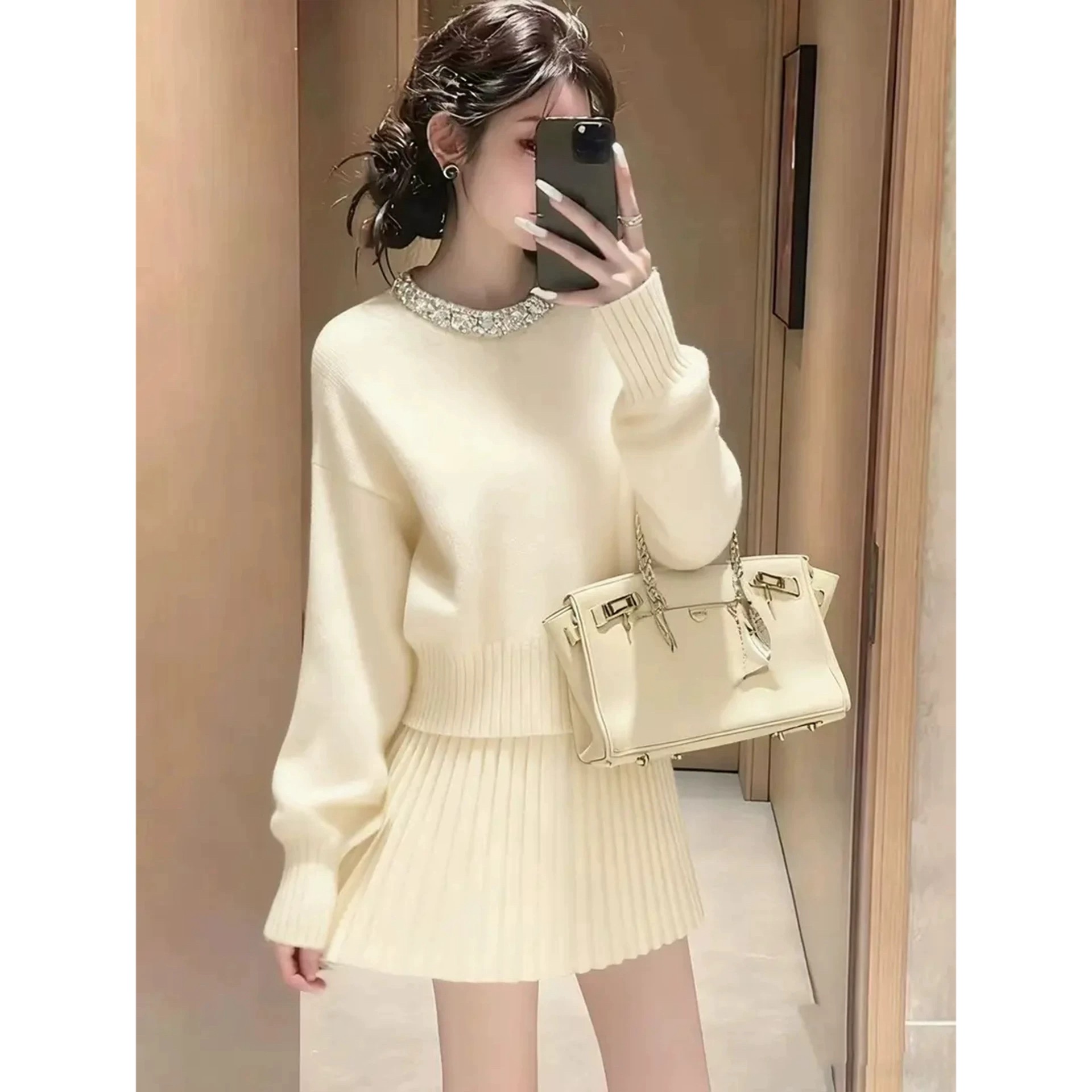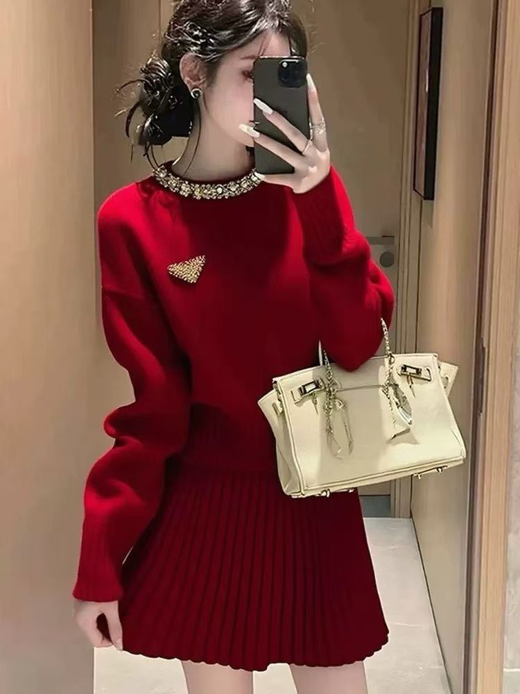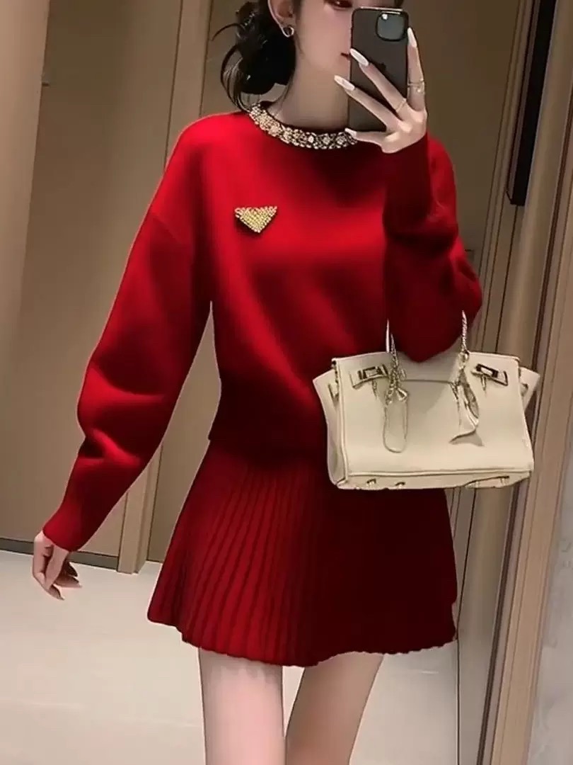 샤넬에서 영감을 받은 여성용 레드 니트 투피스 세트, 2025 가을/겨울 신상 스타일로 스웨터와 스커트로 구성된 세련된 디자인이 특징입니다.