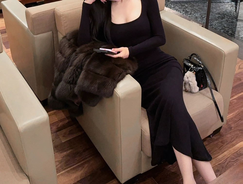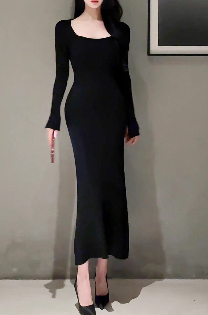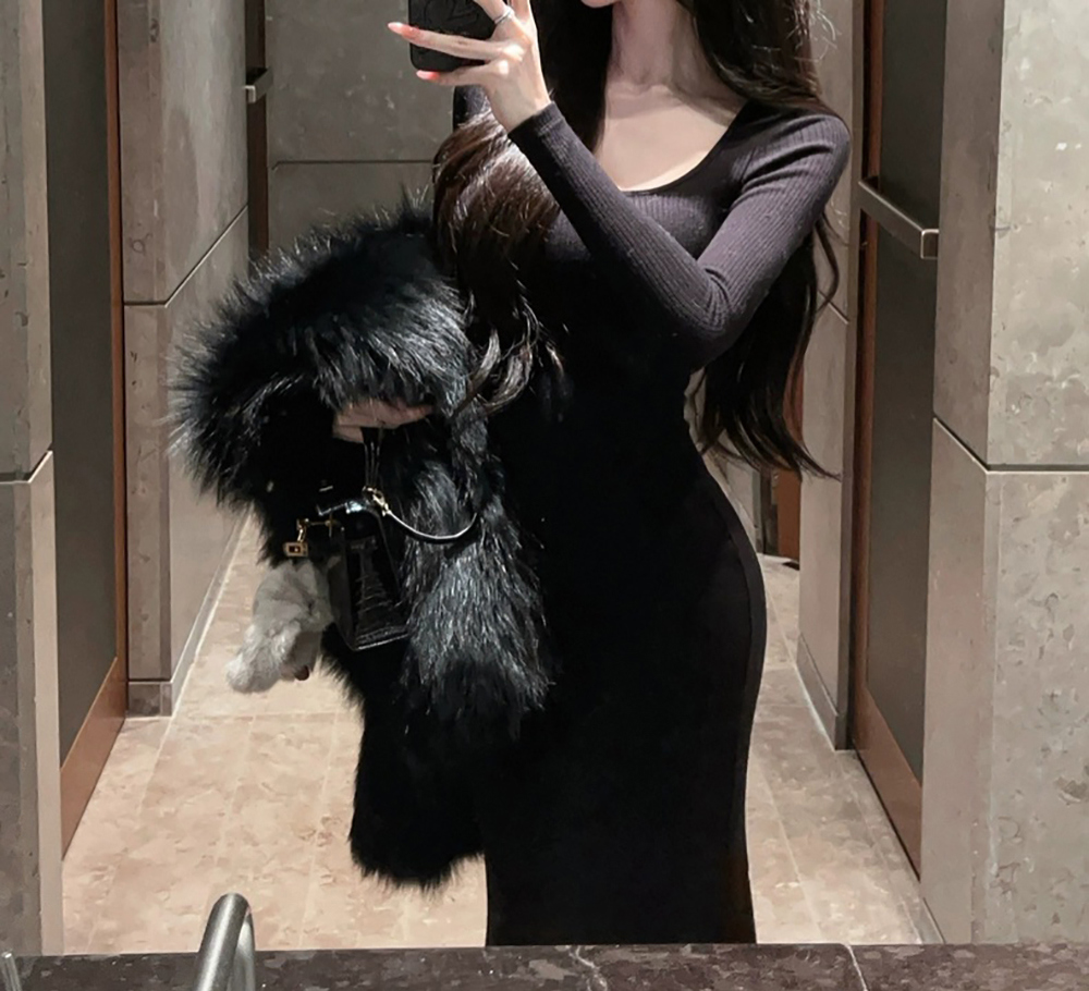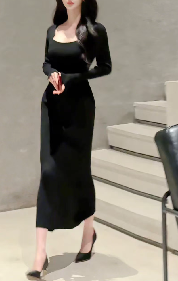 韩系秋冬必入黑色内搭u领打底裙修身显瘦包臀针织连衣裙女